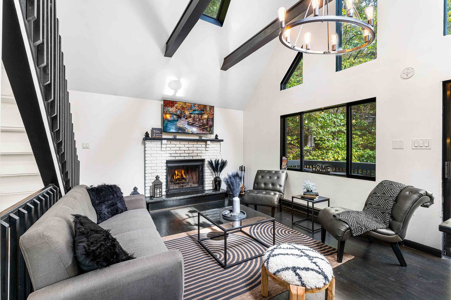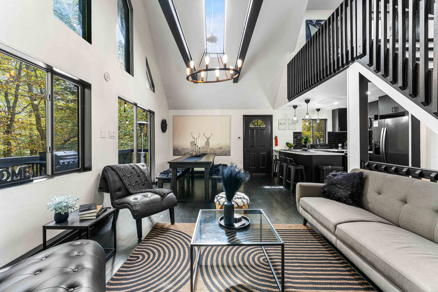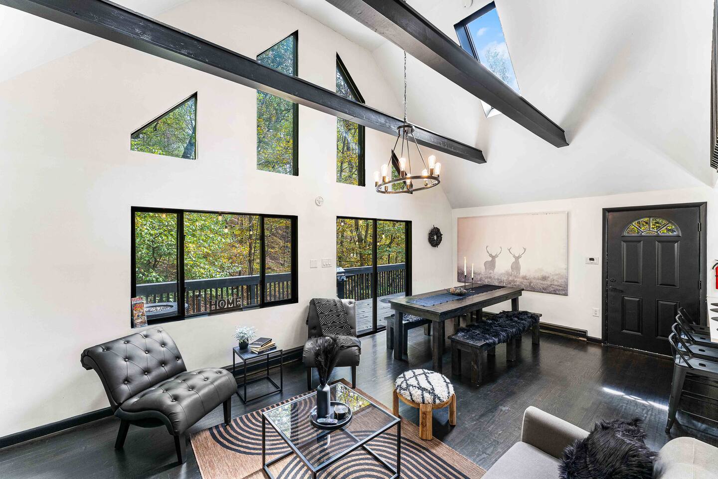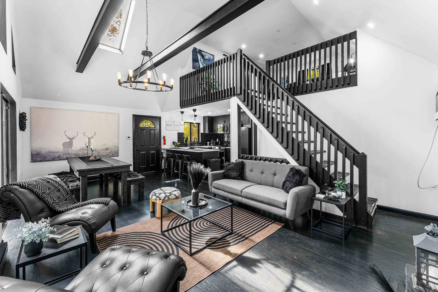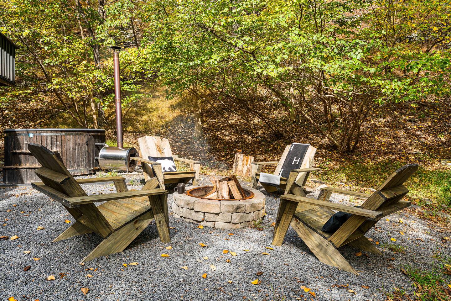 True mountain escape with designer finishes and high end appliances. The Cabin is situated near Bushkill Falls surrounded by a creek accessible for kayaking and fishing. The house is suited for 6 people 2 queen bedrooms on the main level and King Loft on the upper level. Open kitchen plan that connects with the living space highlighted by a beautiful fireplace. Beautiful deck for entertaining with a fire pit. Only 20mins away from Shawnee Mountain & 24/7 Supermarket.