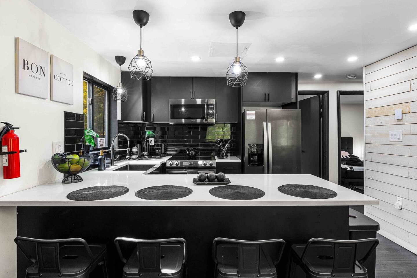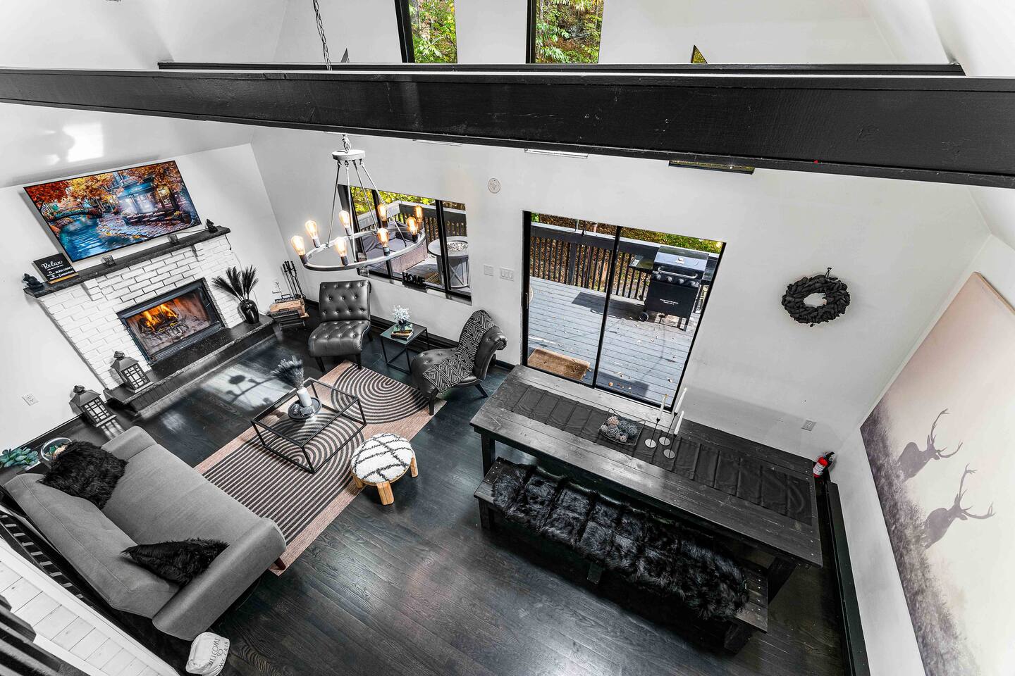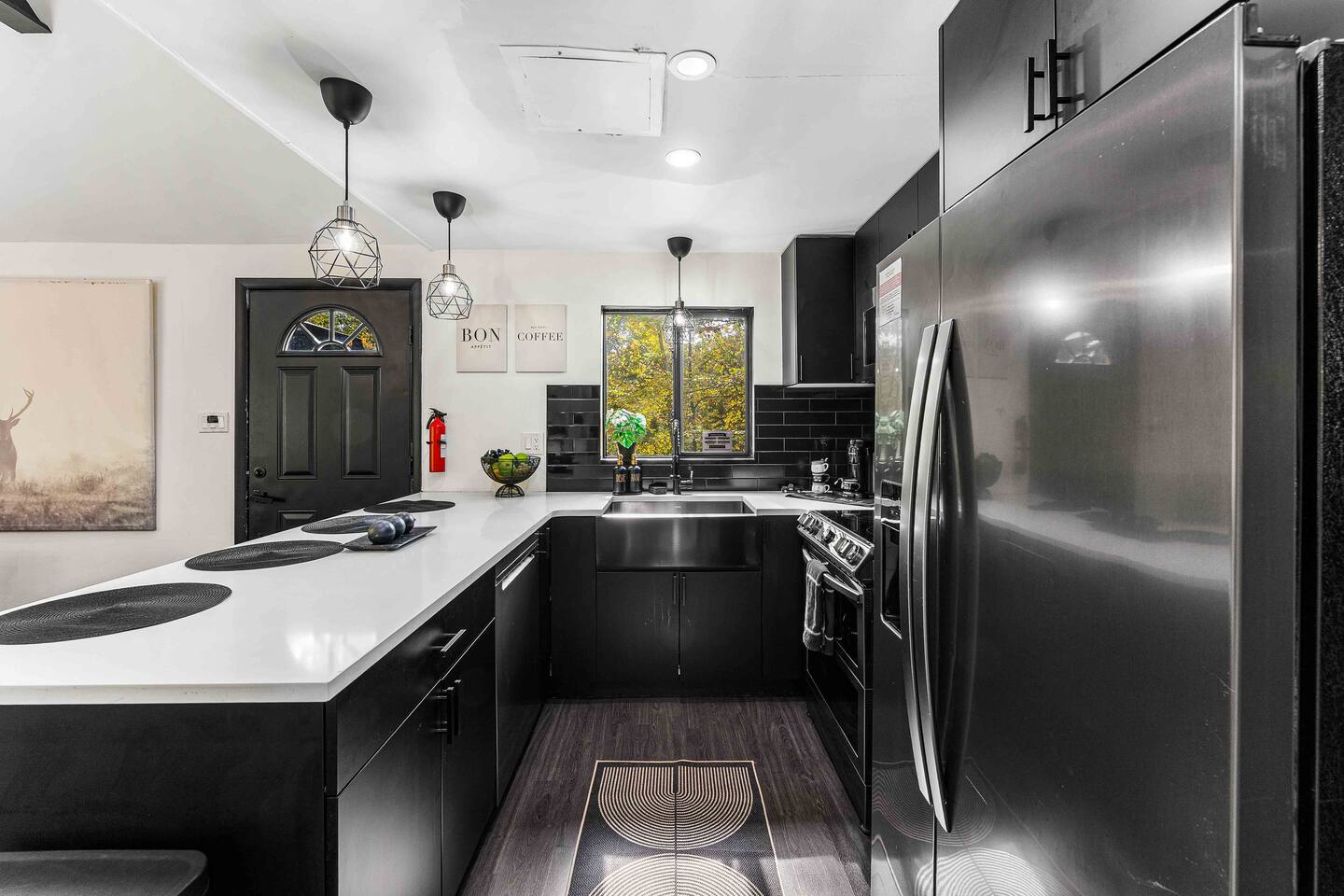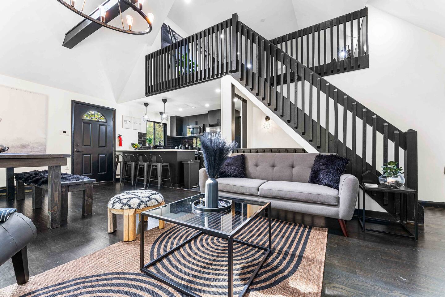 True mountain escape with designer finishes and high end appliances. The Cabin is situated near Bushkill Falls surrounded by a creek accessible for kayaking and fishing. The house is suited for 6 people 2 queen bedrooms on the main level and King Loft on the upper level. Open kitchen plan that connects with the living space highlighted by a beautiful fireplace. Beautiful deck for entertaining with a fire pit. Only 20mins away from Shawnee Mountain & 24/7 Supermarket.