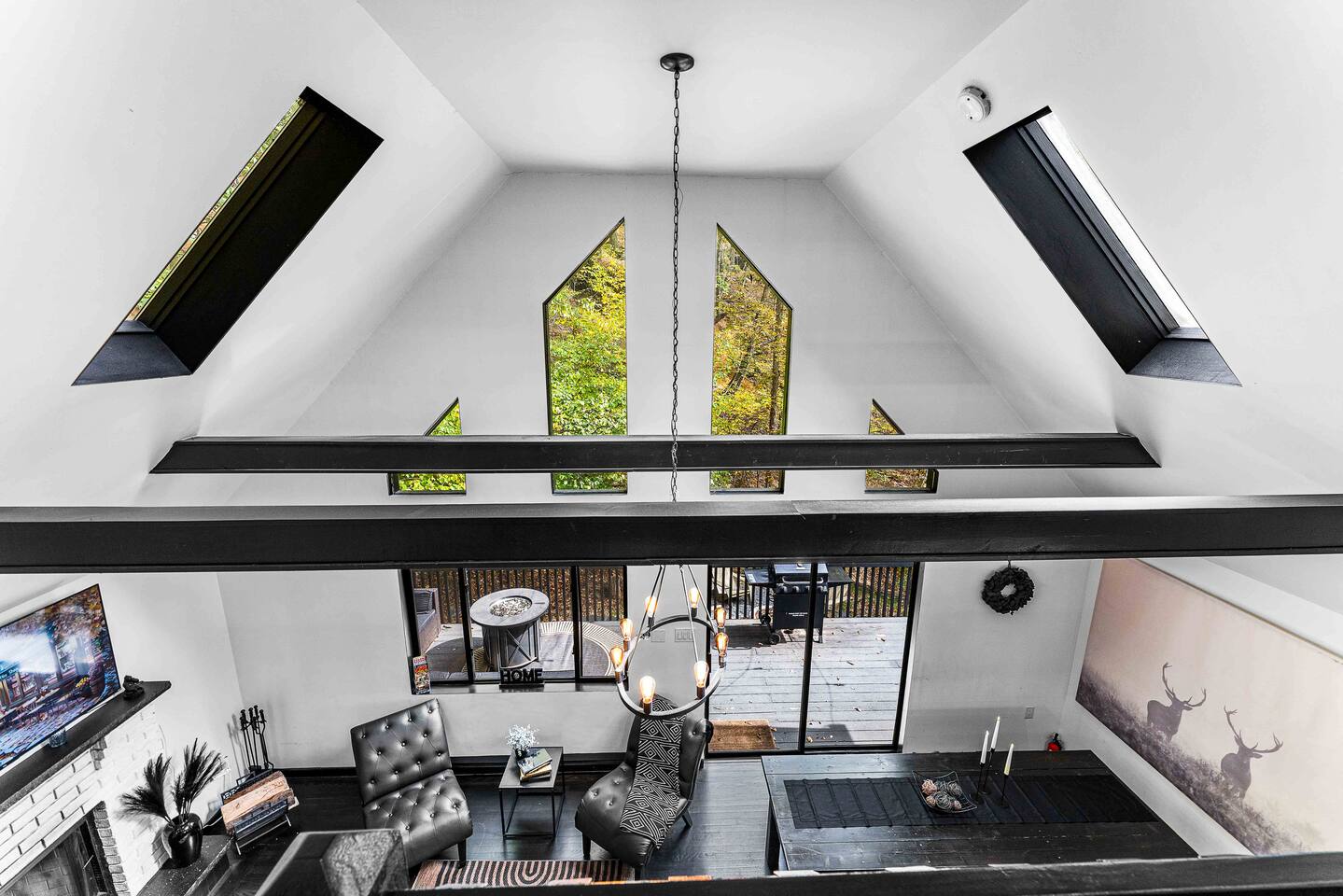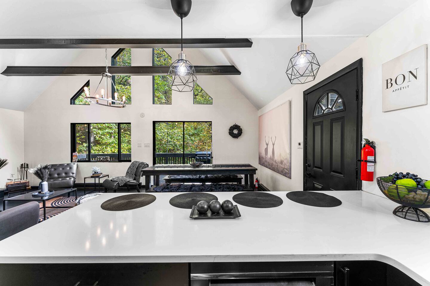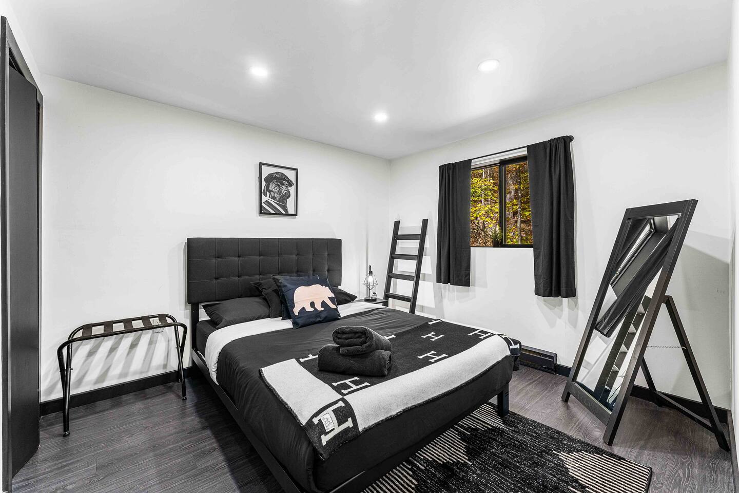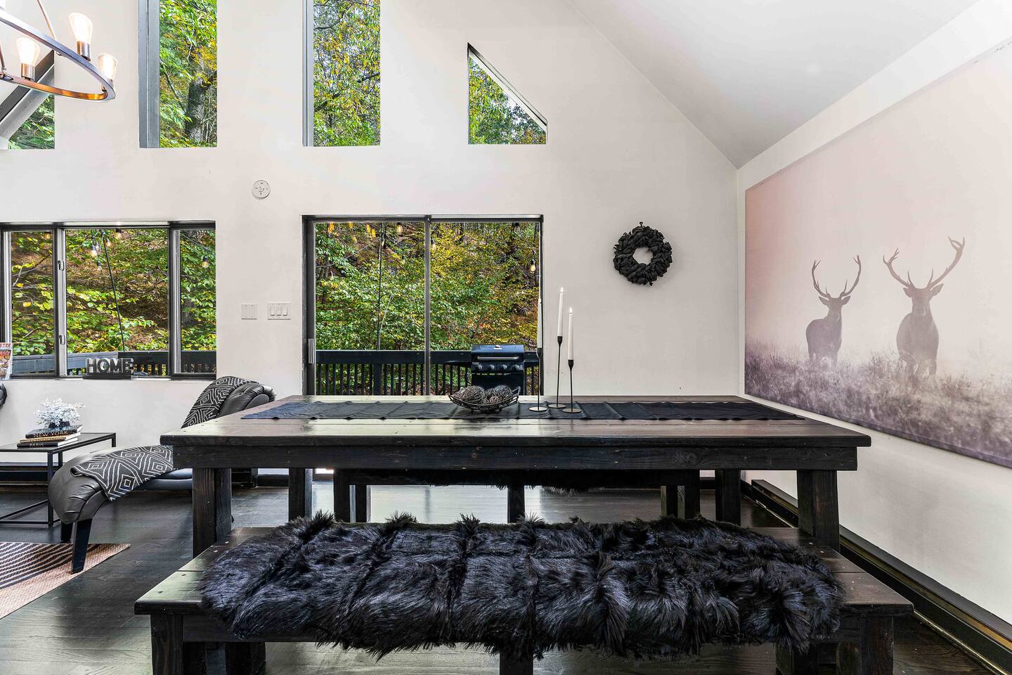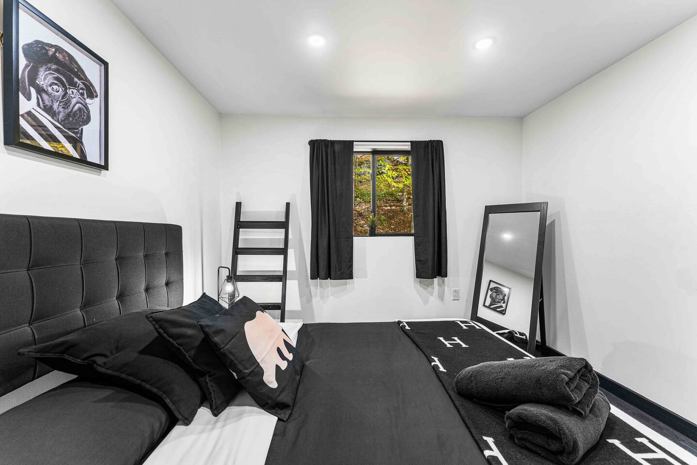The BLVCK Cabin II is located in the Heart of the Bushkill Mountains area. Being surrounded by creeks, nature, and views this true Mountain terrain also has roads that can be steep and bumpy filled with gravel, please note in the wintertime we recommend vehicles properly equipped for snow to access the property to get around winter storms. The community does plow the snow daily as well as our contracted snow plowers. Price Chopper is a 24/7 Supermarket that will have an amazing selection of seafood, meats, vegetables, beer, wine and so much more. Shawnee Mountain is a short 15-20 minute drive for all your skiing and snowboarding needs. We have a kayaking place roughly 25 minutes from the house as well. Farmers Market happens every weekend as well. Bushkill Falls & hiking is 15-20 minutes as well. Other major snow attractions are 30-45 minutes away to include the Pocono Outlet shopping center.