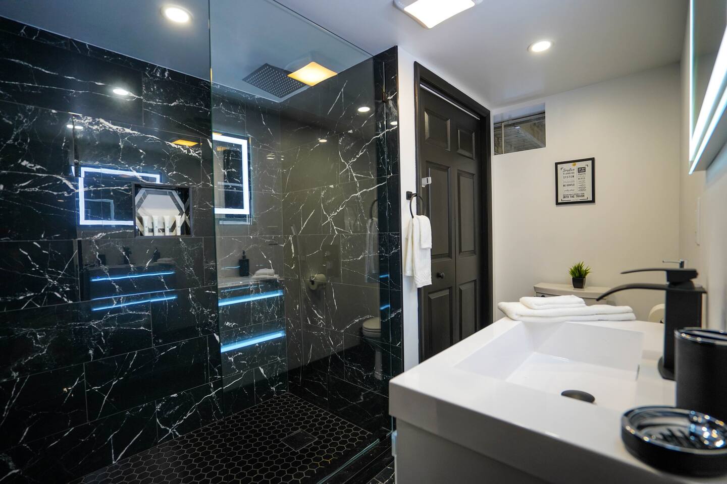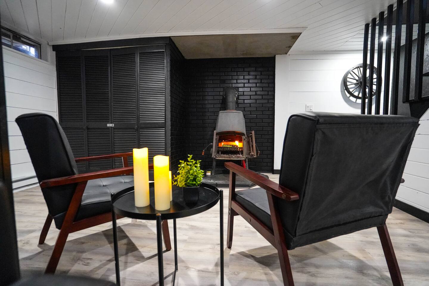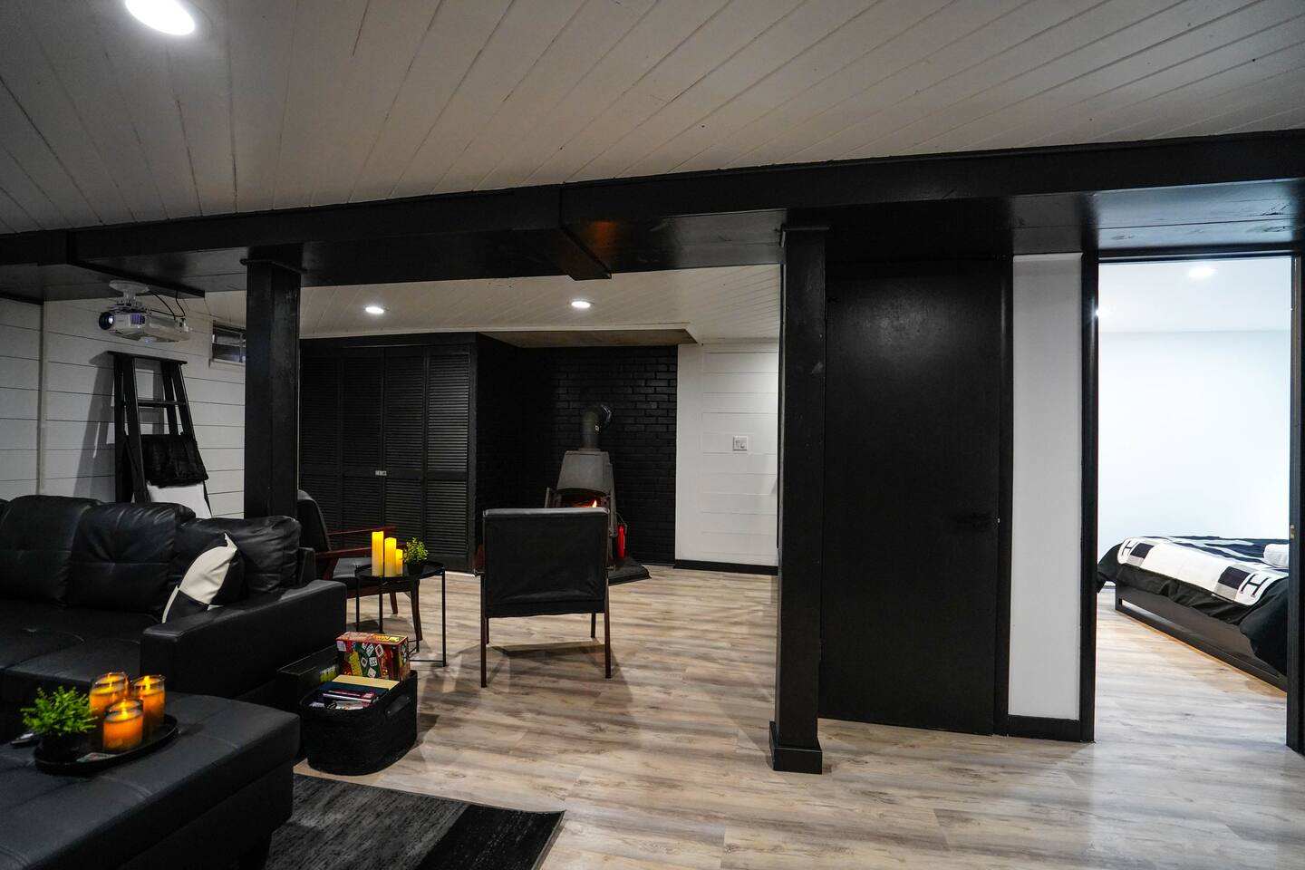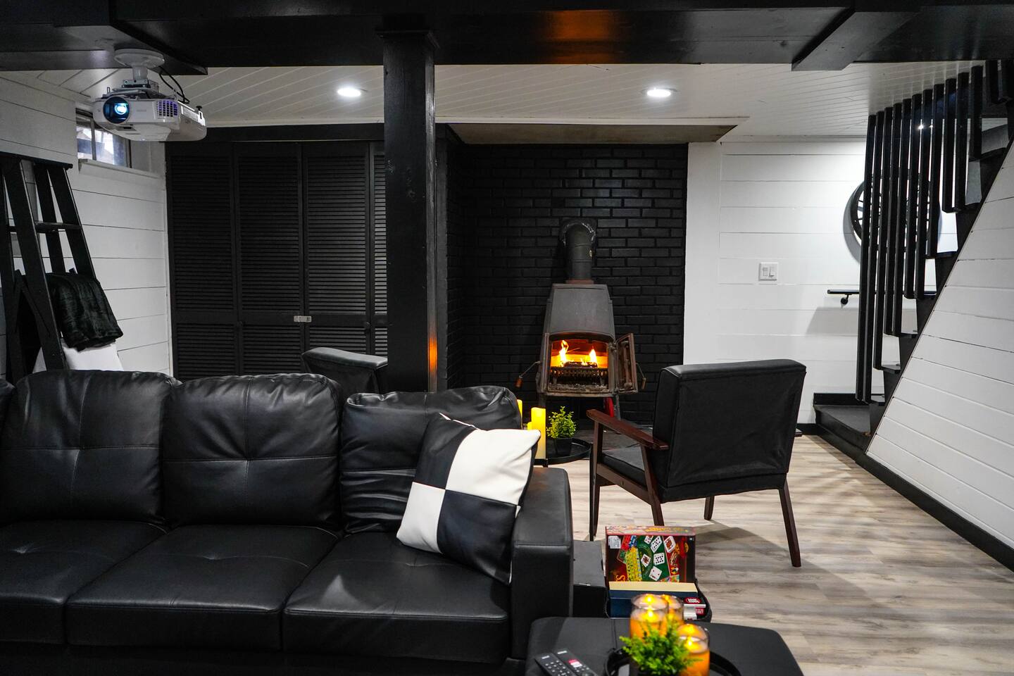 The house has 3 levels. Upper level: Loft with queen-size bed, TV and free standing tub. Main Level: Kitchen/Dinning Room/Living Room Area with wood burning Fireplace, full bathroom, 2 bedrooms with queen-size beds. Lower Level: Wood burning stove, Movie theater/Projector area, Full bathroom, bedroom with queen-size bed, Washer + Dryer available throughout your stay.