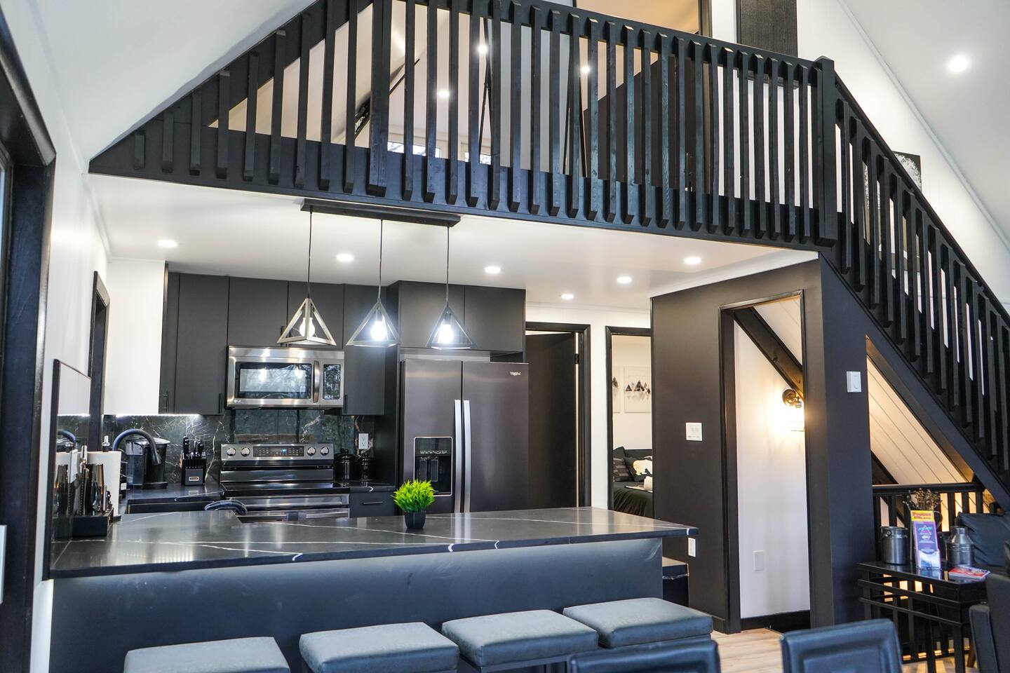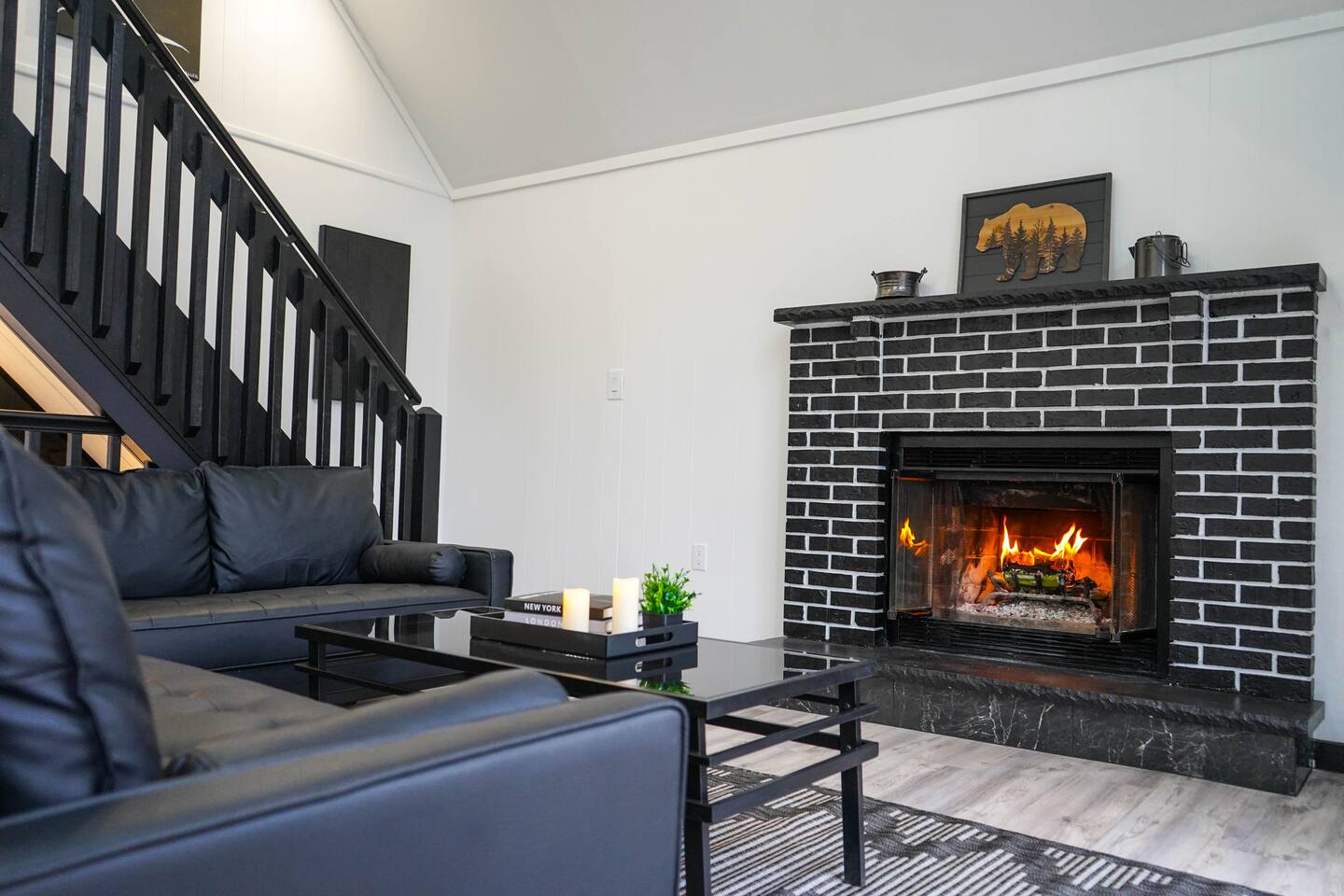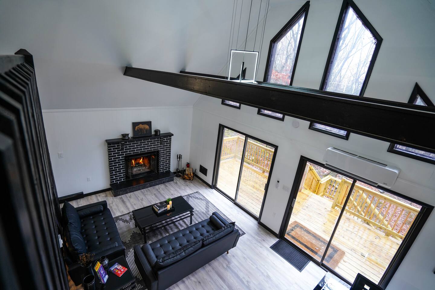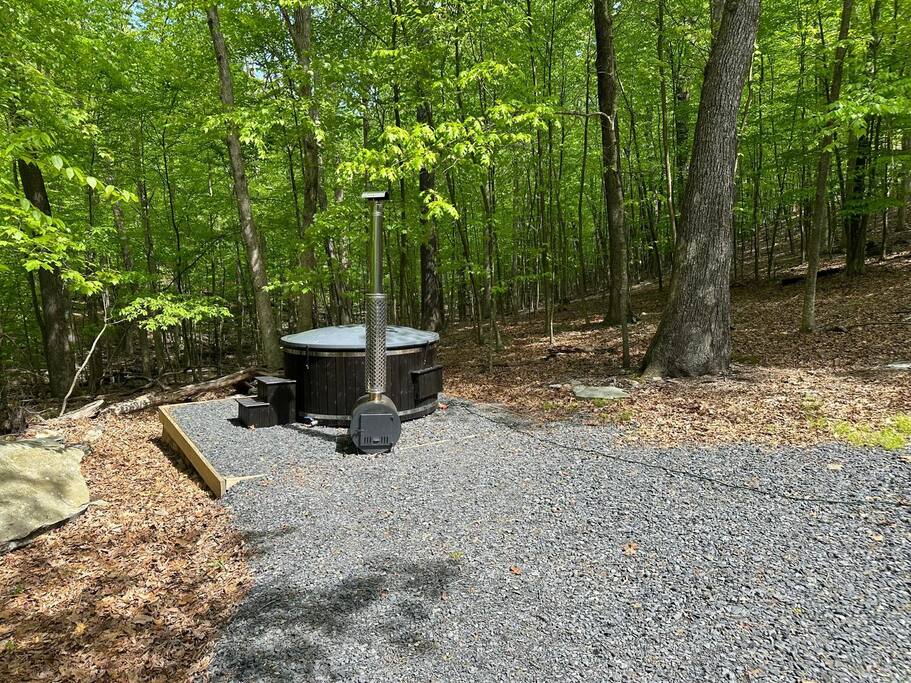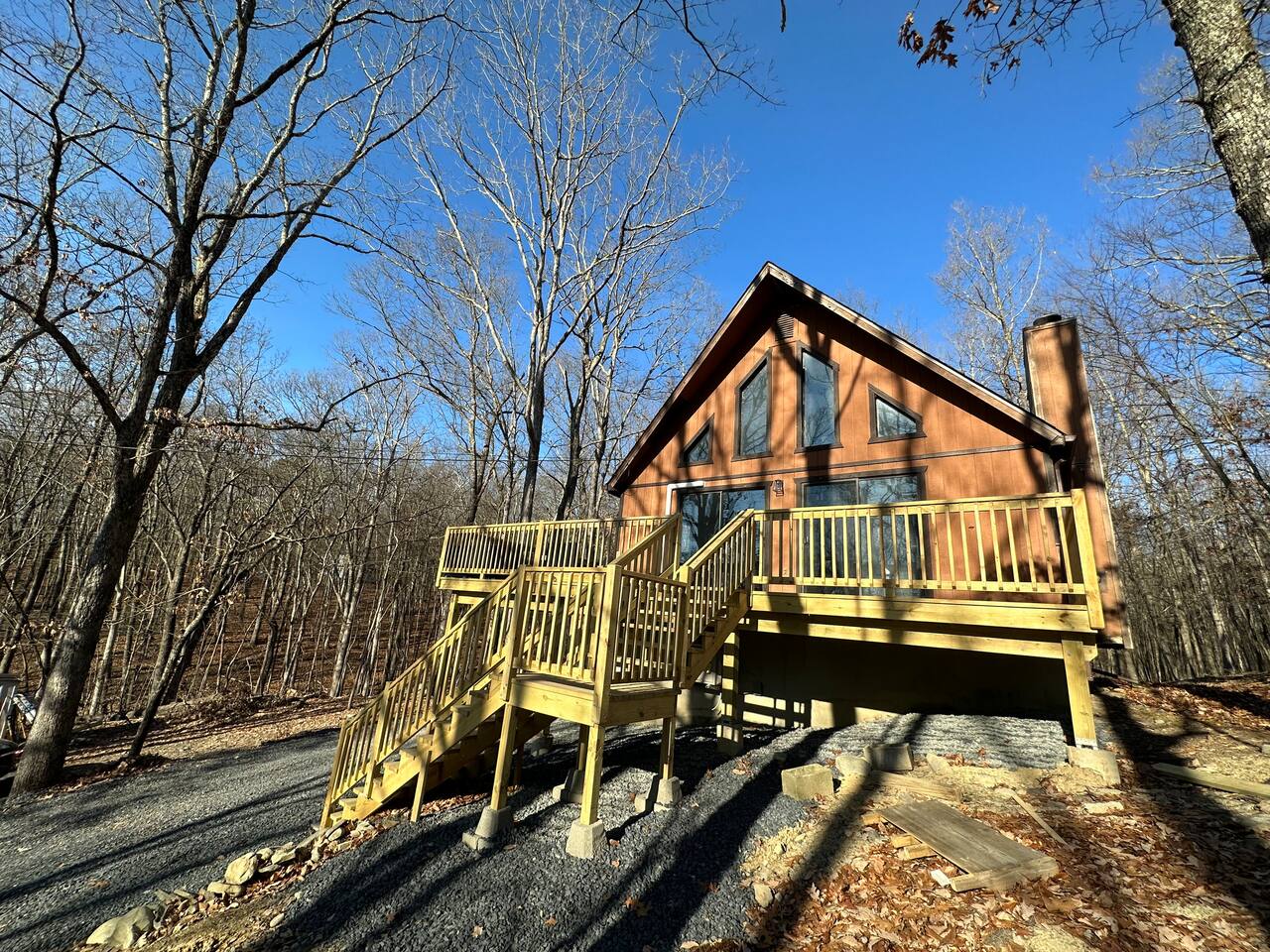 True mountain escape with designer finishes and high end appliances. The Cabin is situated near Bushkill Falls. The house is suited for 8 people with 3 queen bedrooms and Queen Loft on the upper level. Open kitchen plan that connects with the living space highlighted by a beautiful fireplace. Beautiful deck for entertaining with a gas fire pit. Basement with cozy fireplace and projector. Only 20mins away from Shawnee Mountain and Bushkill Falls. Backyard with a fire pit and wood burning hot tub!