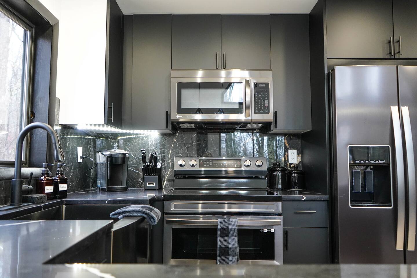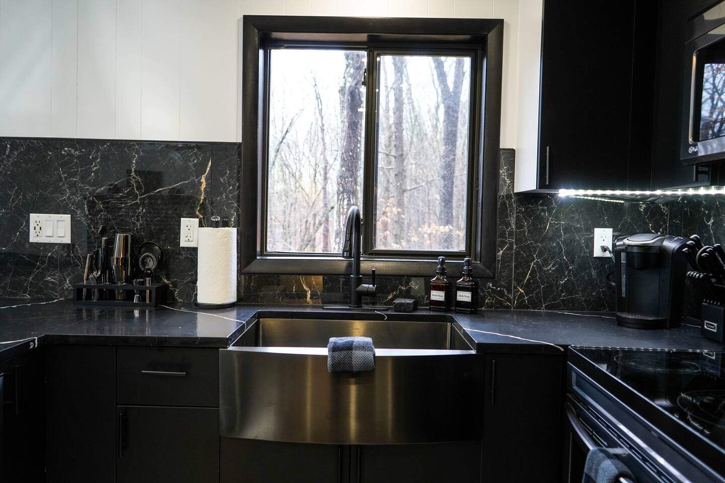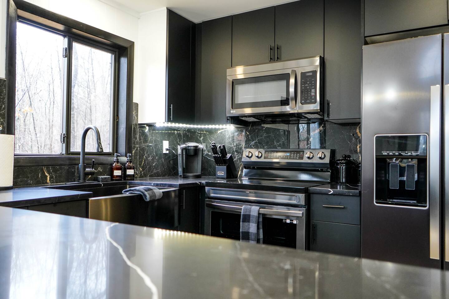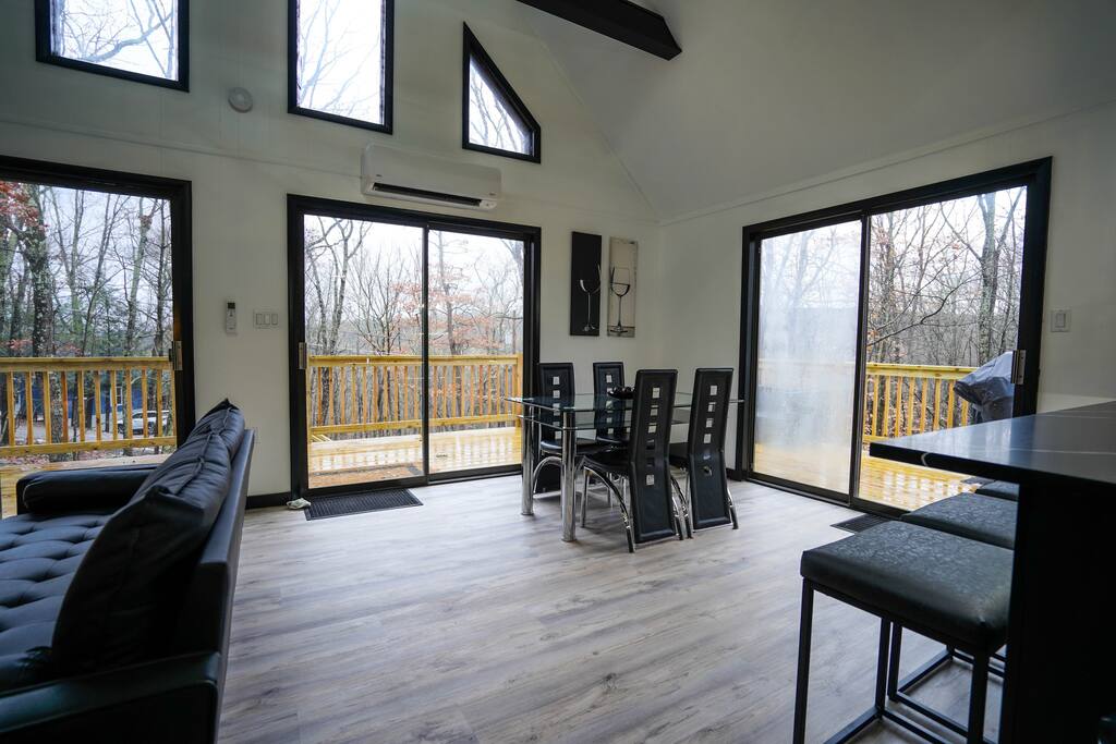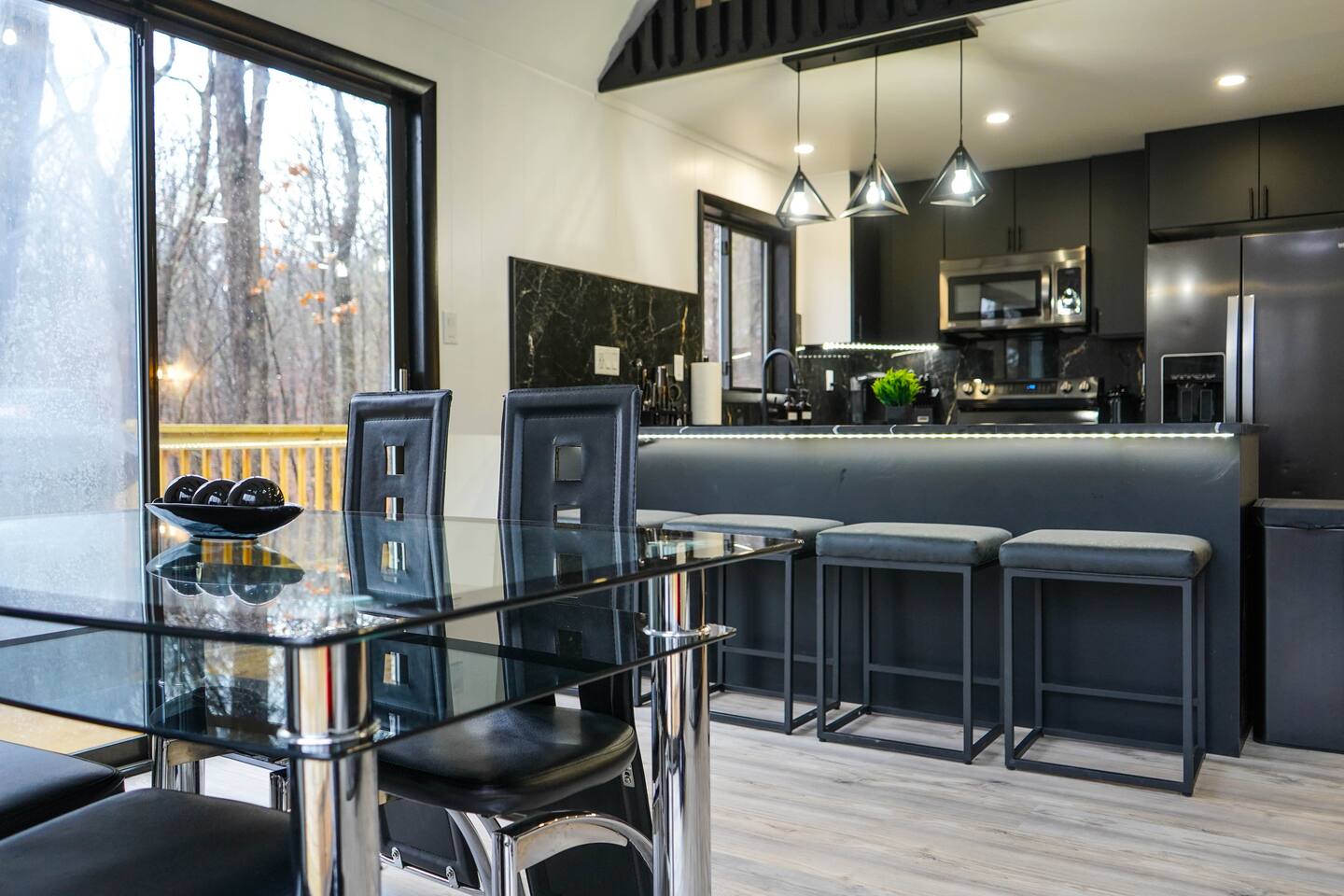 The BLVCK Cabin III is located in the Heart of the Bushkill Mountain area. Being surrounded by creeks, nature, and views this true Mountain terrain also has roads that can be steep and bumpy filled with gravel, please note in the wintertime we recommend vehicles properly equipped for snow to access the property to get around winter storms. The community does plow the snow daily as well as our contracted snow plowers. Price Chopper is a 24/7 Supermarket that will have an amazing selection of seafood, meats, vegetables, beer, wine and so much more. Shawnee Mountain is a short 15-20 minute drive for all your skiing and snowboarding needs. We have a kayaking place roughly 25 minutes from the house as well. Farmers Market happens every weekend as well. Bushkill Falls & hiking is 15-20 minutes as well. Other major snow attractions are 30-45 minutes away to include the Pocono Outlet shopping center.