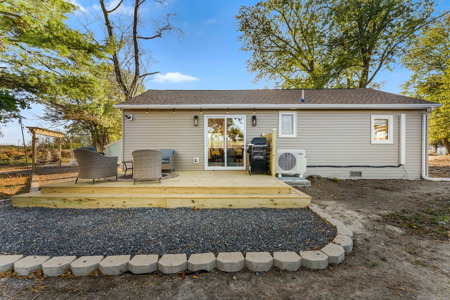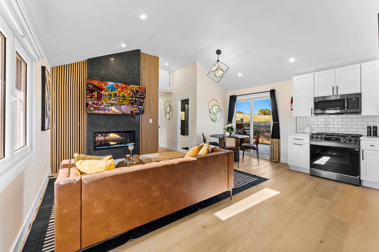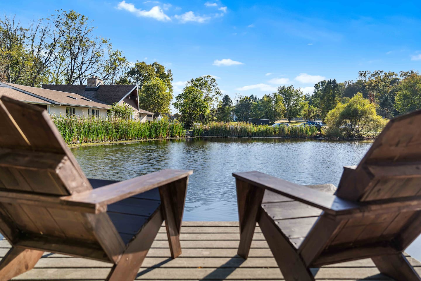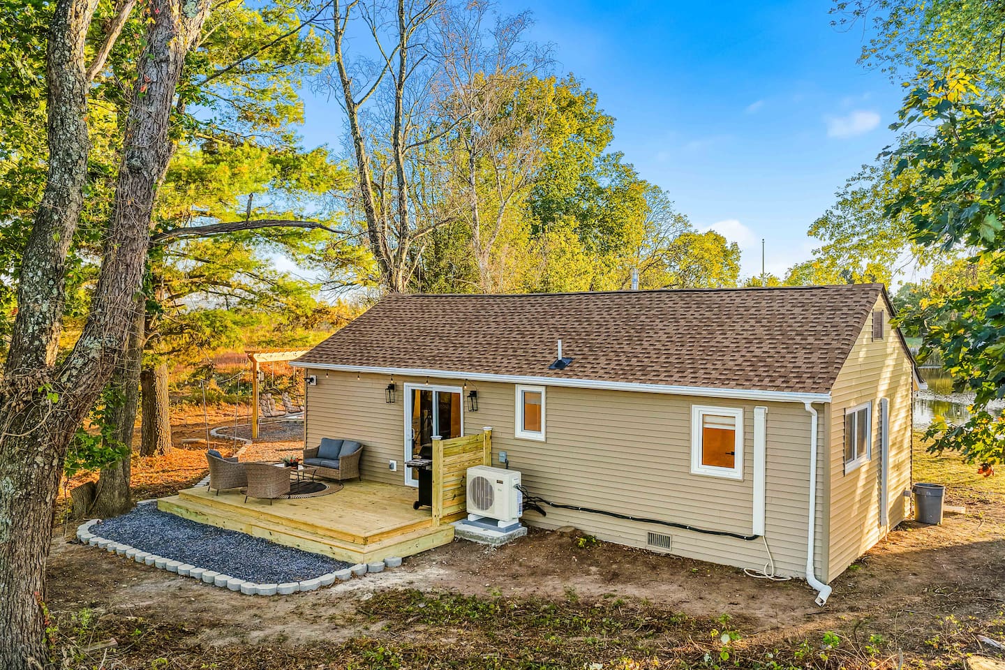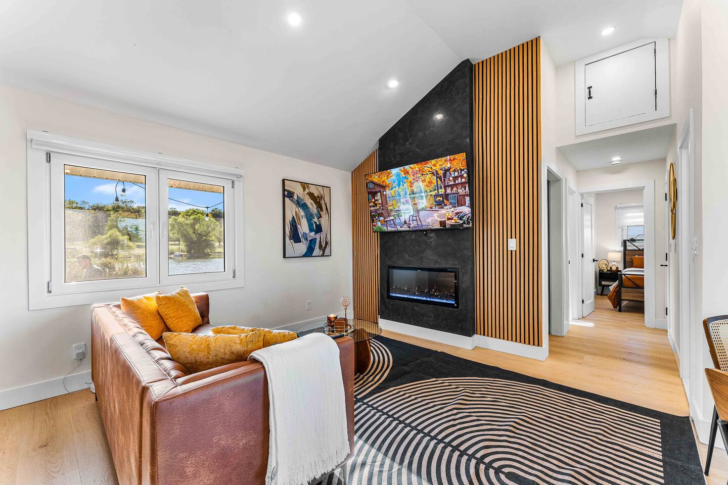 Welcome to your serene lakeside retreat — where modern comfort meets natural beauty. Step inside to an open-concept space with stylish décor and plenty of natural light. To the left, unwind in the living room featuring a cozy electric fireplace, smart TV, and plush seating. Straight ahead, a fully equipped kitchen with stainless steel appliances connects seamlessly to a dining area with seating for four. A sliding glass door opens to a peaceful back patio with a BBQ grill and outdoor seating, overlooking nothing but nature. Down the hallway, you’ll find a full bathroom with a shower/tub combo, heated floors, and complimentary toiletries. The open closet area includes a washer and dryer for your convenience. The main bedroom offers a queen bed and tranquil lake views, while the second bedroom features another queen bed and stunning sunrise scenery. Outside, enjoy your private lake deck, wood-burning hot tub, and firepit area with benches and a swing — the perfect spot to relax and take in the breathtaking surroundings.