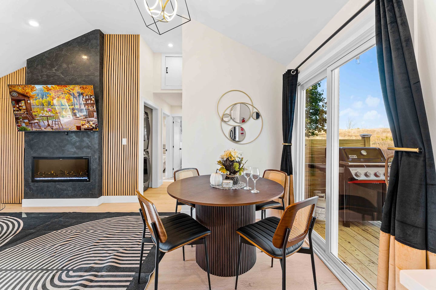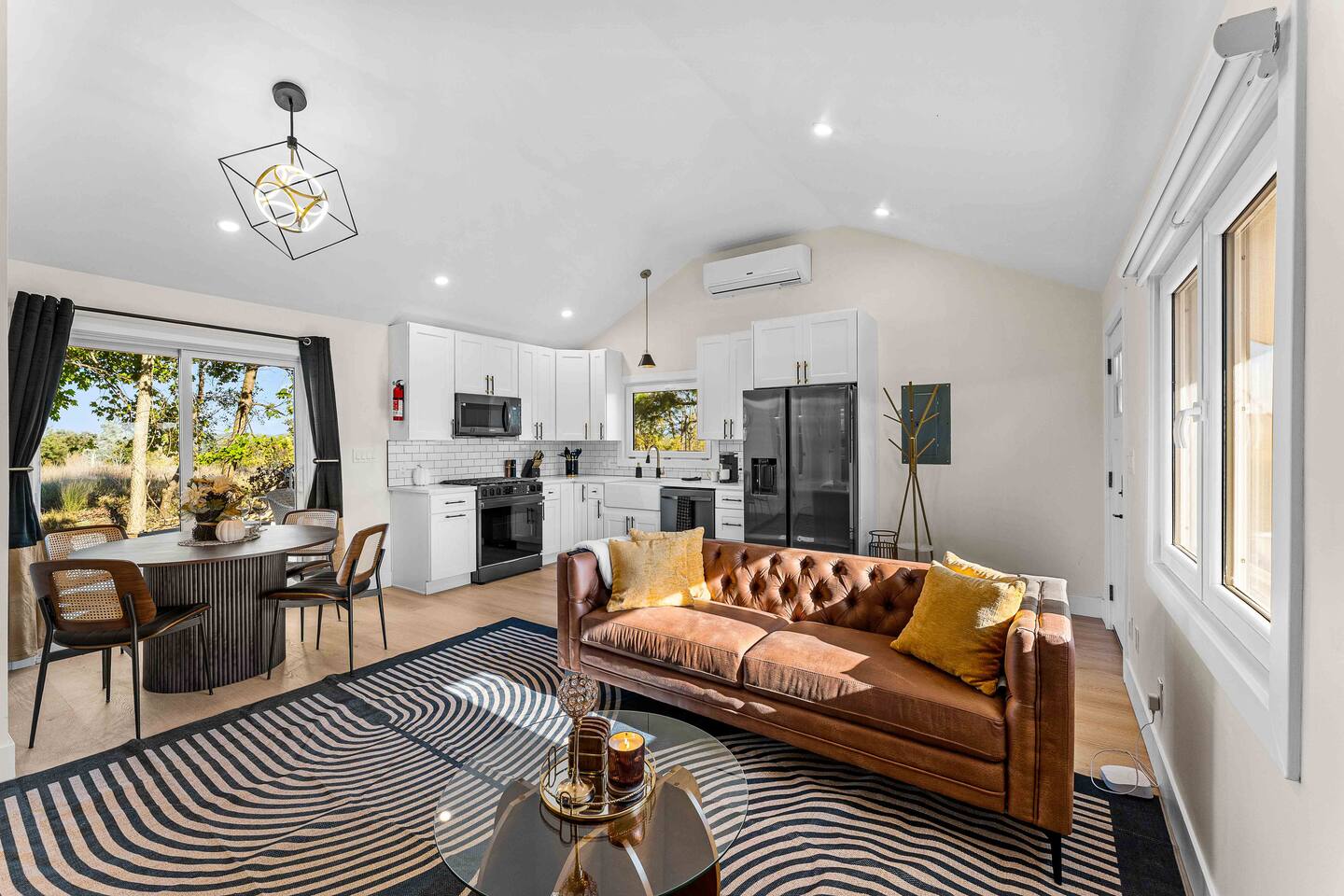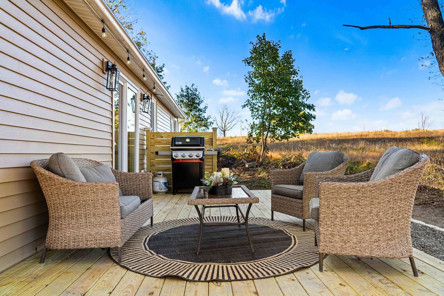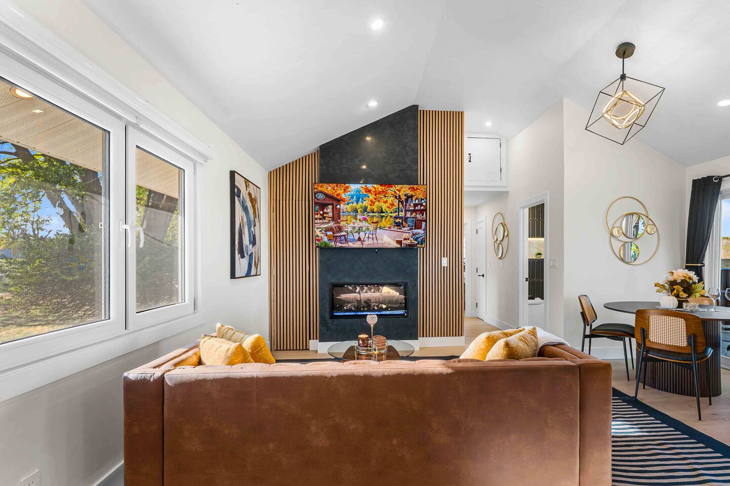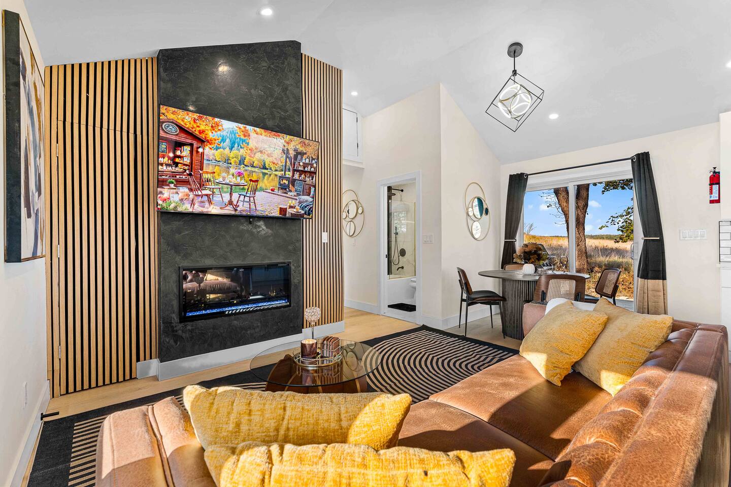 Welcome to your serene lakeside retreat — where modern comfort meets natural beauty. Step inside to an open-concept space with stylish décor and plenty of natural light. To the left, unwind in the living room featuring a cozy electric fireplace, smart TV, and plush seating. Straight ahead, a fully equipped kitchen with stainless steel appliances connects seamlessly to a dining area with seating for four. A sliding glass door opens to a peaceful back patio with a BBQ grill and outdoor seating, overlooking nothing but nature. Down the hallway, you’ll find a full bathroom with a shower/tub combo, heated floors, and complimentary toiletries. The open closet area includes a washer and dryer for your convenience. The main bedroom offers a queen bed and tranquil lake views, while the second bedroom features another queen bed and stunning sunrise scenery. Outside, enjoy your private lake deck, wood-burning hot tub, and firepit area with benches and a swing — the perfect spot to relax and take in the breathtaking surroundings.