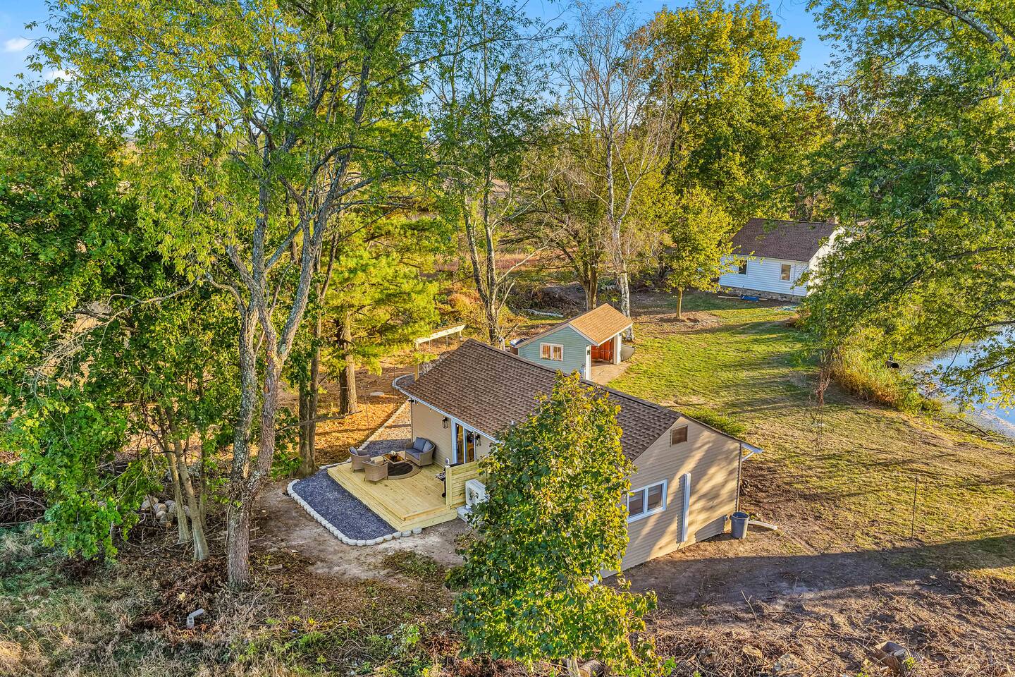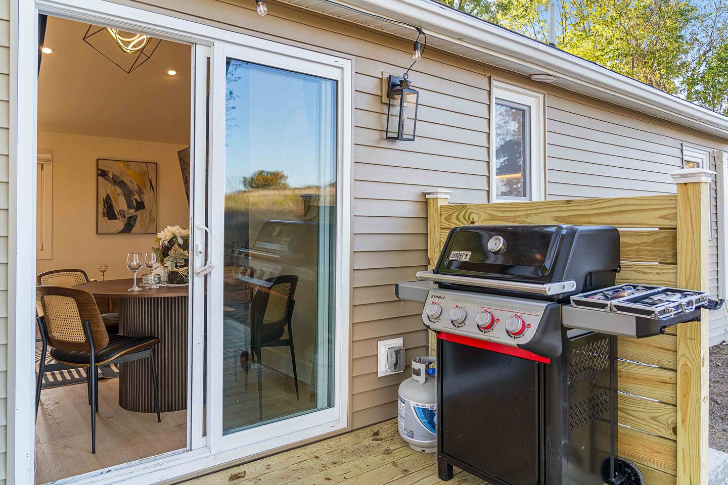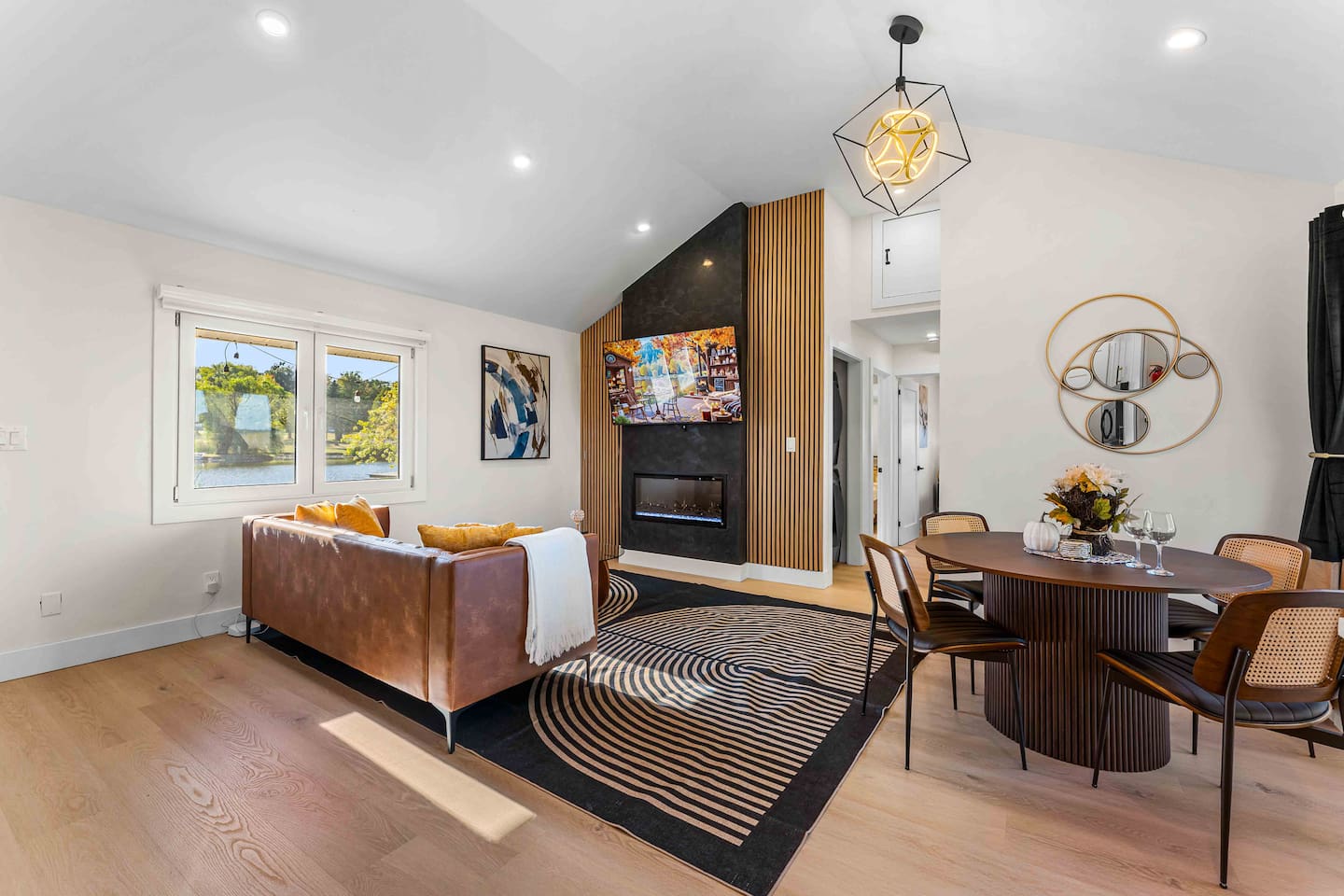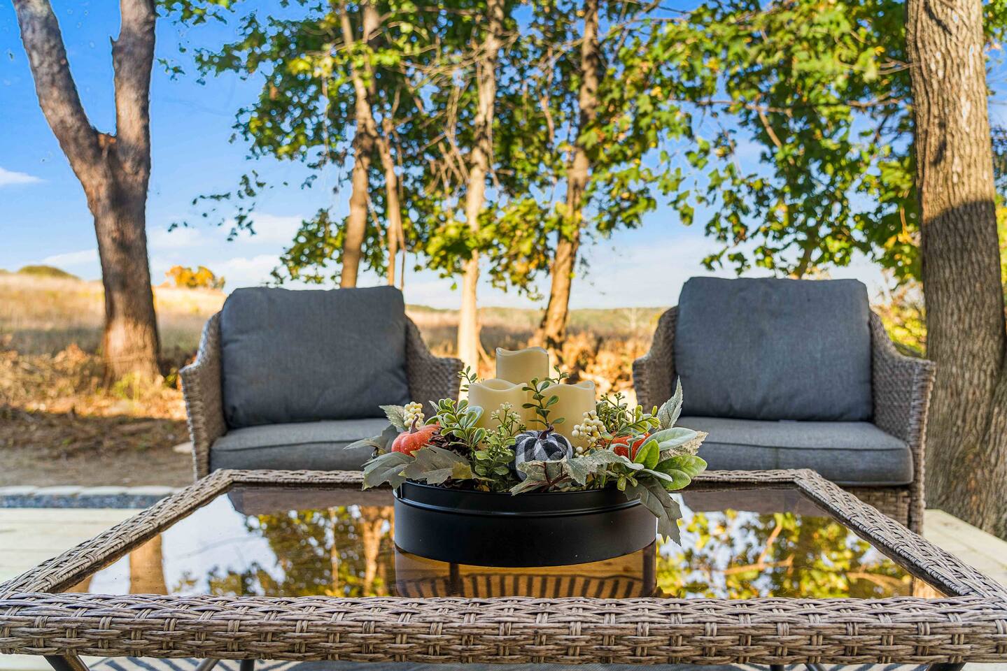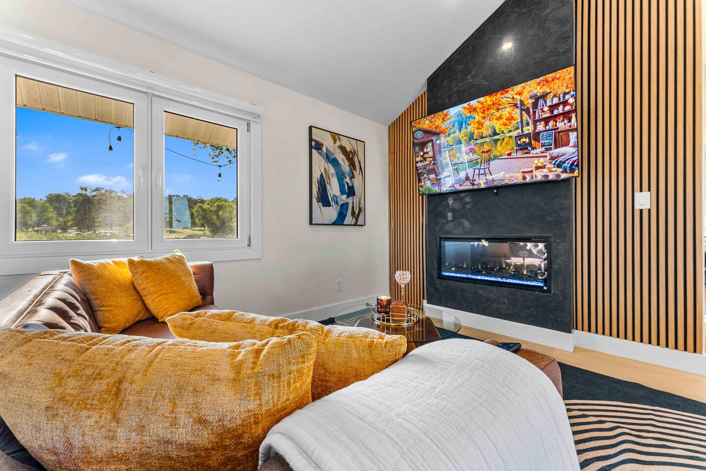 Welcome to your serene lakeside retreat — where modern comfort meets natural beauty. Step inside to an open-concept space with stylish décor and plenty of natural light. To the left, unwind in the living room featuring a cozy electric fireplace, smart TV, and plush seating. Straight ahead, a fully equipped kitchen with stainless steel appliances connects seamlessly to a dining area with seating for four. A sliding glass door opens to a peaceful back patio with a BBQ grill and outdoor seating, overlooking nothing but nature. Down the hallway, you’ll find a full bathroom with a shower/tub combo, heated floors, and complimentary toiletries. The open closet area includes a washer and dryer for your convenience. The main bedroom offers a queen bed and tranquil lake views, while the second bedroom features another queen bed and stunning sunrise scenery. Outside, enjoy your private lake deck, wood-burning hot tub, and firepit area with benches and a swing — the perfect spot to relax and take in the breathtaking surroundings.