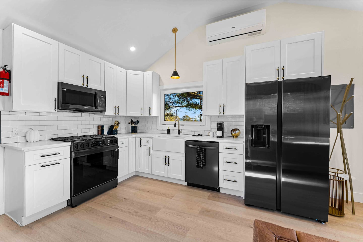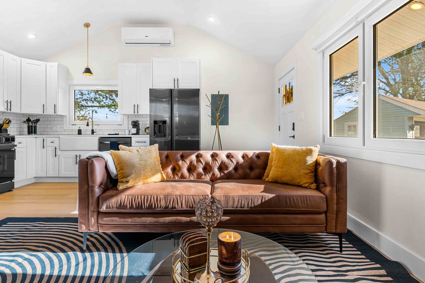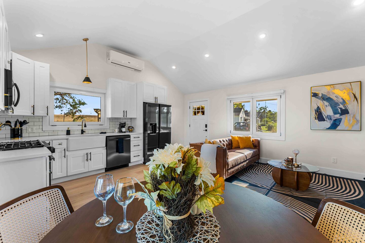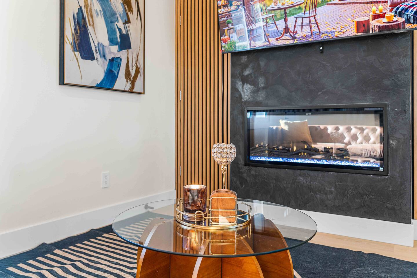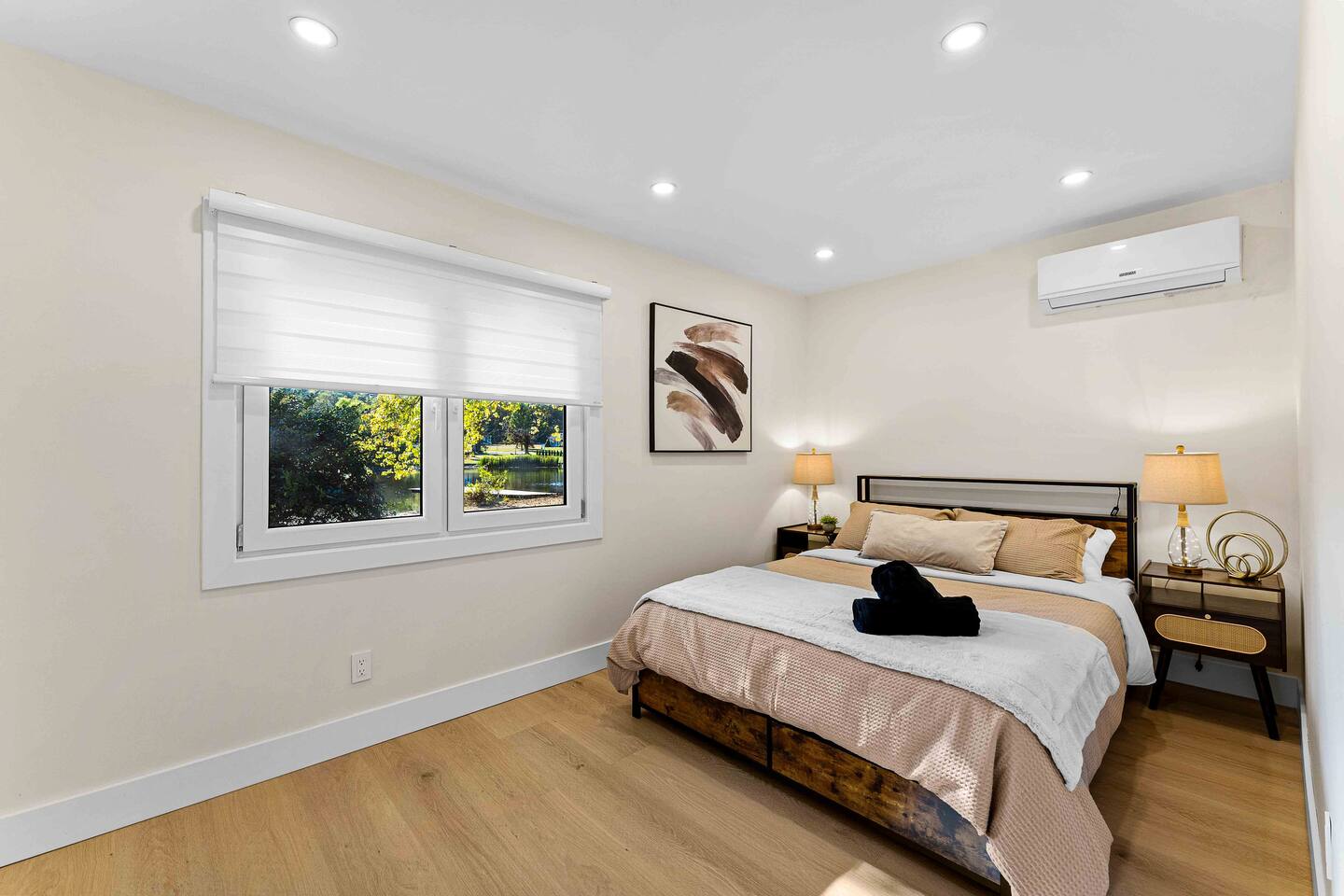 Welcome to your serene lakeside retreat — where modern comfort meets natural beauty. Step inside to an open-concept space with stylish décor and plenty of natural light. To the left, unwind in the living room featuring a cozy electric fireplace, smart TV, and plush seating. Straight ahead, a fully equipped kitchen with stainless steel appliances connects seamlessly to a dining area with seating for four. A sliding glass door opens to a peaceful back patio with a BBQ grill and outdoor seating, overlooking nothing but nature. Down the hallway, you’ll find a full bathroom with a shower/tub combo, heated floors, and complimentary toiletries. The open closet area includes a washer and dryer for your convenience. The main bedroom offers a queen bed and tranquil lake views, while the second bedroom features another queen bed and stunning sunrise scenery. Outside, enjoy your private lake deck, wood-burning hot tub, and firepit area with benches and a swing — the perfect spot to relax and take in the breathtaking surroundings.
