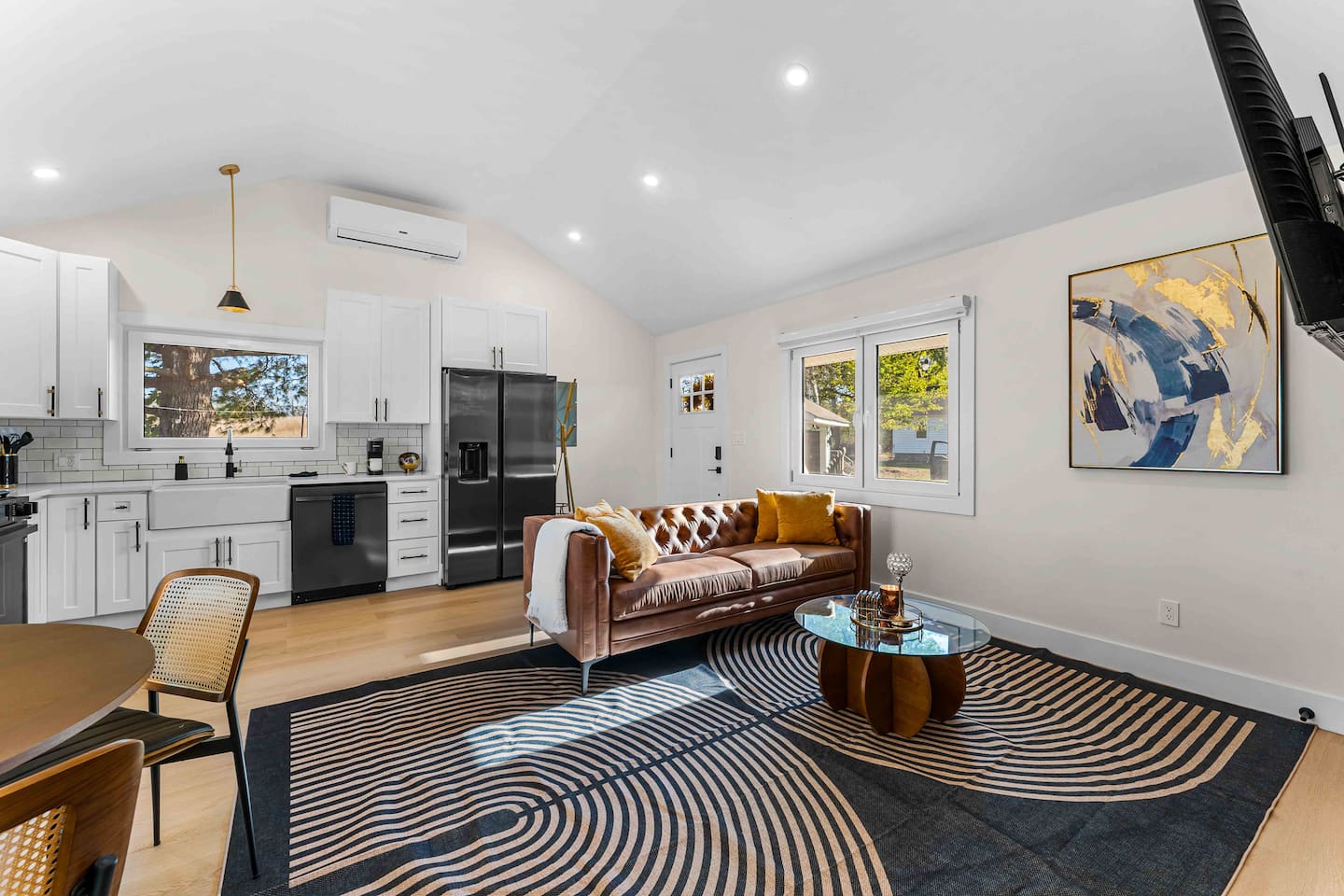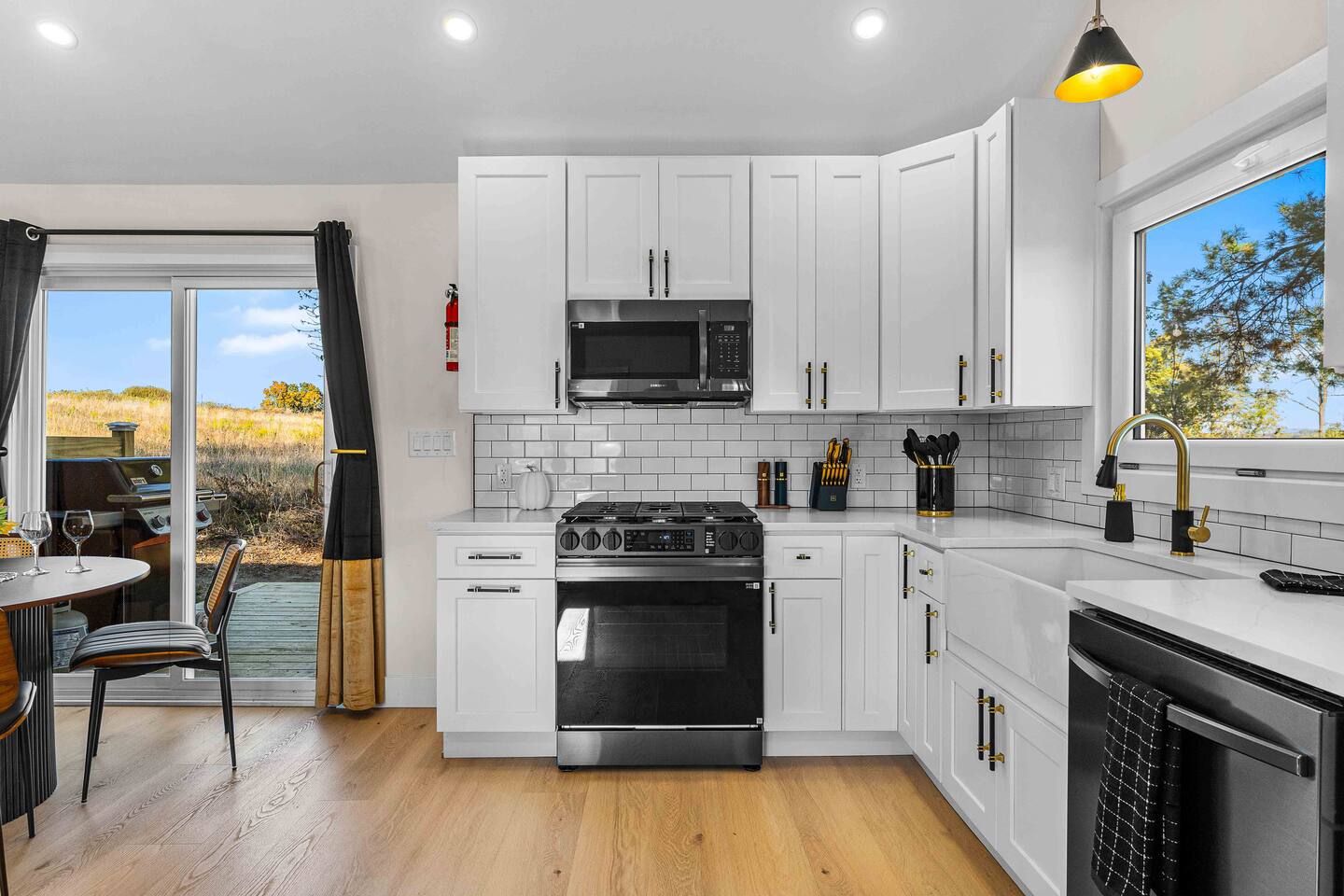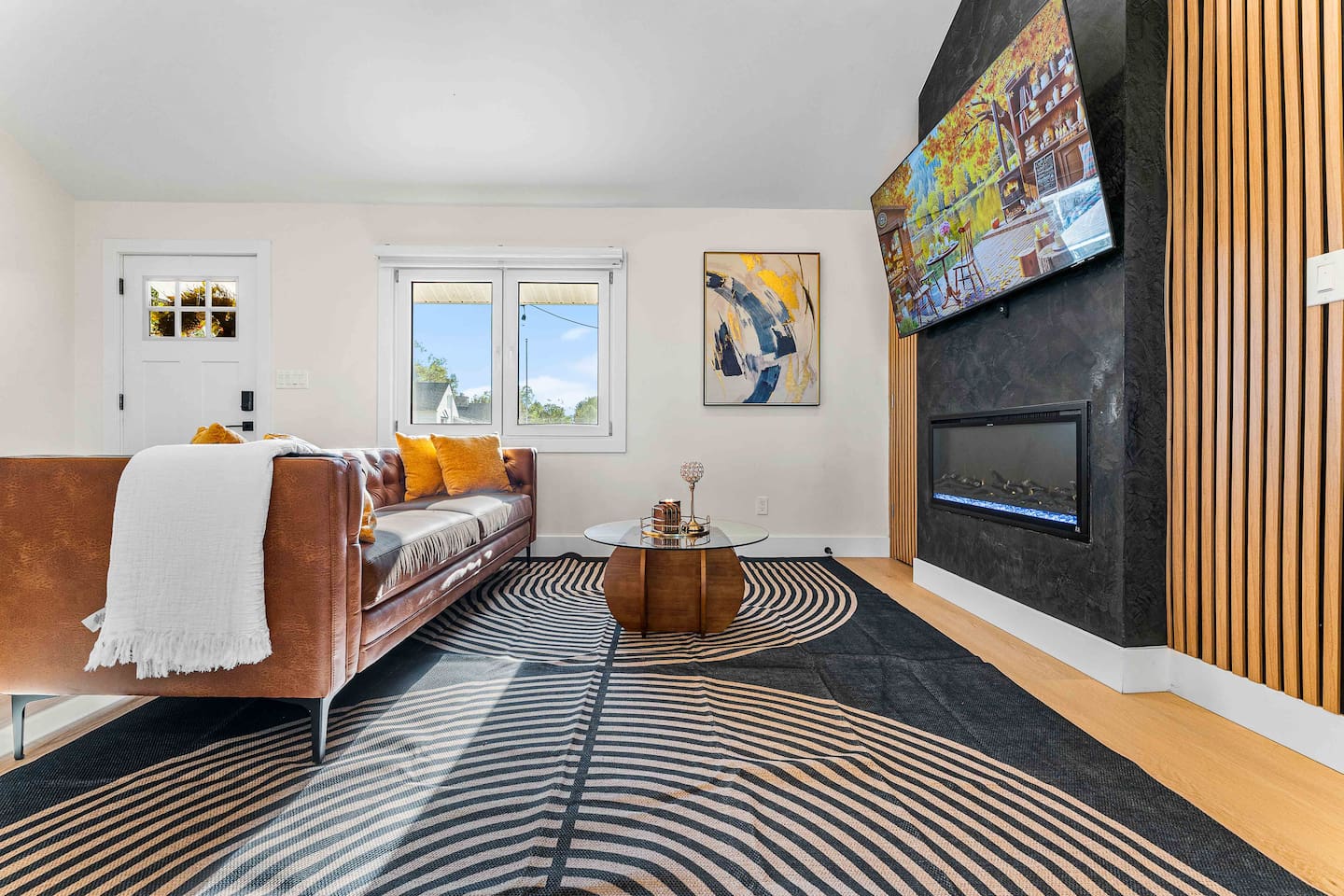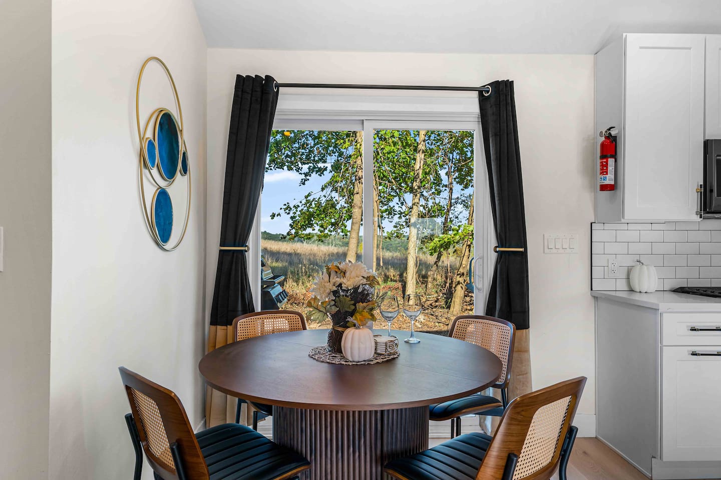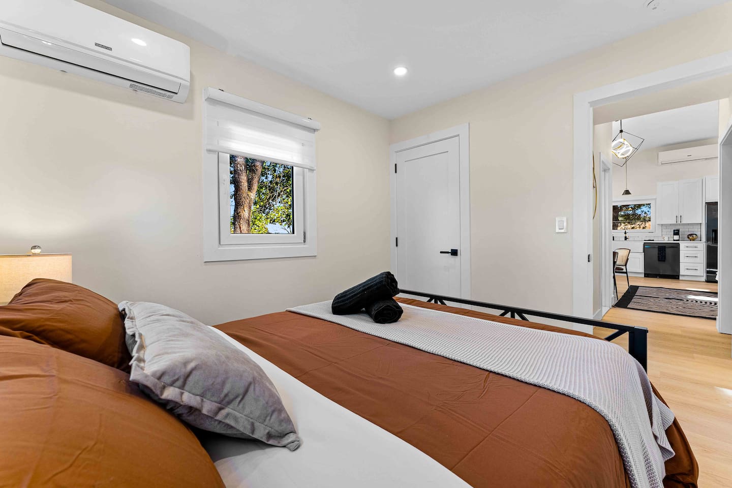 Welcome to your serene lakeside retreat — where modern comfort meets natural beauty. Step inside to an open-concept space with stylish décor and plenty of natural light. To the left, unwind in the living room featuring a cozy electric fireplace, smart TV, and plush seating. Straight ahead, a fully equipped kitchen with stainless steel appliances connects seamlessly to a dining area with seating for four. A sliding glass door opens to a peaceful back patio with a BBQ grill and outdoor seating, overlooking nothing but nature. Down the hallway, you’ll find a full bathroom with a shower/tub combo, heated floors, and complimentary toiletries. The open closet area includes a washer and dryer for your convenience. The main bedroom offers a queen bed and tranquil lake views, while the second bedroom features another queen bed and stunning sunrise scenery. Outside, enjoy your private lake deck, wood-burning hot tub, and firepit area with benches and a swing — the perfect spot to relax and take in the breathtaking surroundings.
