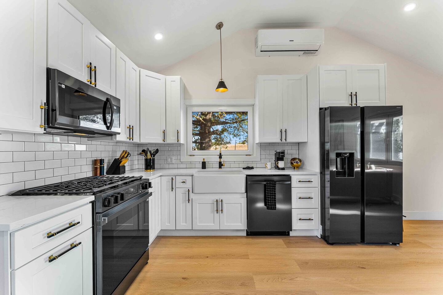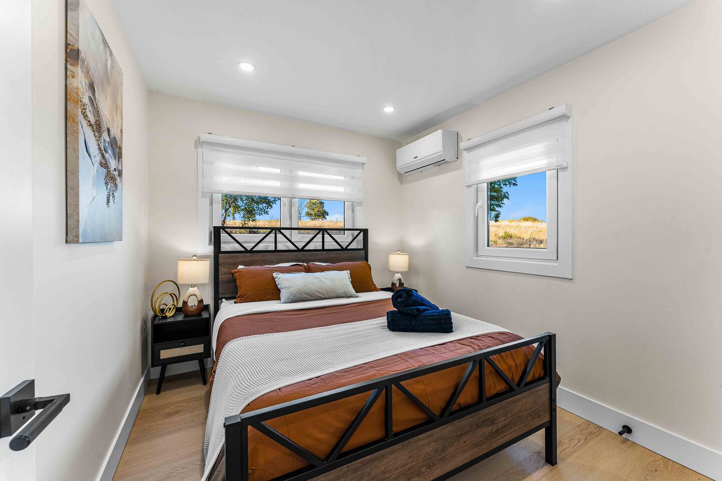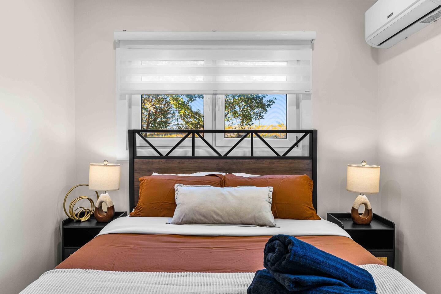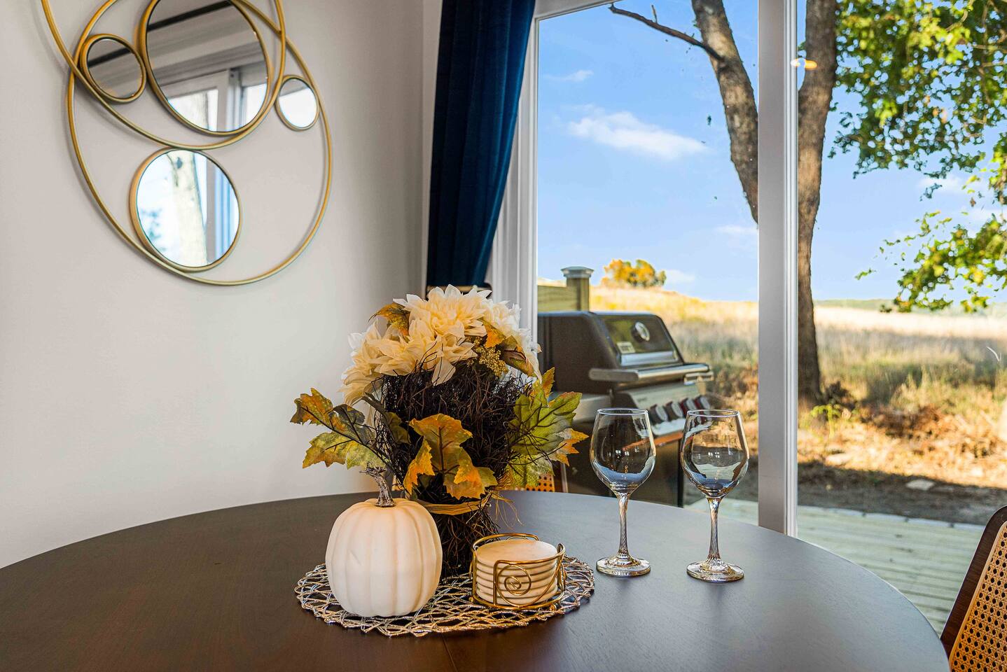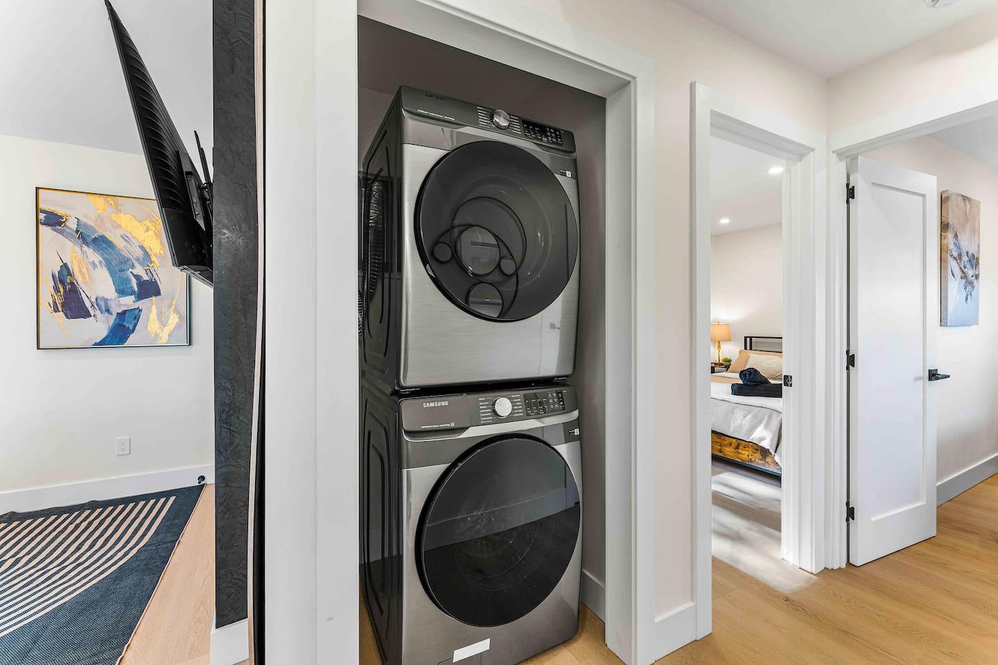 Welcome to your serene lakeside retreat — where modern comfort meets natural beauty. Step inside to an open-concept space with stylish décor and plenty of natural light. To the left, unwind in the living room featuring a cozy electric fireplace, smart TV, and plush seating. Straight ahead, a fully equipped kitchen with stainless steel appliances connects seamlessly to a dining area with seating for four. A sliding glass door opens to a peaceful back patio with a BBQ grill and outdoor seating, overlooking nothing but nature. Down the hallway, you’ll find a full bathroom with a shower/tub combo, heated floors, and complimentary toiletries. The open closet area includes a washer and dryer for your convenience. The main bedroom offers a queen bed and tranquil lake views, while the second bedroom features another queen bed and stunning sunrise scenery. Outside, enjoy your private lake deck, wood-burning hot tub, and firepit area with benches and a swing — the perfect spot to relax and take in the breathtaking surroundings.