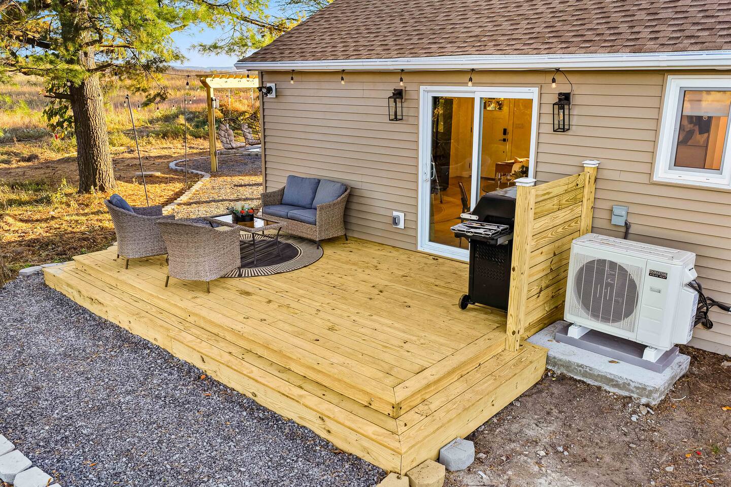 Charming 2BR cabin on a small private Pond shared with only one other family and a farm next door. Enjoy your own lakeside deck—perfect for fishing (catch & release) or simply relaxing by the water. The deck features a BBQ grill and comfy seating. Gather by the fire pit with a swing set and wooden bench, or unwind in the wood-burning hot tub surrounded by peaceful nature. Located just minutes from the Delaware Water Gap, this retreat offers the perfect blend of tranquility and outdoor adventure.