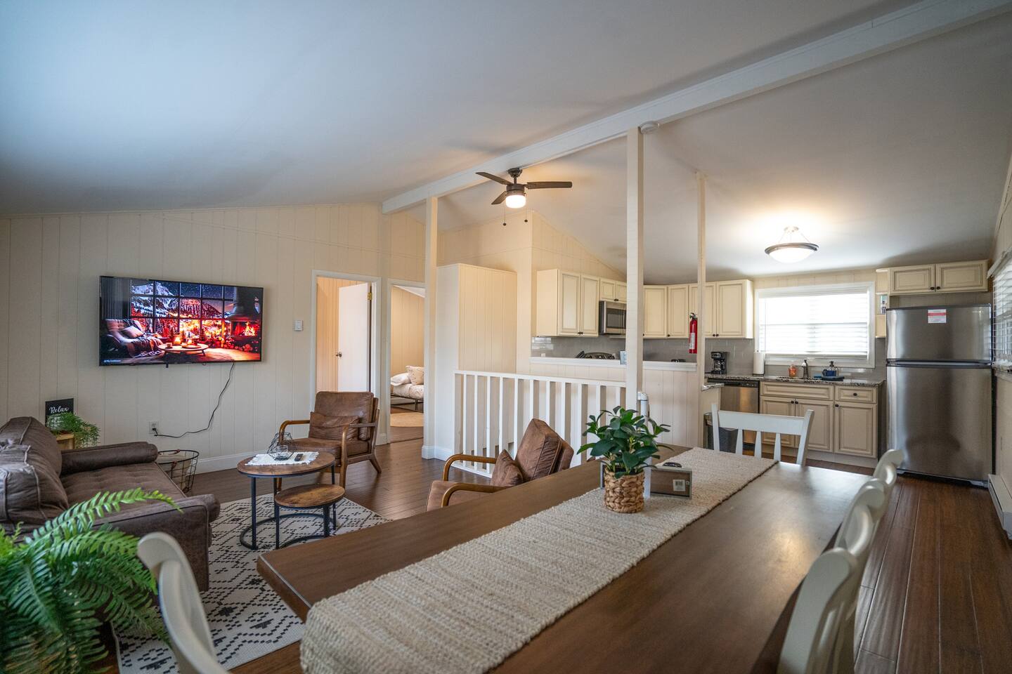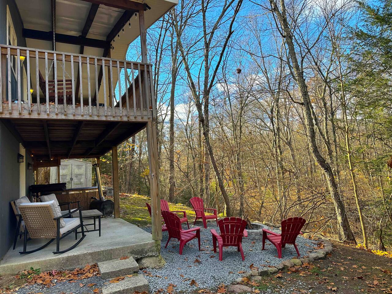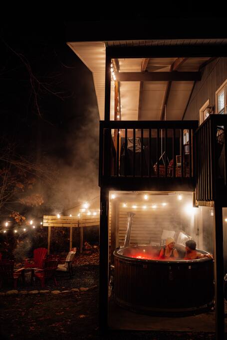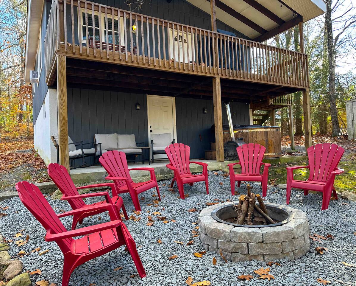 Welcome to our cozy cabin near Bushkill Falls! This cozy retreat offers beautiful wood burning hot tub and fire pit. More so, there are three spacious bedrooms, you and your loved ones can comfortably unwind after a day of exploration. The open concept kitchen, equipped with modern appliances provides a seamless cooking experience. For entertainment enthusiasts the cabin features a projector room. Step outside onto the balconies and be captivated by the picturesque views of the nature.