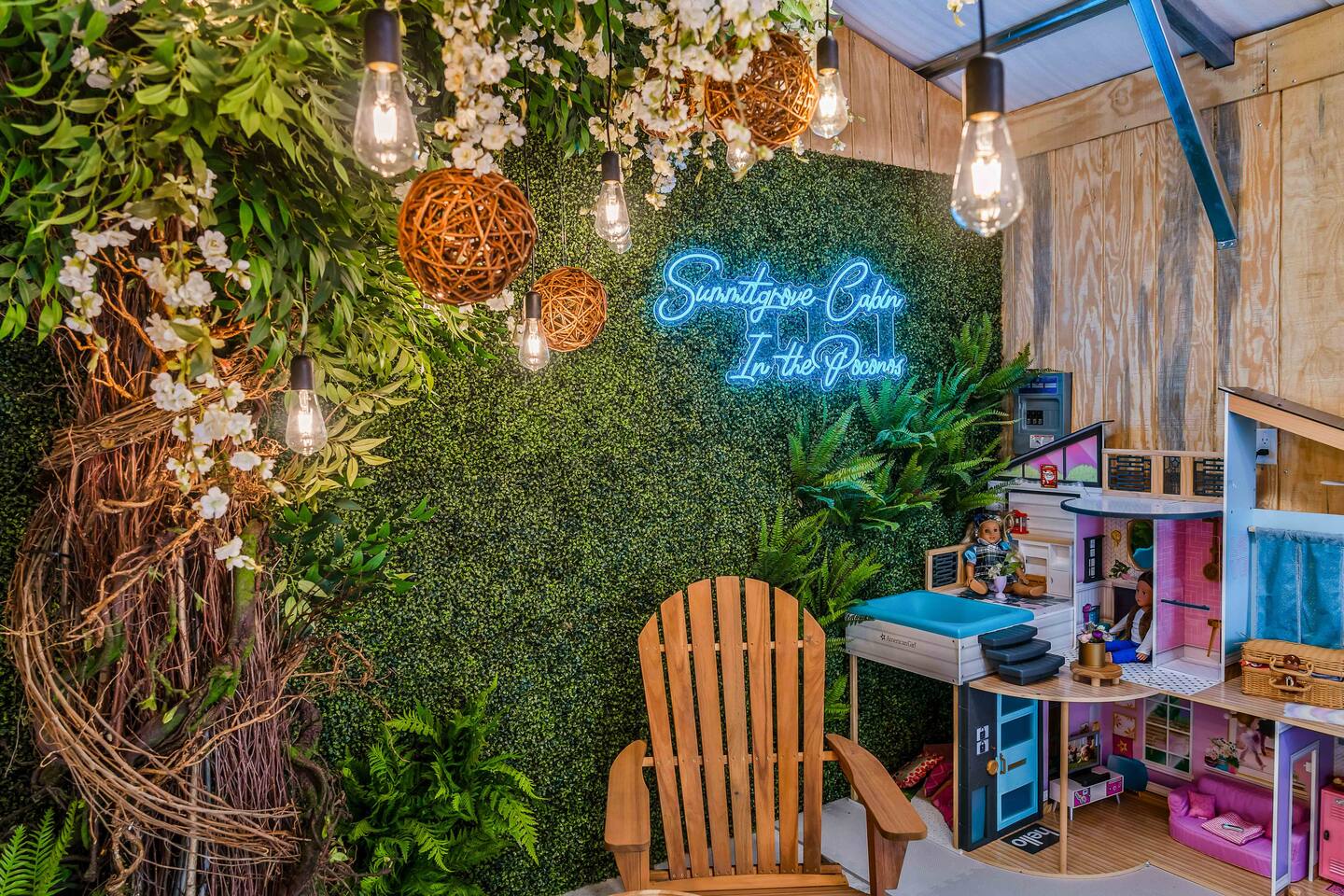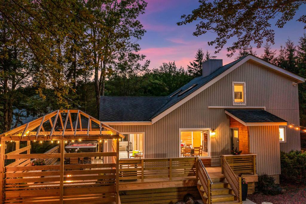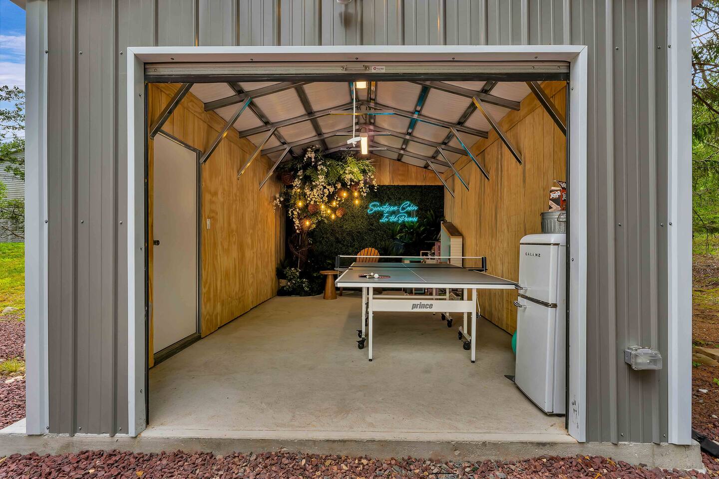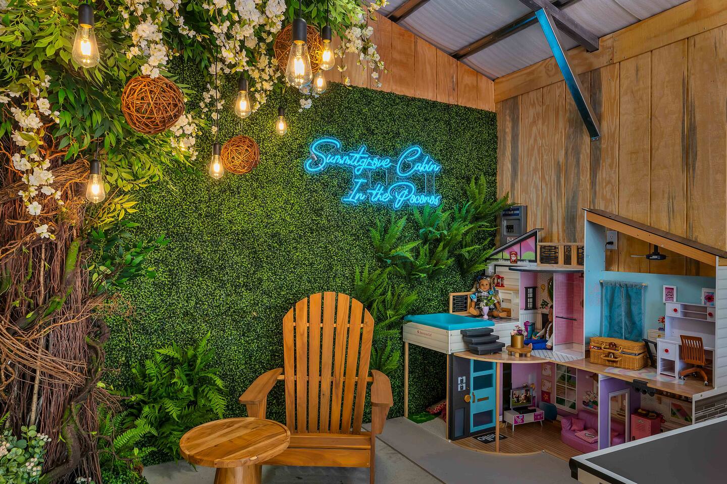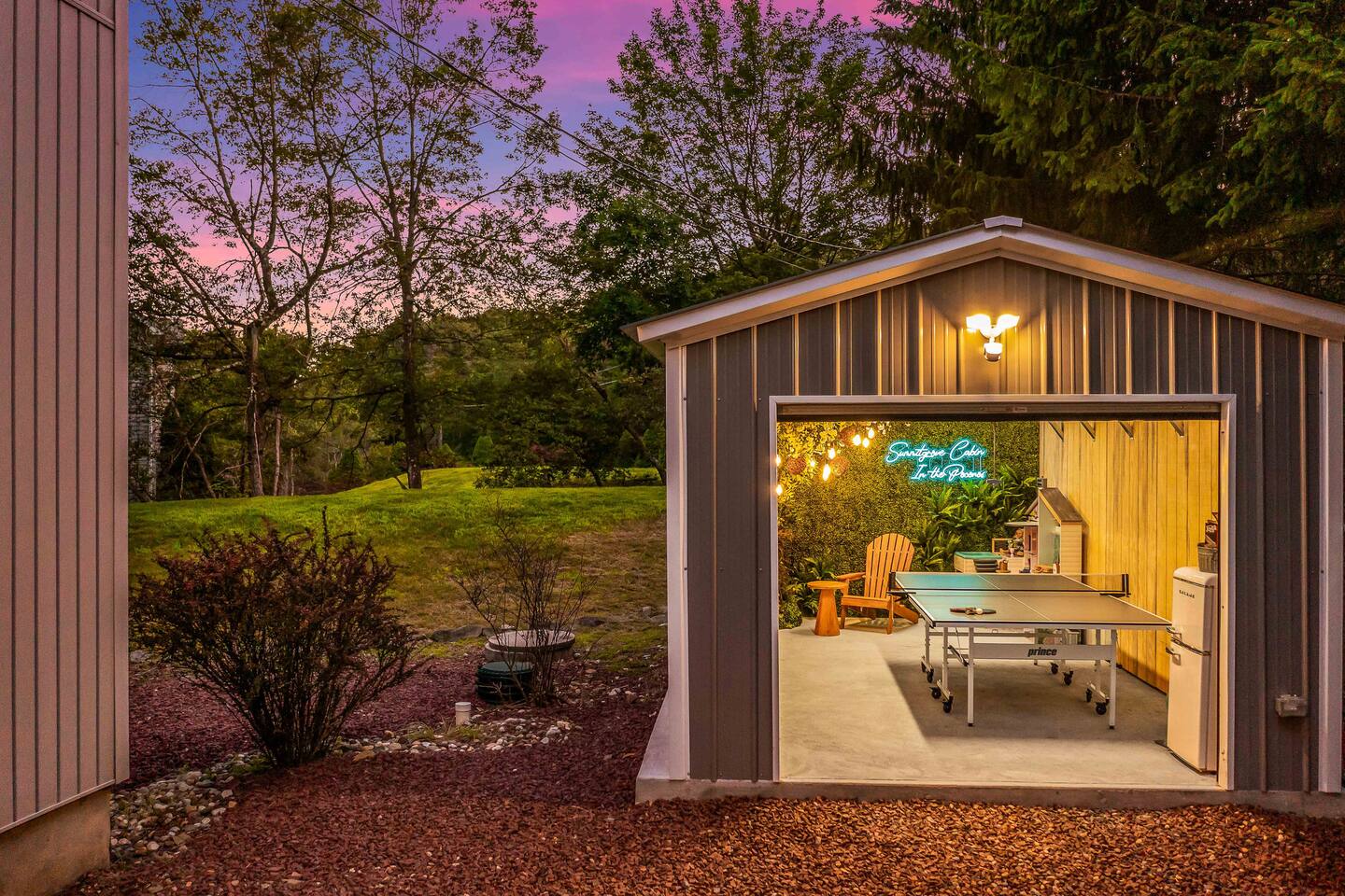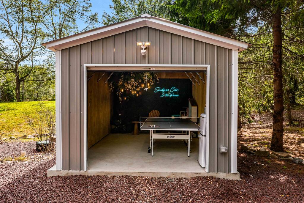 Welcome to Summitgrove Cabin, your modern yet cozy Pocono escape where comfort meets fun. MAIN LEVEL Step into a bright foyer that opens into the heart of the home. To the right, you’ll find a fully equipped kitchen, perfect for preparing family meals. Next to it is a full bathroom with a shower and a washer/dryer for your convenience. To the left, enjoy the open-concept living room with a warm electric fireplace and dining area. Off the living room is Bedroom 1, featuring a queen bed and closet space. A charming sunroom with heated floors invites you to relax, and from here you can step right onto the deck where the hot tub and outdoor entertainment await. UPPER LEVEL Upstairs, you’ll find two more bedrooms and another full bathroom. Bedroom 2 has a queen bed, while Bedroom 3 is designed with kids in mind, offering two twin beds—one styled like a hut and the other a roll-out twin. The full bathroom is shared between both bedrooms and can be accessed directly from either room. OUTDOOR LIVING The spacious deck is a highlight, complete with an electric hot tub under a covered roof with an outdoor TV, perfect for soaking and watching a movie. There’s also a dining table, BBQ flat top grill, and a cozy seating area around a gas firepit. From the deck, stairs lead down to a large green backyard with plenty of space for kids to run and sun lounges for relaxation. To the side, you’ll discover a second firepit for a classic wood-burning campfire experience, a hammock strung beneath glowing string lights, and even a small spring adding a natural touch. GAME ROOM At the end of the driveway, the garage has been transformed into a stylish game room. Challenge friends to a ping pong match or enjoy board games in a fun, relaxed atmosphere. Whether you’re gathering by the fire, soaking in the hot tub, or playing games late into the night, Summitgrove Cabin offers the perfect Pocono getaway.