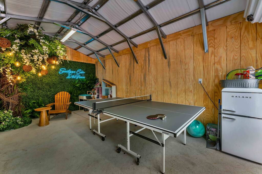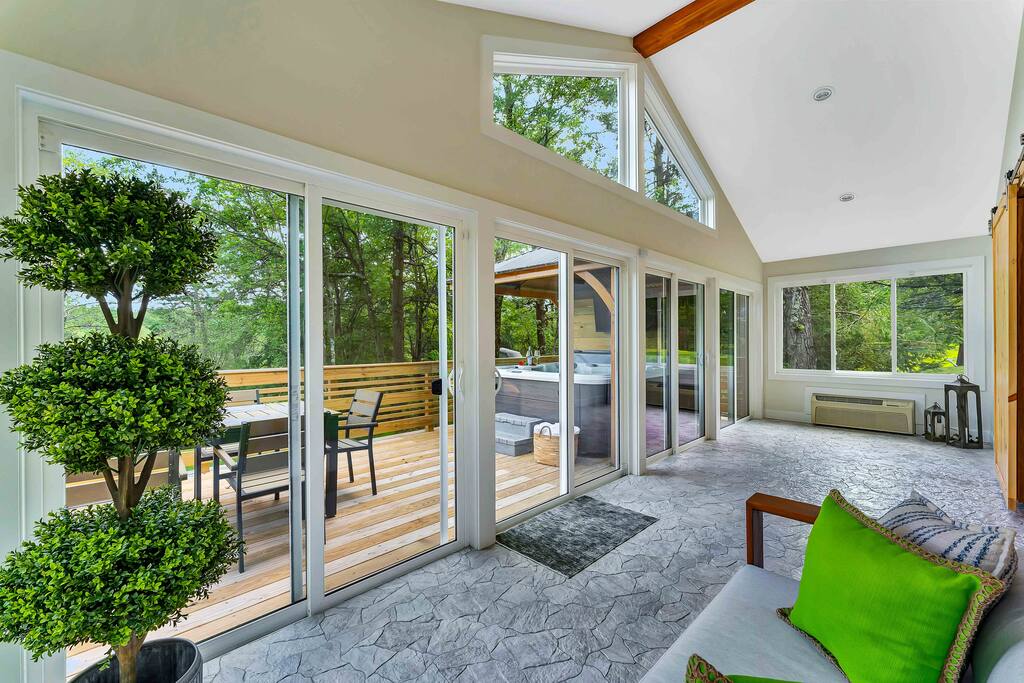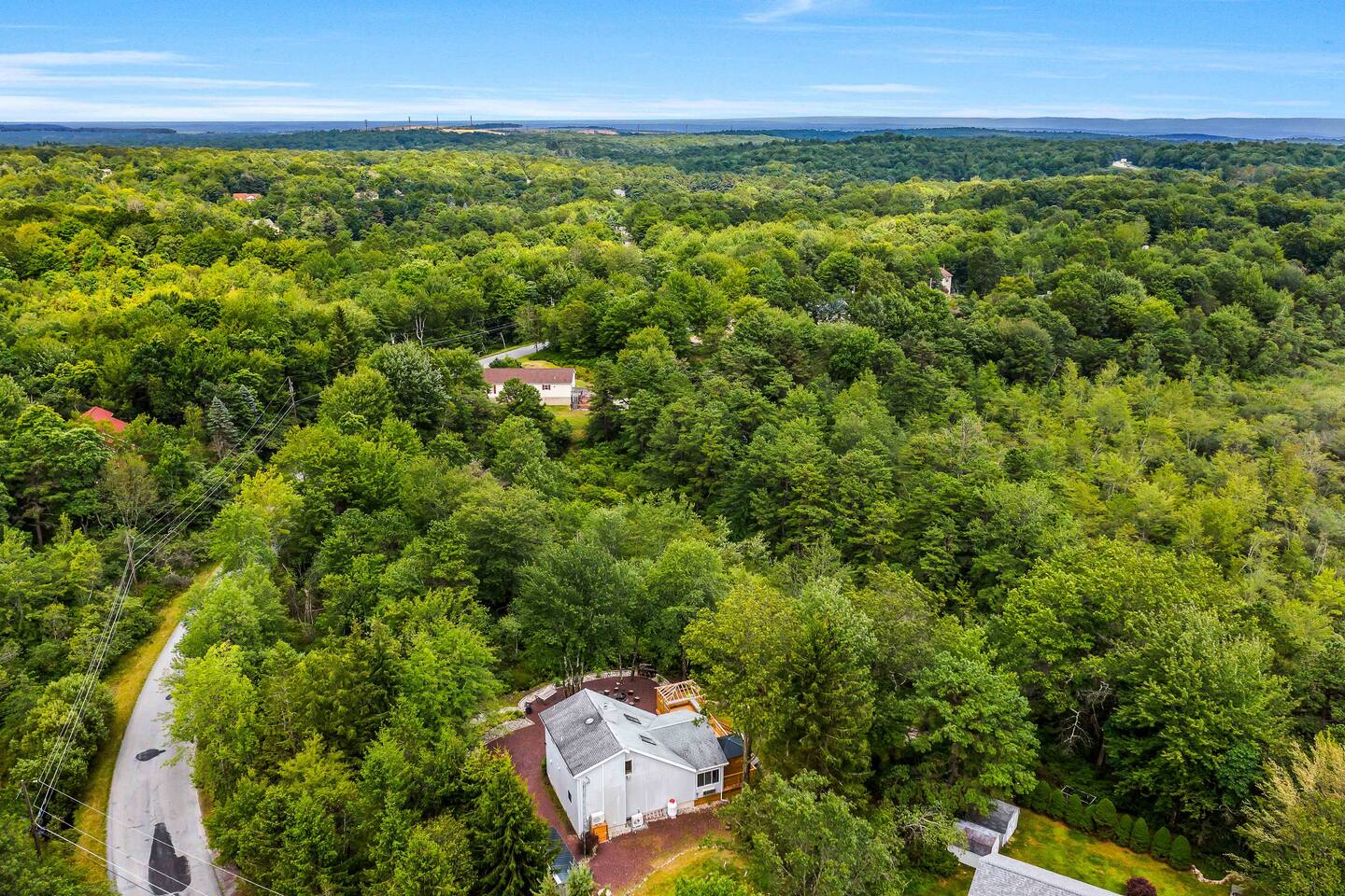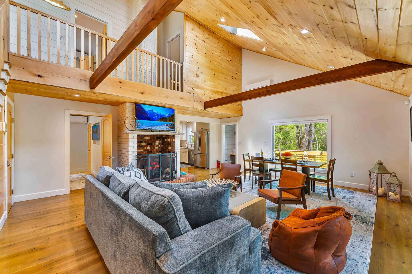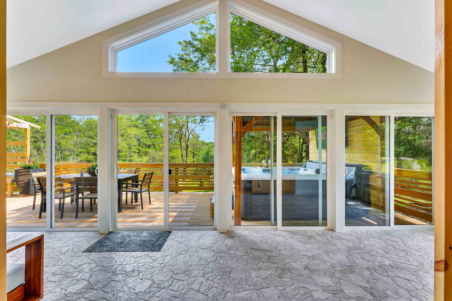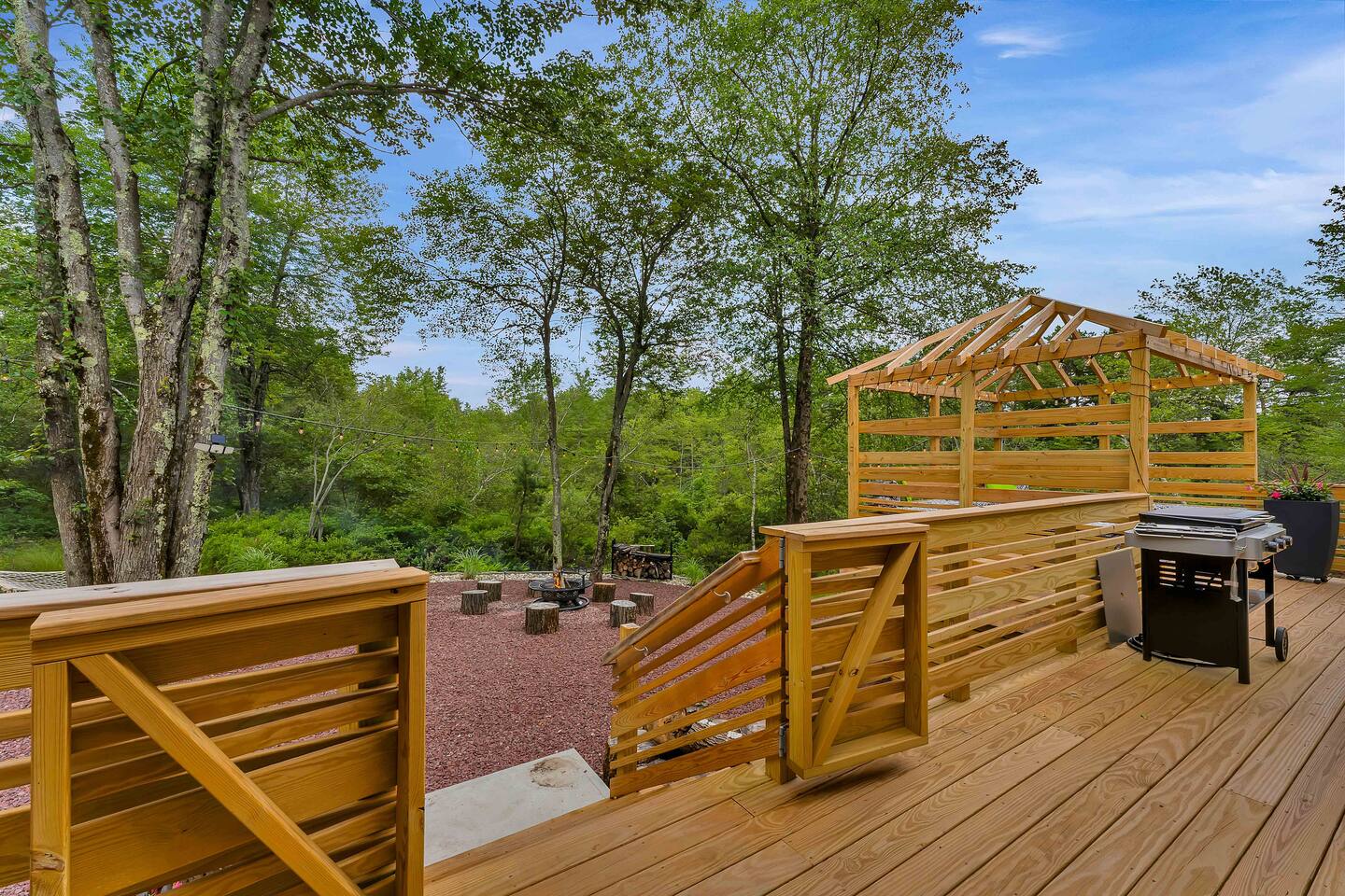 Welcome to Summitgrove Cabin, your modern yet cozy Pocono escape where comfort meets fun. MAIN LEVEL Step into a bright foyer that opens into the heart of the home. To the right, you’ll find a fully equipped kitchen, perfect for preparing family meals. Next to it is a full bathroom with a shower and a washer/dryer for your convenience. To the left, enjoy the open-concept living room with a warm electric fireplace and dining area. Off the living room is Bedroom 1, featuring a queen bed and closet space. A charming sunroom with heated floors invites you to relax, and from here you can step right onto the deck where the hot tub and outdoor entertainment await. UPPER LEVEL Upstairs, you’ll find two more bedrooms and another full bathroom. Bedroom 2 has a queen bed, while Bedroom 3 is designed with kids in mind, offering two twin beds—one styled like a hut and the other a roll-out twin. The full bathroom is shared between both bedrooms and can be accessed directly from either room. OUTDOOR LIVING The spacious deck is a highlight, complete with an electric hot tub under a covered roof with an outdoor TV, perfect for soaking and watching a movie. There’s also a dining table, BBQ flat top grill, and a cozy seating area around a gas firepit. From the deck, stairs lead down to a large green backyard with plenty of space for kids to run and sun lounges for relaxation. To the side, you’ll discover a second firepit for a classic wood-burning campfire experience, a hammock strung beneath glowing string lights, and even a small spring adding a natural touch. GAME ROOM At the end of the driveway, the garage has been transformed into a stylish game room. Challenge friends to a ping pong match or enjoy board games in a fun, relaxed atmosphere. Whether you’re gathering by the fire, soaking in the hot tub, or playing games late into the night, Summitgrove Cabin offers the perfect Pocono getaway.