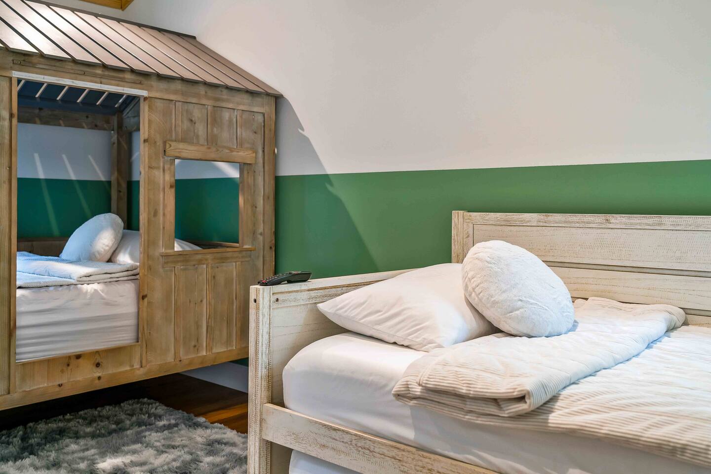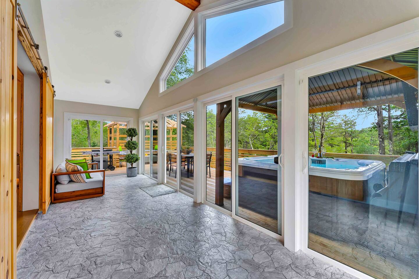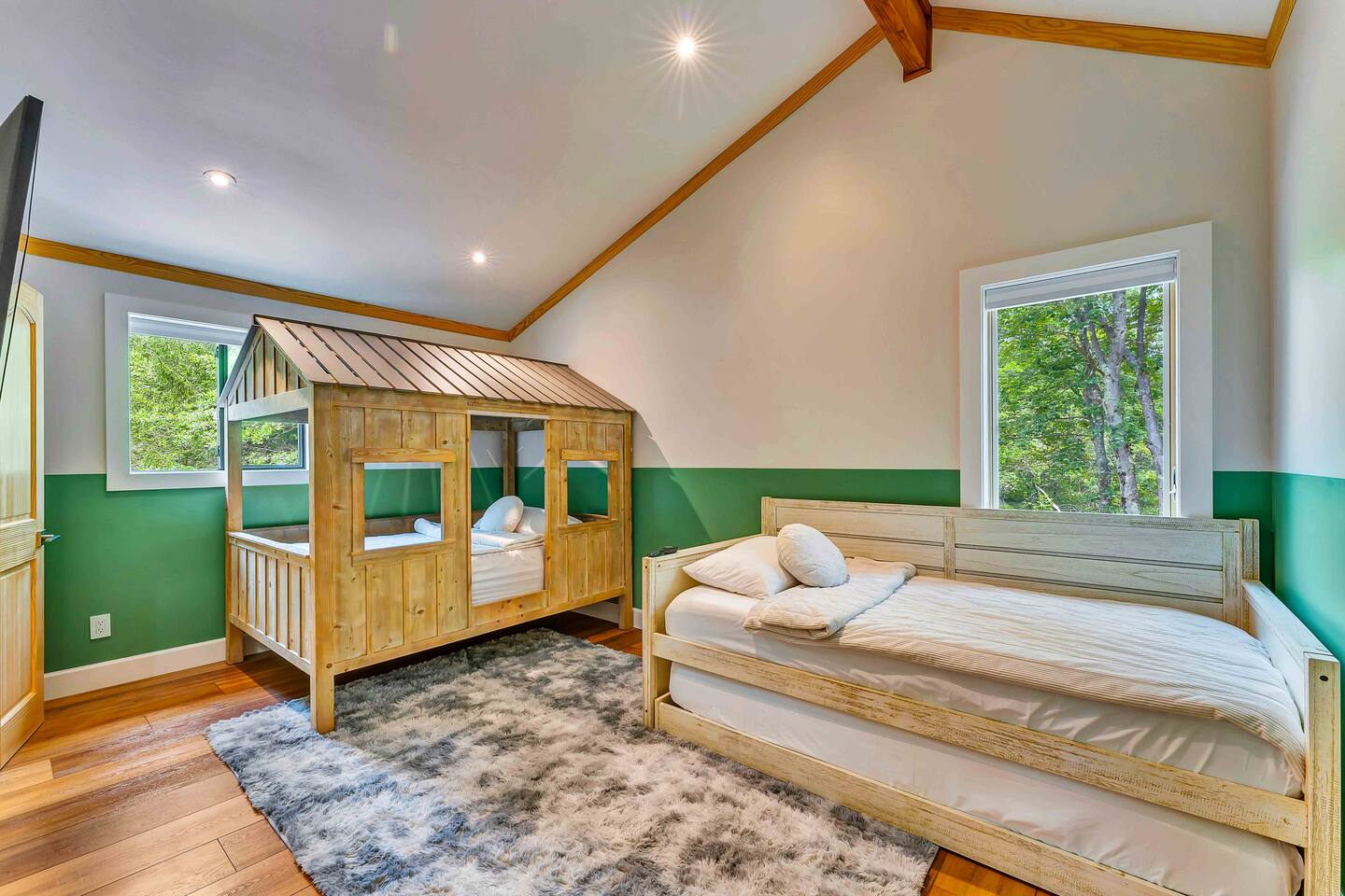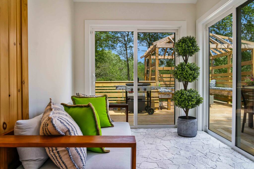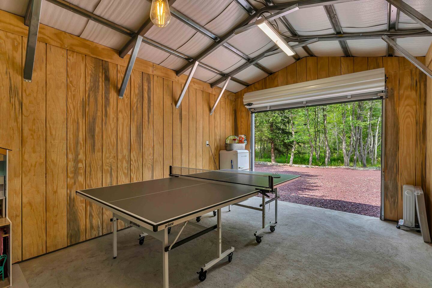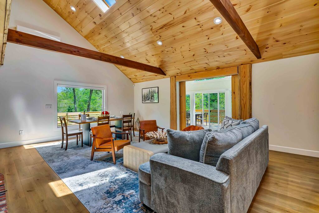 Welcome to Summitgrove Cabin, your modern yet cozy Pocono escape where comfort meets fun. MAIN LEVEL Step into a bright foyer that opens into the heart of the home. To the right, you’ll find a fully equipped kitchen, perfect for preparing family meals. Next to it is a full bathroom with a shower and a washer/dryer for your convenience. To the left, enjoy the open-concept living room with a warm electric fireplace and dining area. Off the living room is Bedroom 1, featuring a queen bed and closet space. A charming sunroom with heated floors invites you to relax, and from here you can step right onto the deck where the hot tub and outdoor entertainment await. UPPER LEVEL Upstairs, you’ll find two more bedrooms and another full bathroom. Bedroom 2 has a queen bed, while Bedroom 3 is designed with kids in mind, offering two twin beds—one styled like a hut and the other a roll-out twin. The full bathroom is shared between both bedrooms and can be accessed directly from either room. OUTDOOR LIVING The spacious deck is a highlight, complete with an electric hot tub under a covered roof with an outdoor TV, perfect for soaking and watching a movie. There’s also a dining table, BBQ flat top grill, and a cozy seating area around a gas firepit. From the deck, stairs lead down to a large green backyard with plenty of space for kids to run and sun lounges for relaxation. To the side, you’ll discover a second firepit for a classic wood-burning campfire experience, a hammock strung beneath glowing string lights, and even a small spring adding a natural touch. GAME ROOM At the end of the driveway, the garage has been transformed into a stylish game room. Challenge friends to a ping pong match or enjoy board games in a fun, relaxed atmosphere. Whether you’re gathering by the fire, soaking in the hot tub, or playing games late into the night, Summitgrove Cabin offers the perfect Pocono getaway.