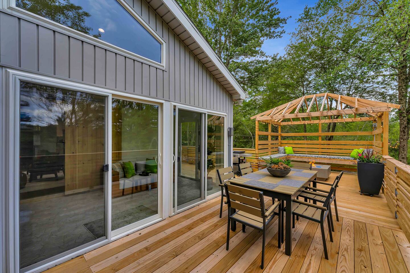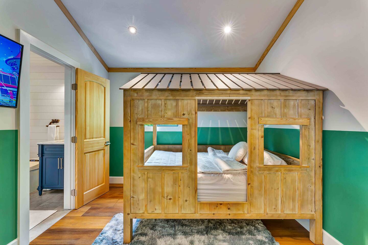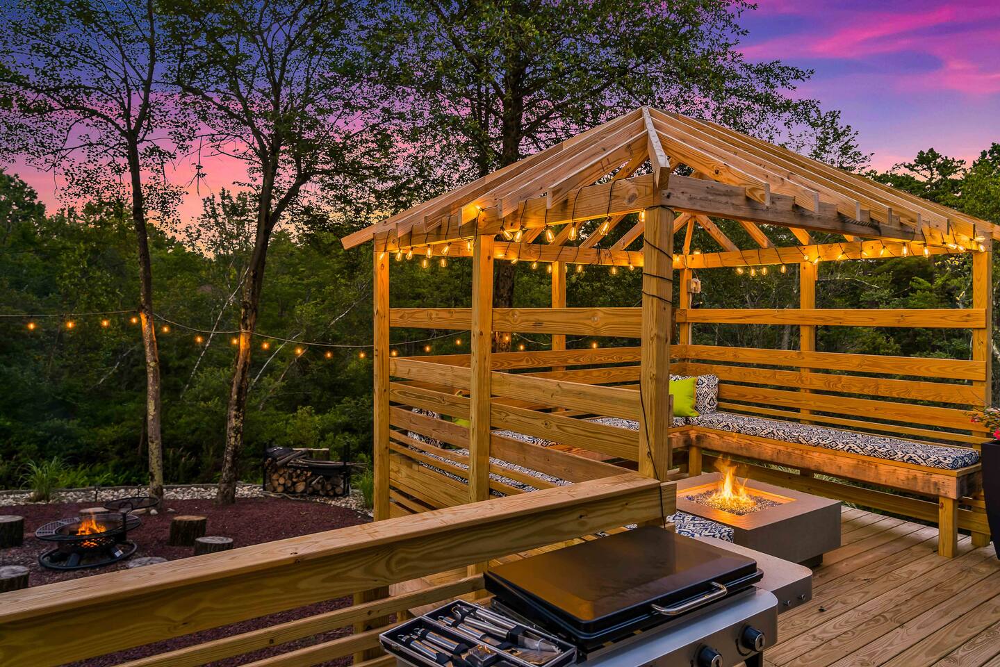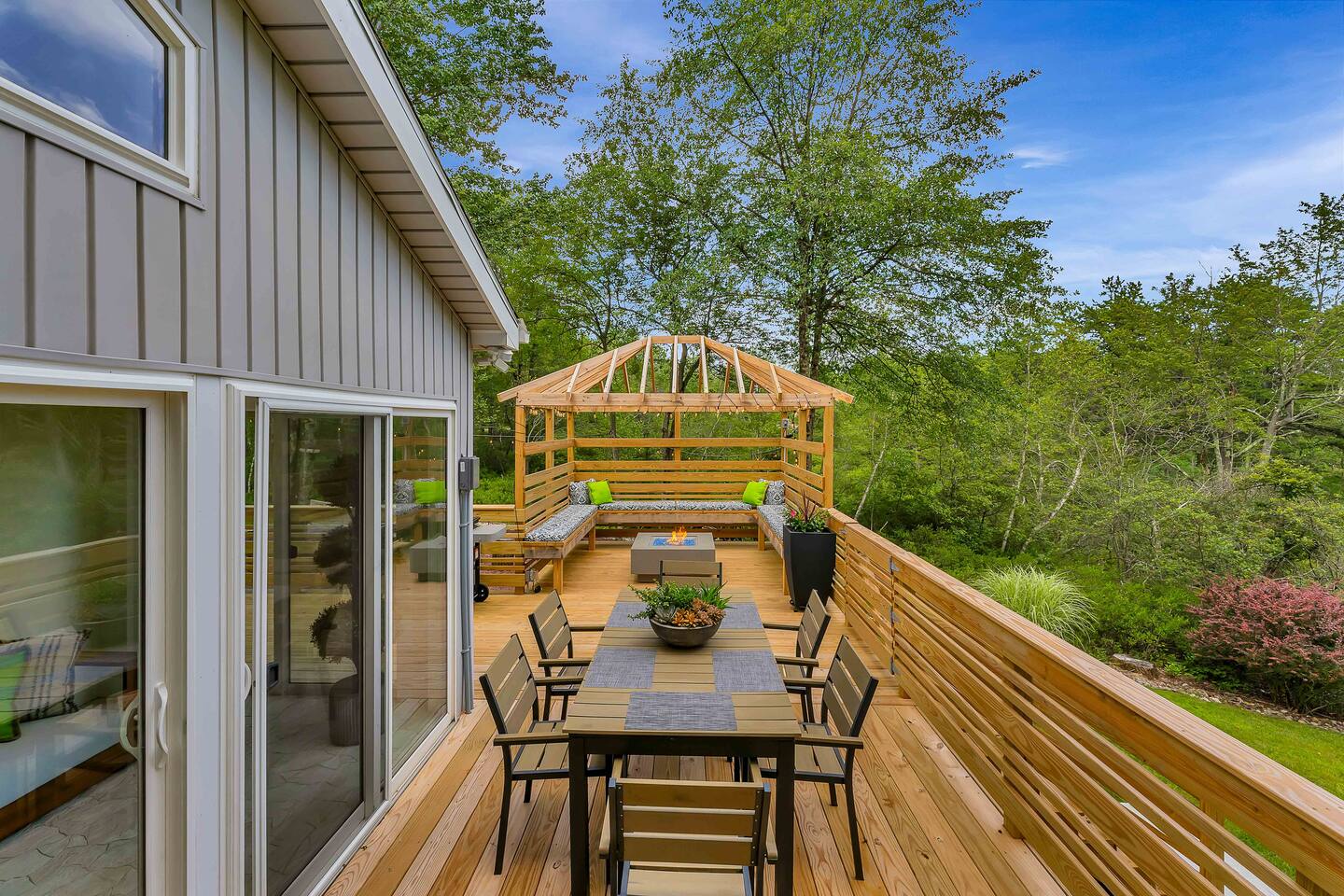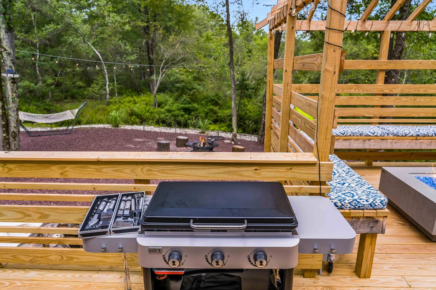Welcome to Summitgrove Cabin, your modern yet cozy Pocono escape where comfort meets fun. MAIN LEVEL Step into a bright foyer that opens into the heart of the home. To the right, you’ll find a fully equipped kitchen, perfect for preparing family meals. Next to it is a full bathroom with a shower and a washer/dryer for your convenience. To the left, enjoy the open-concept living room with a warm electric fireplace and dining area. Off the living room is Bedroom 1, featuring a queen bed and closet space. A charming sunroom with heated floors invites you to relax, and from here you can step right onto the deck where the hot tub and outdoor entertainment await. UPPER LEVEL Upstairs, you’ll find two more bedrooms and another full bathroom. Bedroom 2 has a queen bed, while Bedroom 3 is designed with kids in mind, offering two twin beds—one styled like a hut and the other a roll-out twin. The full bathroom is shared between both bedrooms and can be accessed directly from either room. OUTDOOR LIVING The spacious deck is a highlight, complete with an electric hot tub under a covered roof with an outdoor TV, perfect for soaking and watching a movie. There’s also a dining table, BBQ flat top grill, and a cozy seating area around a gas firepit. From the deck, stairs lead down to a large green backyard with plenty of space for kids to run and sun lounges for relaxation. To the side, you’ll discover a second firepit for a classic wood-burning campfire experience, a hammock strung beneath glowing string lights, and even a small spring adding a natural touch. GAME ROOM At the end of the driveway, the garage has been transformed into a stylish game room. Challenge friends to a ping pong match or enjoy board games in a fun, relaxed atmosphere. Whether you’re gathering by the fire, soaking in the hot tub, or playing games late into the night, Summitgrove Cabin offers the perfect Pocono getaway.