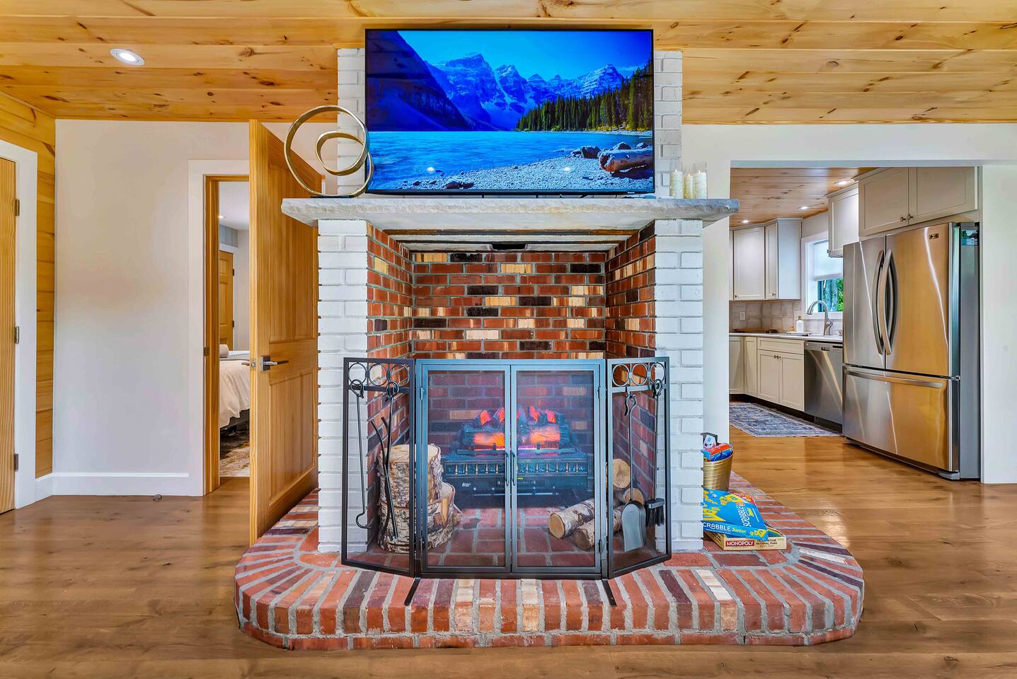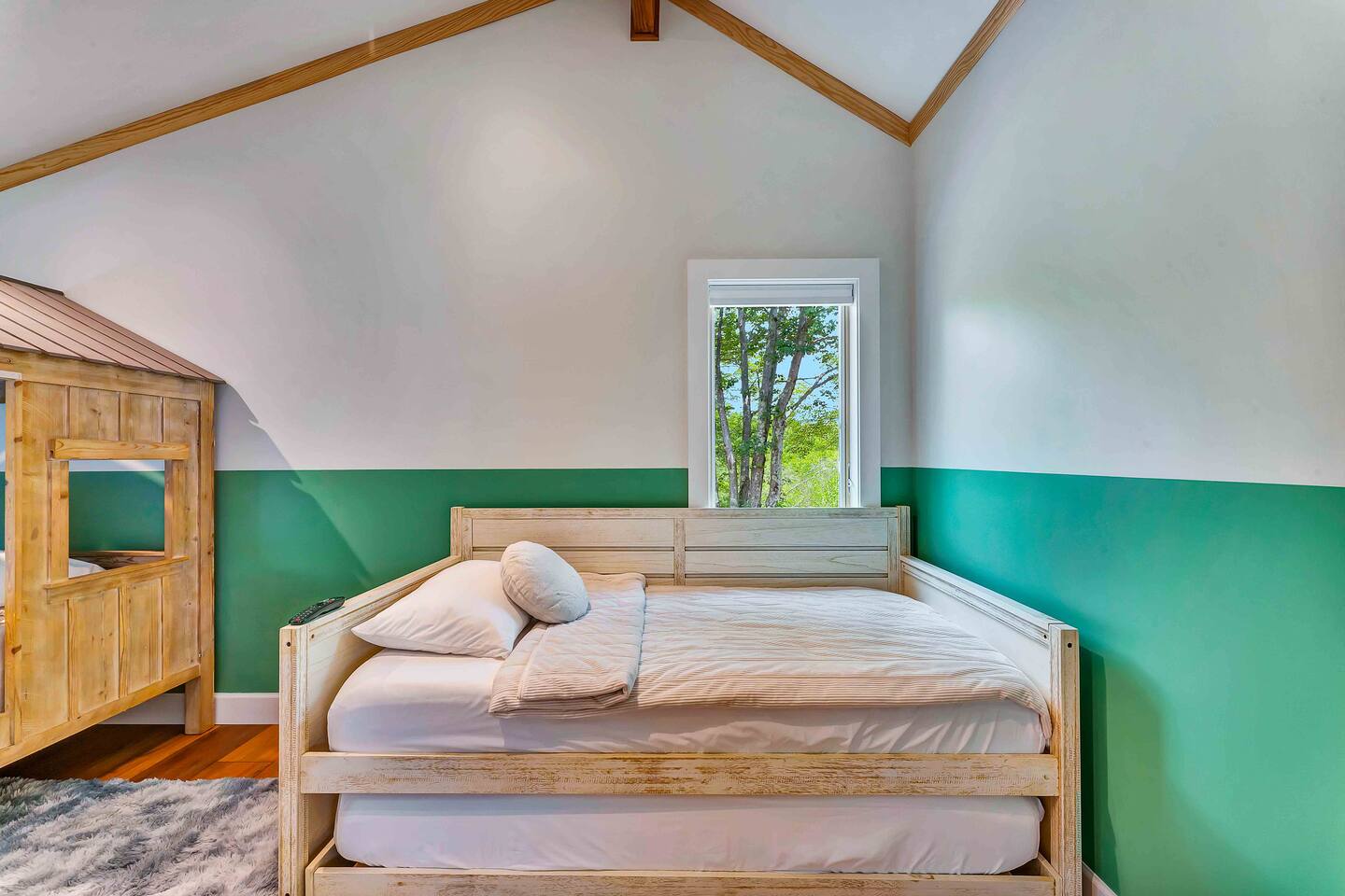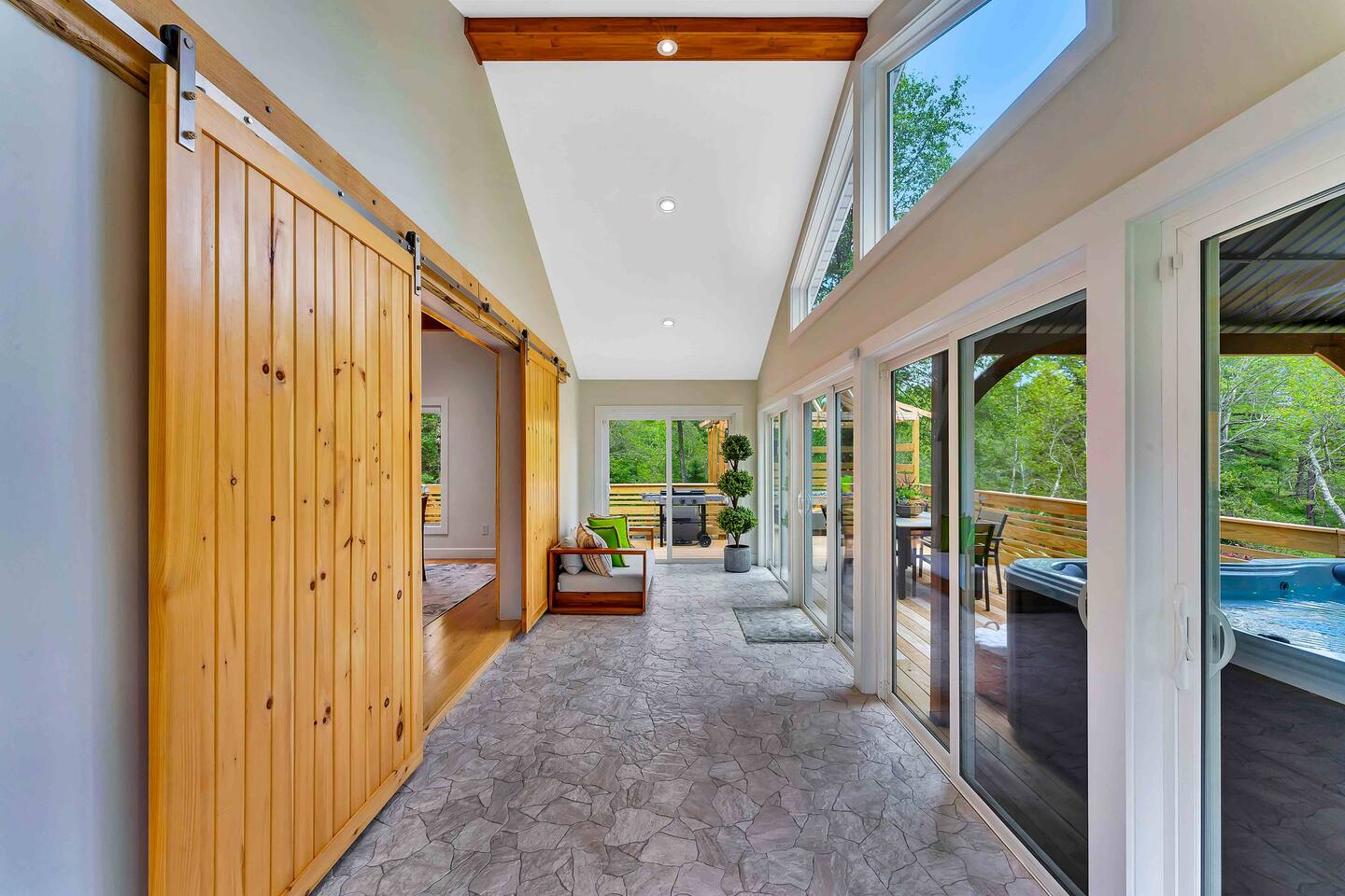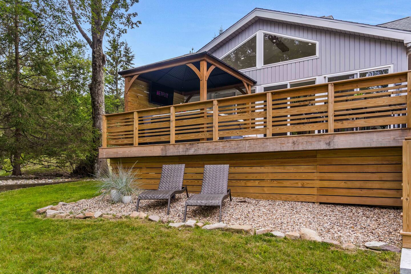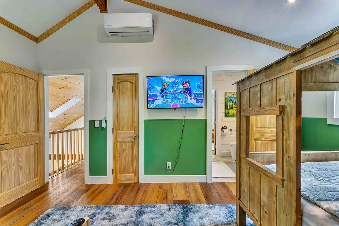 Welcome to Summitgrove Cabin, your modern yet cozy Pocono escape where comfort meets fun. MAIN LEVEL Step into a bright foyer that opens into the heart of the home. To the right, you’ll find a fully equipped kitchen, perfect for preparing family meals. Next to it is a full bathroom with a shower and a washer/dryer for your convenience. To the left, enjoy the open-concept living room with a warm electric fireplace and dining area. Off the living room is Bedroom 1, featuring a queen bed and closet space. A charming sunroom with heated floors invites you to relax, and from here you can step right onto the deck where the hot tub and outdoor entertainment await. UPPER LEVEL Upstairs, you’ll find two more bedrooms and another full bathroom. Bedroom 2 has a queen bed, while Bedroom 3 is designed with kids in mind, offering two twin beds—one styled like a hut and the other a roll-out twin. The full bathroom is shared between both bedrooms and can be accessed directly from either room. OUTDOOR LIVING The spacious deck is a highlight, complete with an electric hot tub under a covered roof with an outdoor TV, perfect for soaking and watching a movie. There’s also a dining table, BBQ flat top grill, and a cozy seating area around a gas firepit. From the deck, stairs lead down to a large green backyard with plenty of space for kids to run and sun lounges for relaxation. To the side, you’ll discover a second firepit for a classic wood-burning campfire experience, a hammock strung beneath glowing string lights, and even a small spring adding a natural touch. GAME ROOM At the end of the driveway, the garage has been transformed into a stylish game room. Challenge friends to a ping pong match or enjoy board games in a fun, relaxed atmosphere. Whether you’re gathering by the fire, soaking in the hot tub, or playing games late into the night, Summitgrove Cabin offers the perfect Pocono getaway.