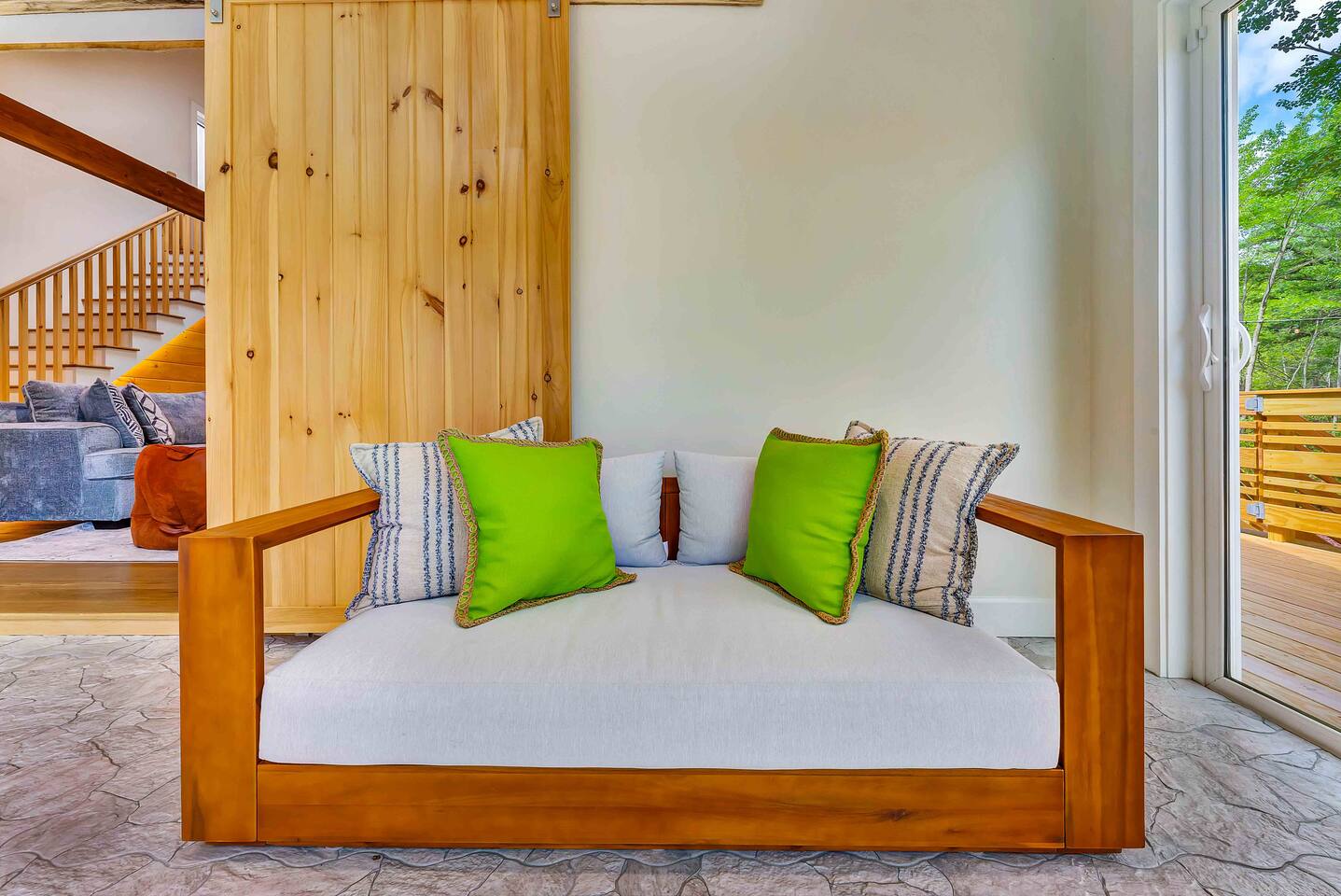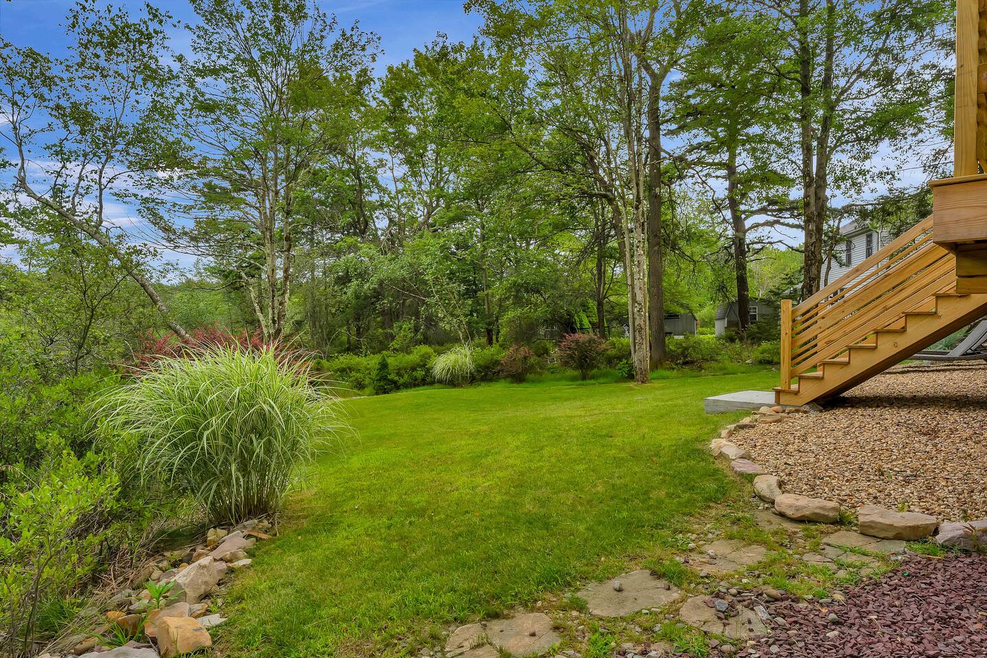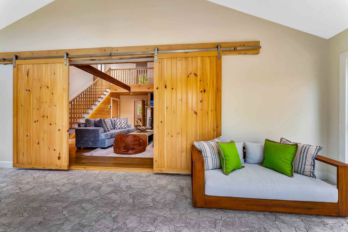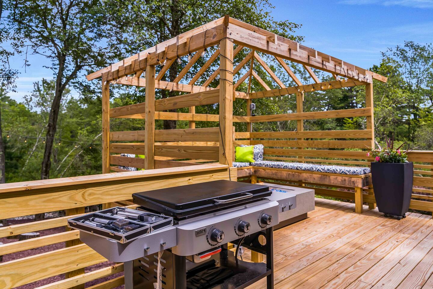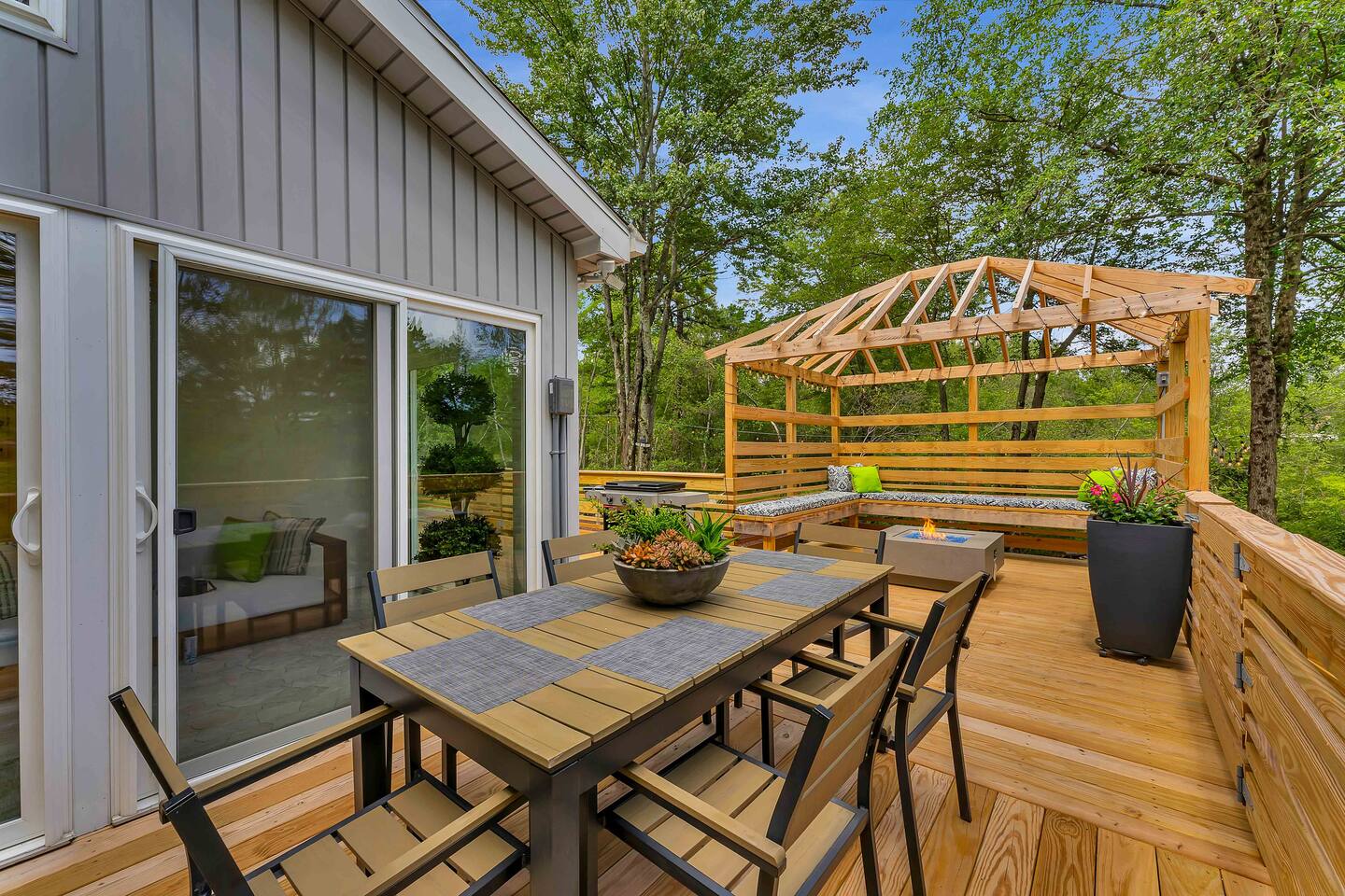 Welcome to Summitgrove Cabin, your modern yet cozy Pocono escape where comfort meets fun. MAIN LEVEL Step into a bright foyer that opens into the heart of the home. To the right, you’ll find a fully equipped kitchen, perfect for preparing family meals. Next to it is a full bathroom with a shower and a washer/dryer for your convenience. To the left, enjoy the open-concept living room with a warm electric fireplace and dining area. Off the living room is Bedroom 1, featuring a queen bed and closet space. A charming sunroom with heated floors invites you to relax, and from here you can step right onto the deck where the hot tub and outdoor entertainment await. UPPER LEVEL Upstairs, you’ll find two more bedrooms and another full bathroom. Bedroom 2 has a queen bed, while Bedroom 3 is designed with kids in mind, offering two twin beds—one styled like a hut and the other a roll-out twin. The full bathroom is shared between both bedrooms and can be accessed directly from either room. OUTDOOR LIVING The spacious deck is a highlight, complete with an electric hot tub under a covered roof with an outdoor TV, perfect for soaking and watching a movie. There’s also a dining table, BBQ flat top grill, and a cozy seating area around a gas firepit. From the deck, stairs lead down to a large green backyard with plenty of space for kids to run and sun lounges for relaxation. To the side, you’ll discover a second firepit for a classic wood-burning campfire experience, a hammock strung beneath glowing string lights, and even a small spring adding a natural touch. GAME ROOM At the end of the driveway, the garage has been transformed into a stylish game room. Challenge friends to a ping pong match or enjoy board games in a fun, relaxed atmosphere. Whether you’re gathering by the fire, soaking in the hot tub, or playing games late into the night, Summitgrove Cabin offers the perfect Pocono getaway.
