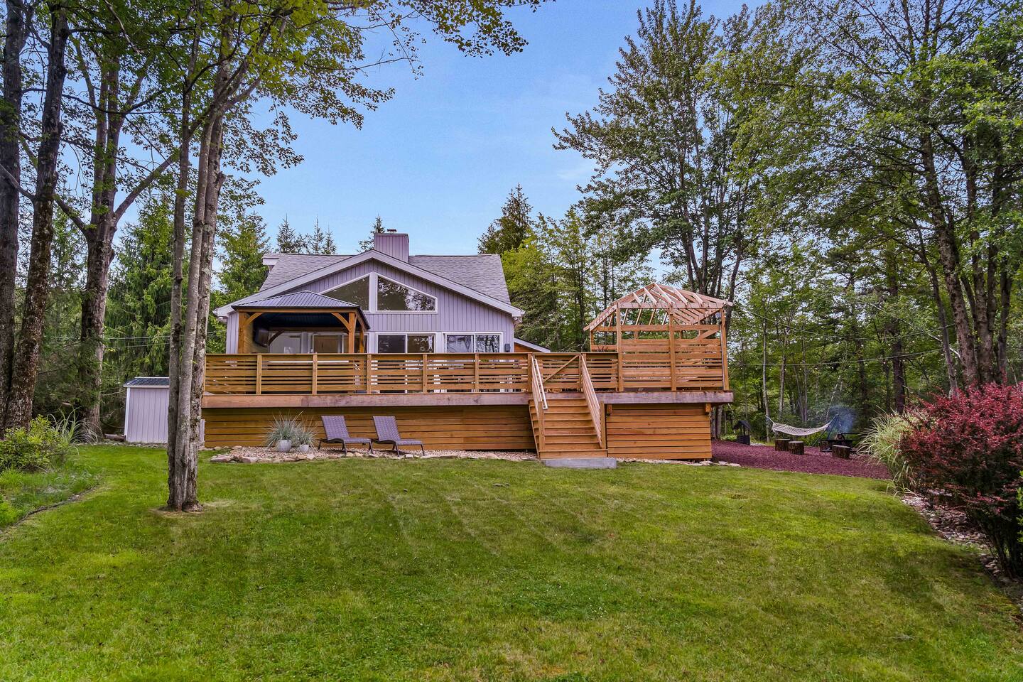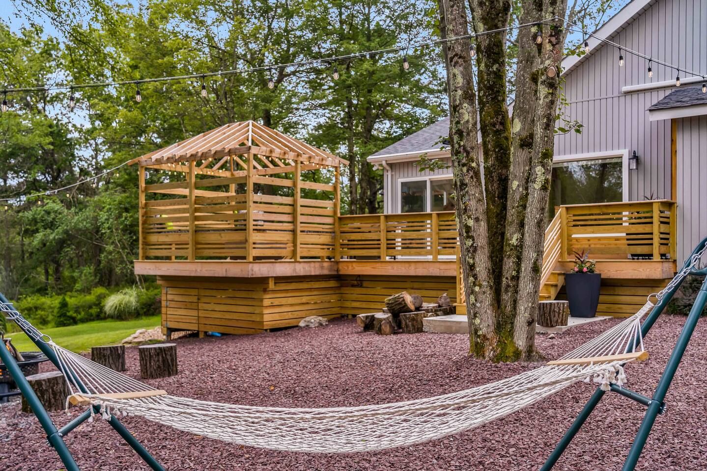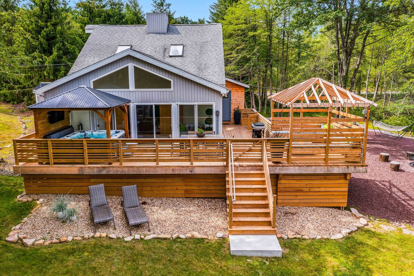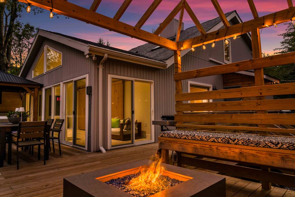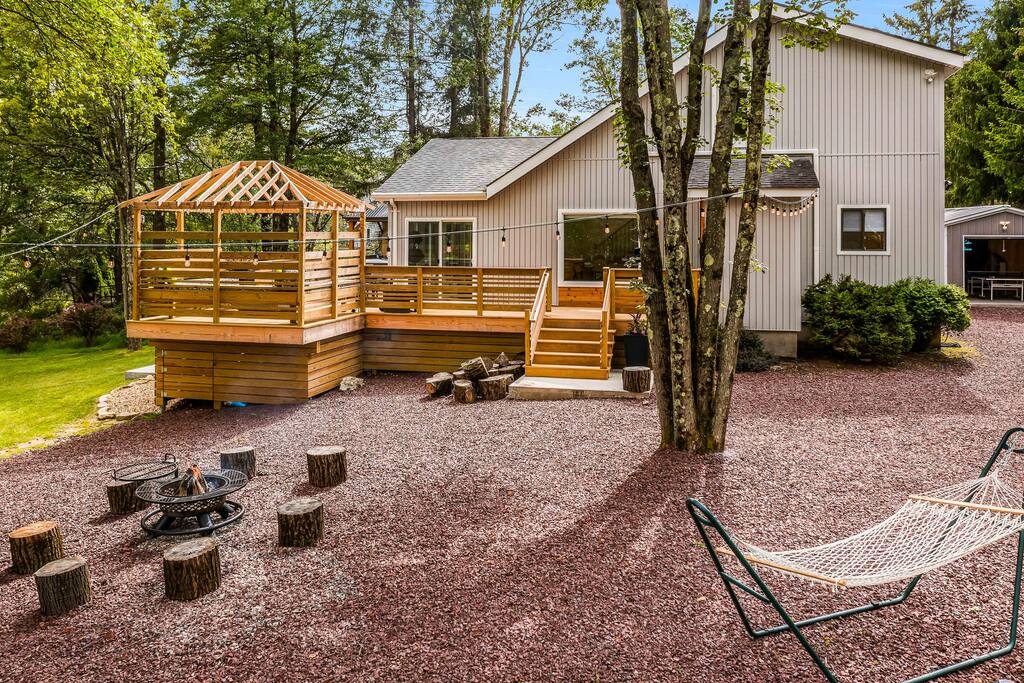Welcome to Summitgrove Cabin in the Poconos! This modern yet cozy 3BR/2BA retreat blends comfort with style, featuring beautiful wood finishes and a warm interior. Step outside to a spacious yard and deck with hot tub, outdoor TV, dining area, BBQ, and gas firepit. Relax on sun lounges, sway in the hammock under string lights, or gather around the real wood firepit. The unique game room offers ping pong and board games. Located in a community with paid amenities, perfect for family fun.