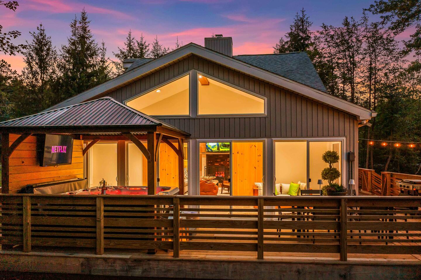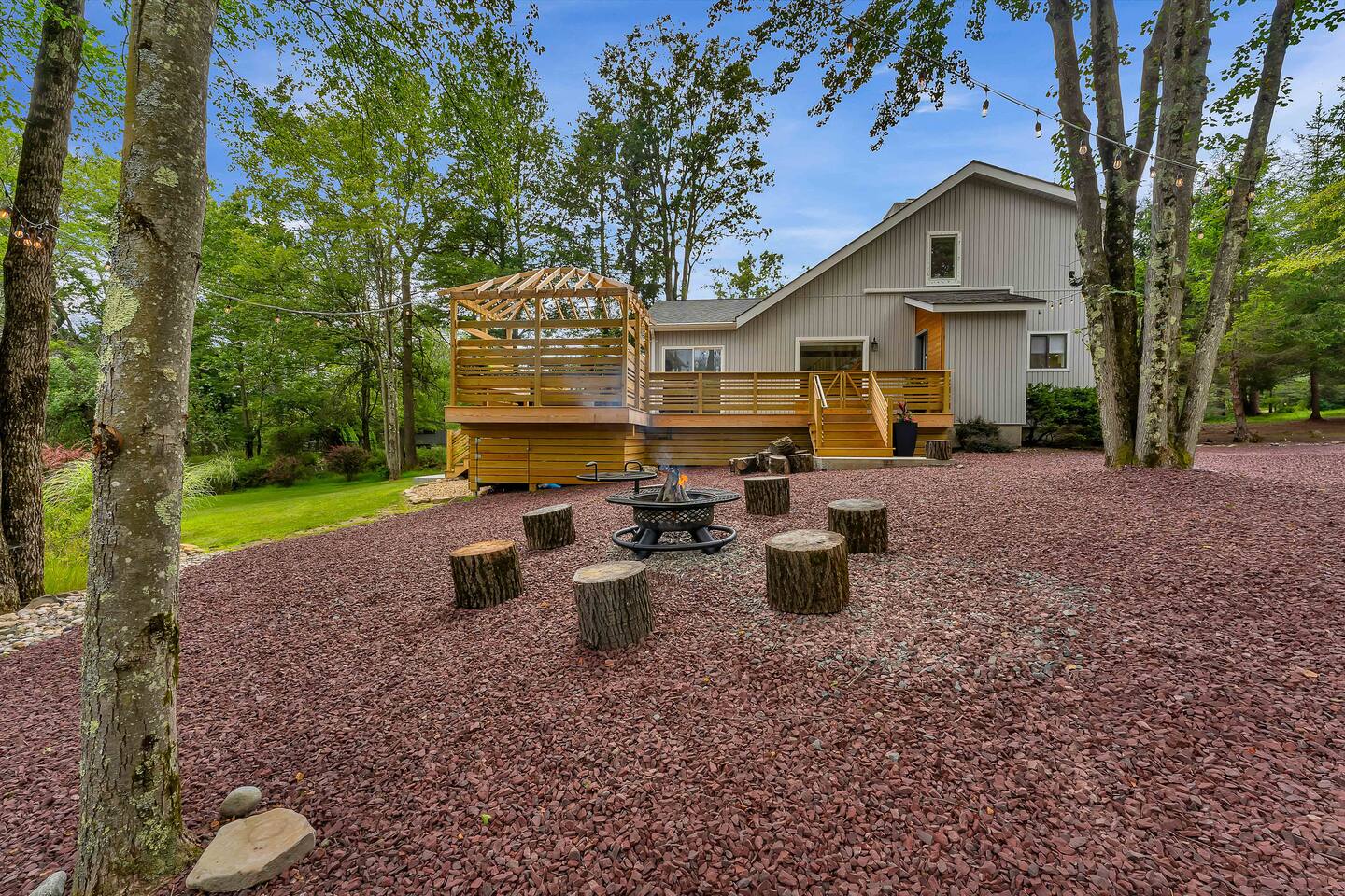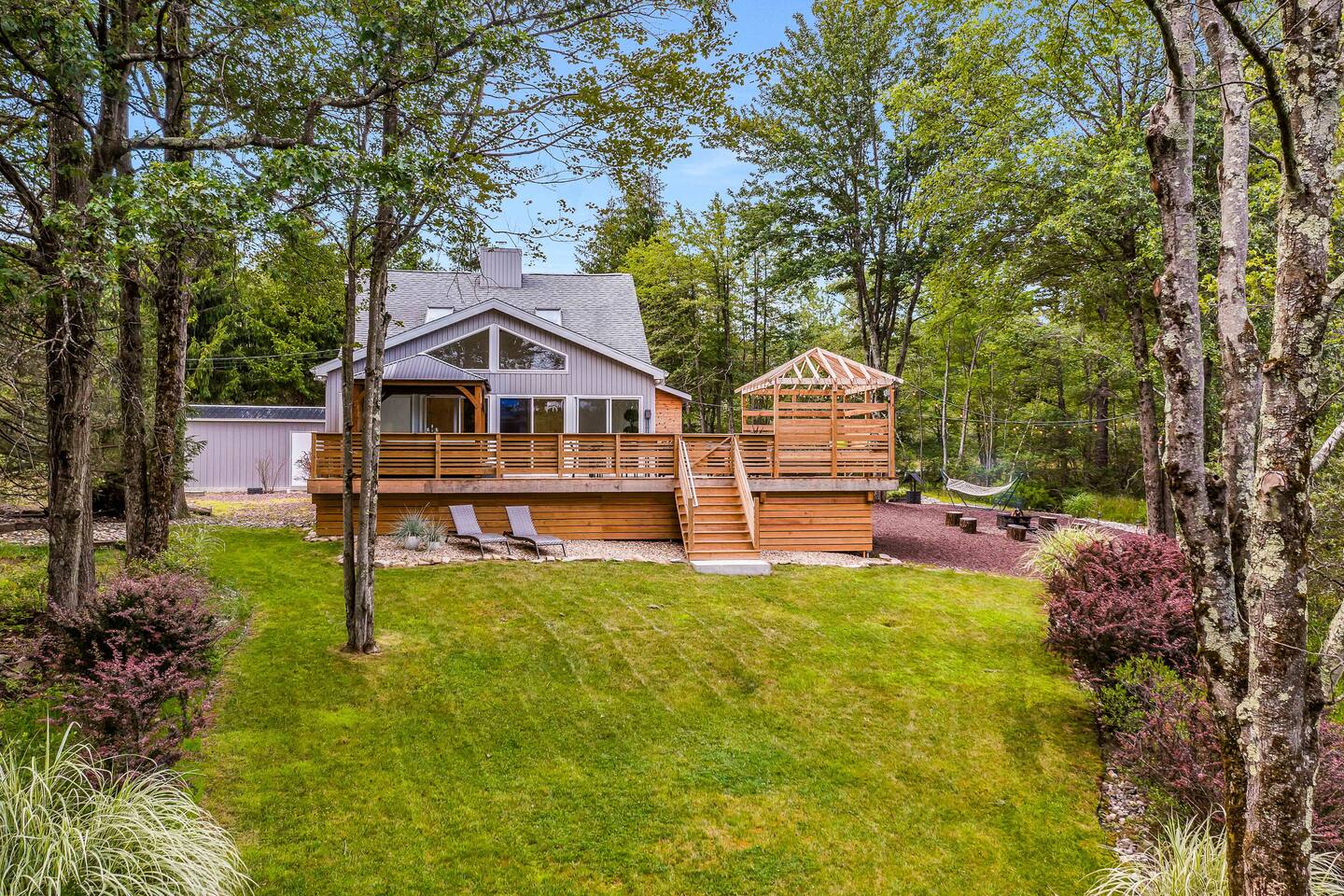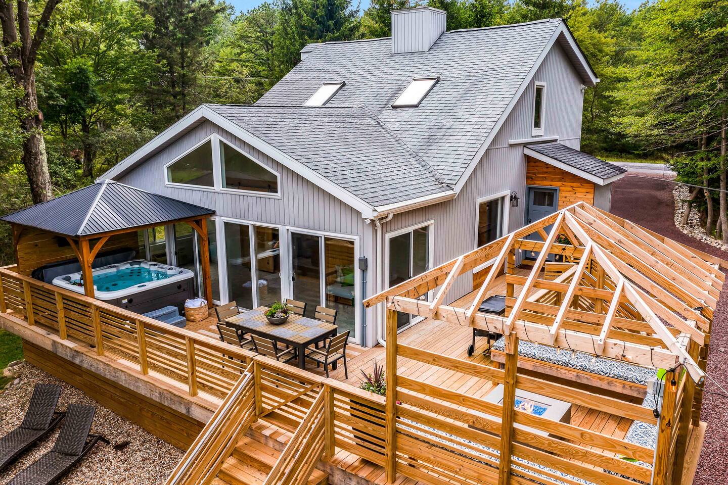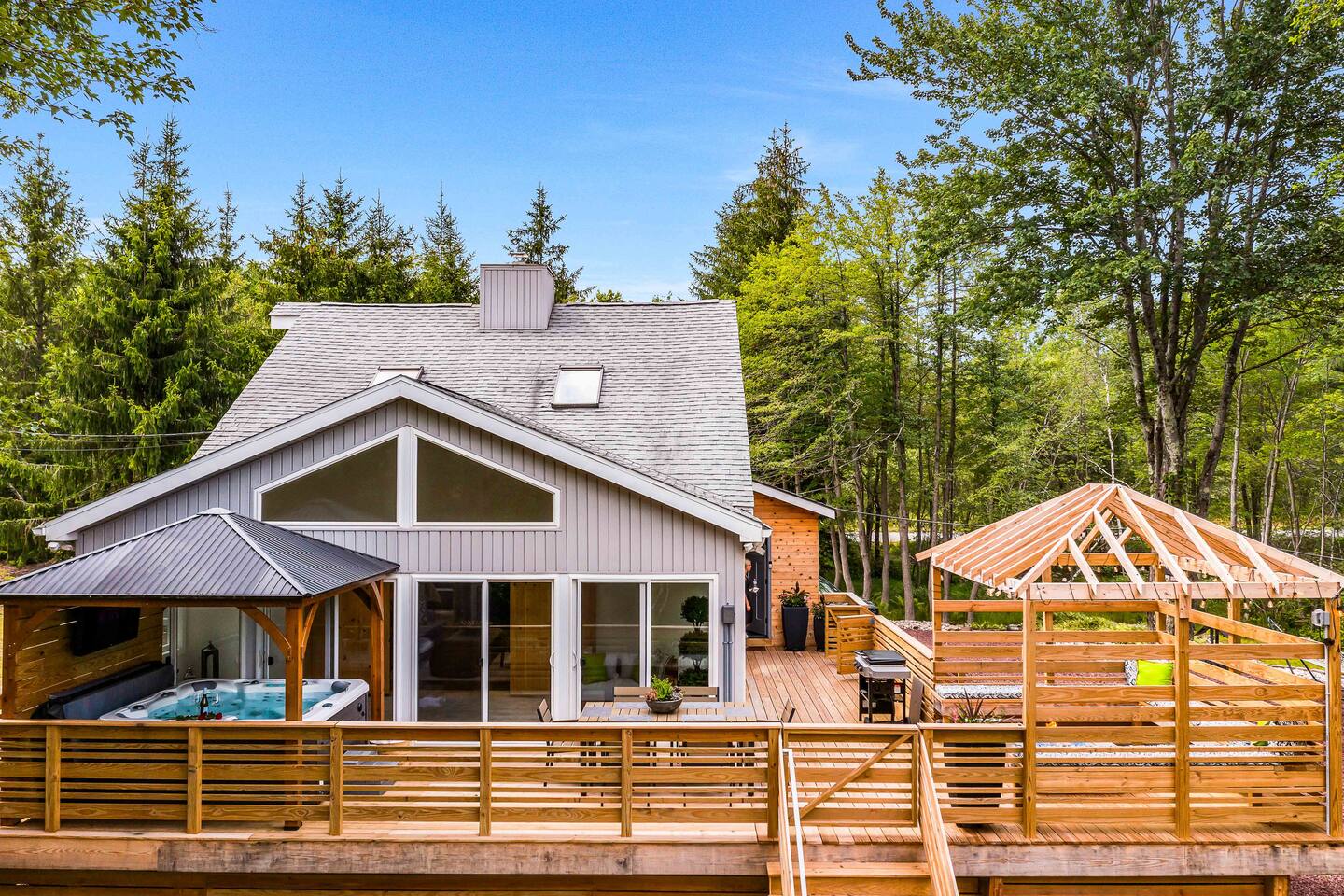 Welcome to Summitgrove Cabin in the Poconos! This modern yet cozy 3BR/2BA retreat blends comfort with style, featuring beautiful wood finishes and a warm interior. Step outside to a spacious yard and deck with hot tub, outdoor TV, dining area, BBQ, and gas firepit. Relax on sun lounges, sway in the hammock under string lights, or gather around the real wood firepit. The unique game room offers ping pong and board games. Located in a community with paid amenities, perfect for family fun.