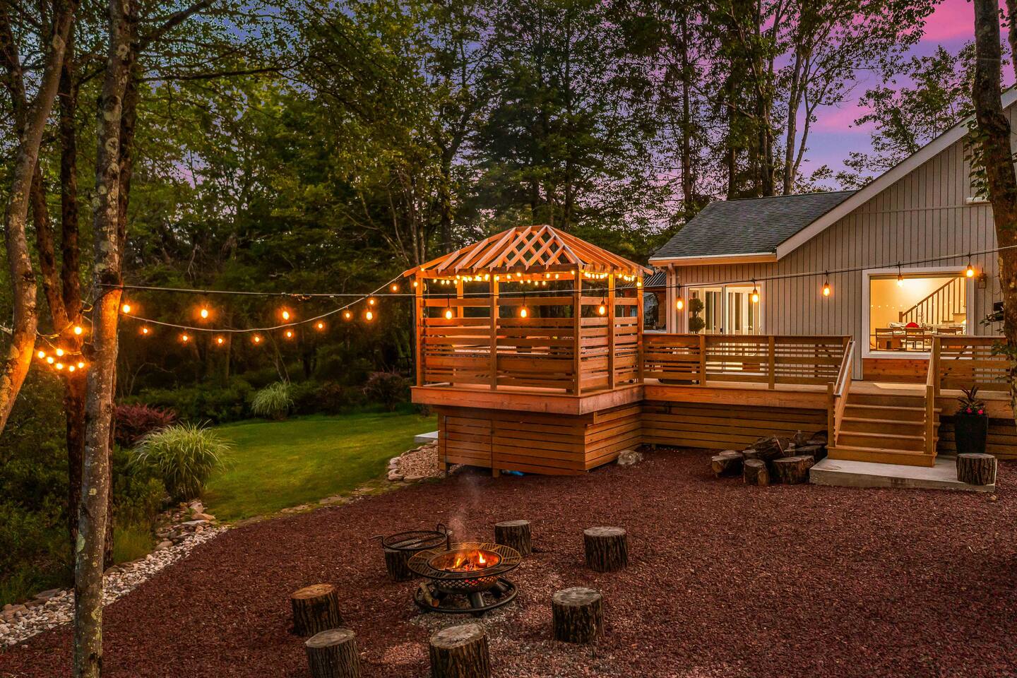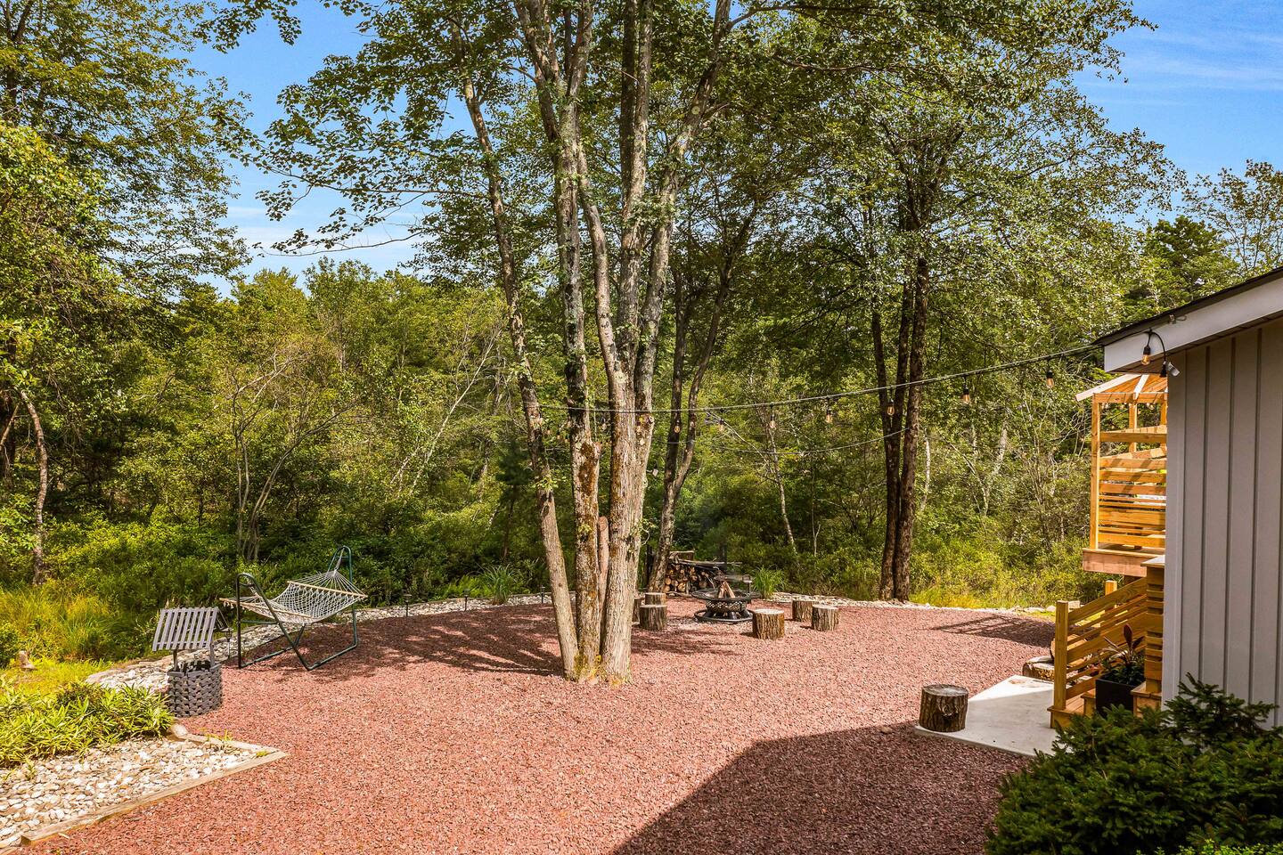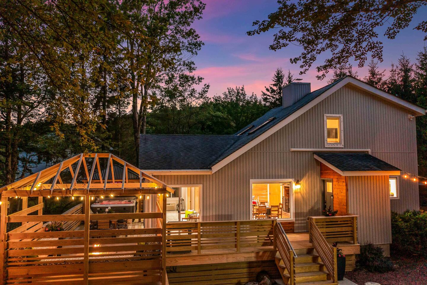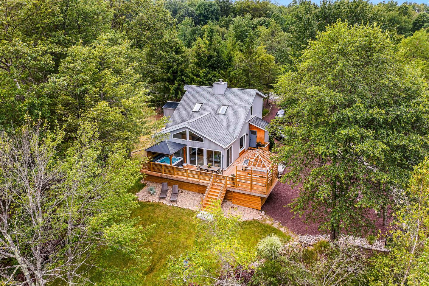 Welcome to Summitgrove Cabin in the Poconos! This modern yet cozy 3BR/2BA retreat blends comfort with style, featuring beautiful wood finishes and a warm interior. Step outside to a spacious yard and deck with hot tub, outdoor TV, dining area, BBQ, and gas firepit. Relax on sun lounges, sway in the hammock under string lights, or gather around the real wood firepit. The unique game room offers ping pong and board games. Located in a community with paid amenities, perfect for family fun.