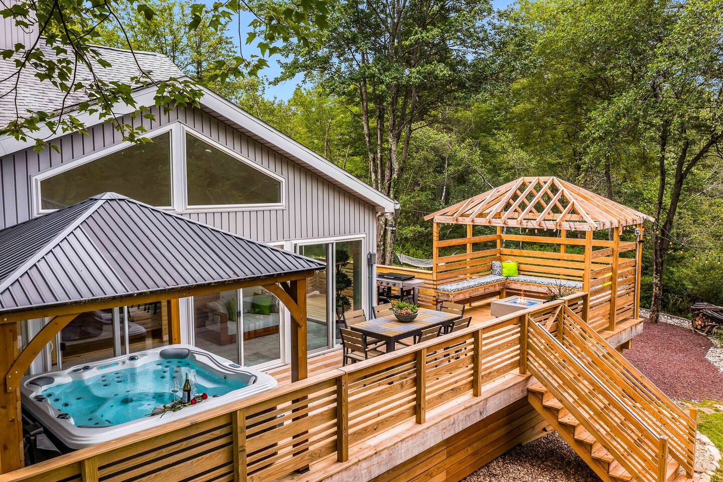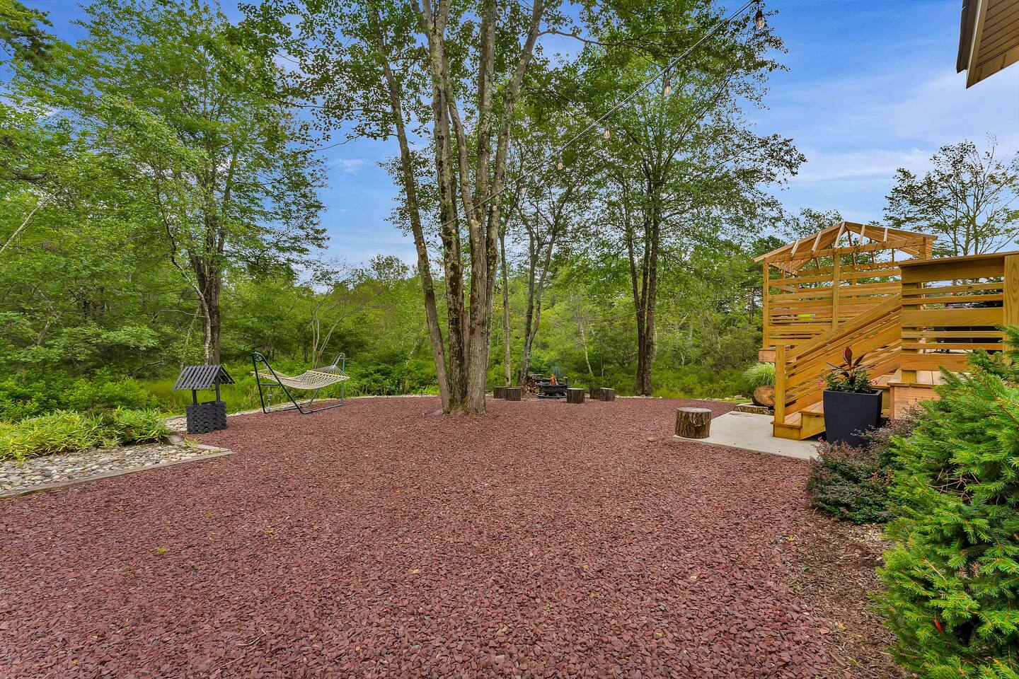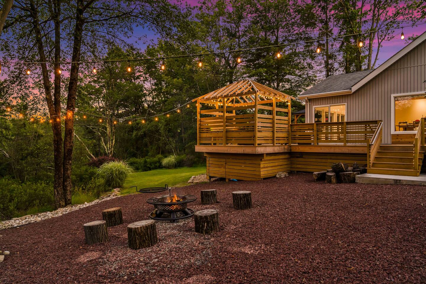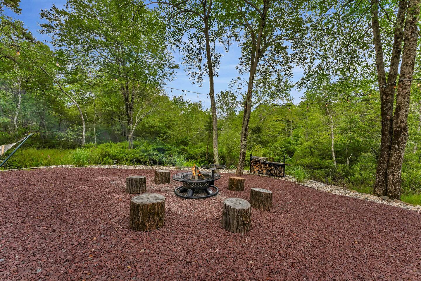 Welcome to Summitgrove Cabin in the Poconos! This modern yet cozy 3BR/2BA retreat blends comfort with style, featuring beautiful wood finishes and a warm interior. Step outside to a spacious yard and deck with hot tub, outdoor TV, dining area, BBQ, and gas firepit. Relax on sun lounges, sway in the hammock under string lights, or gather around the real wood firepit. The unique game room offers ping pong and board games. Located in a community with paid amenities, perfect for family fun.
