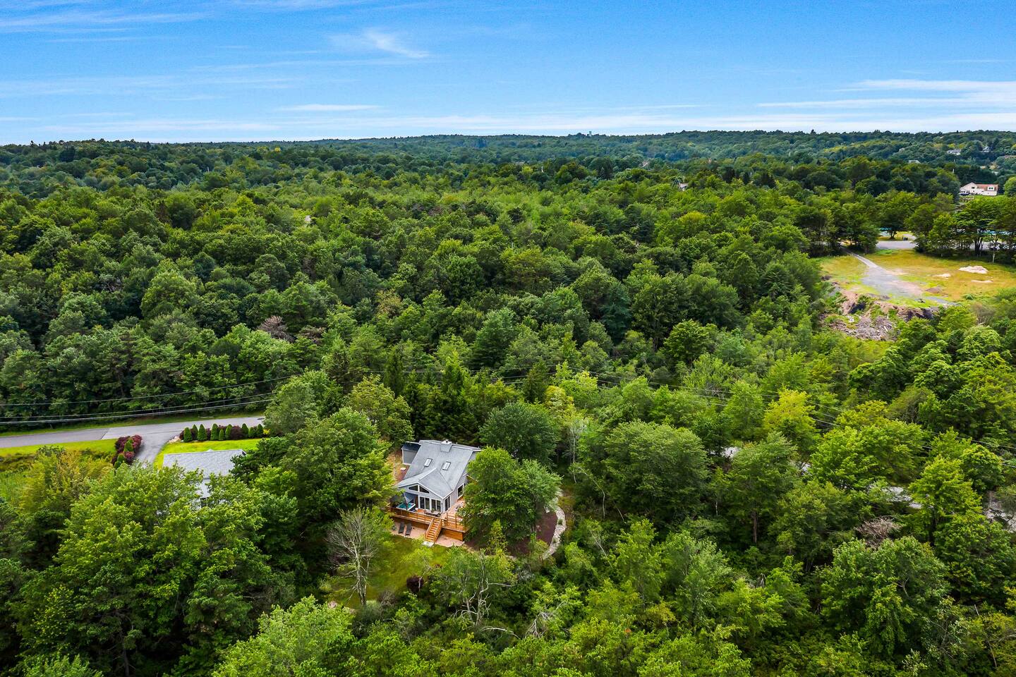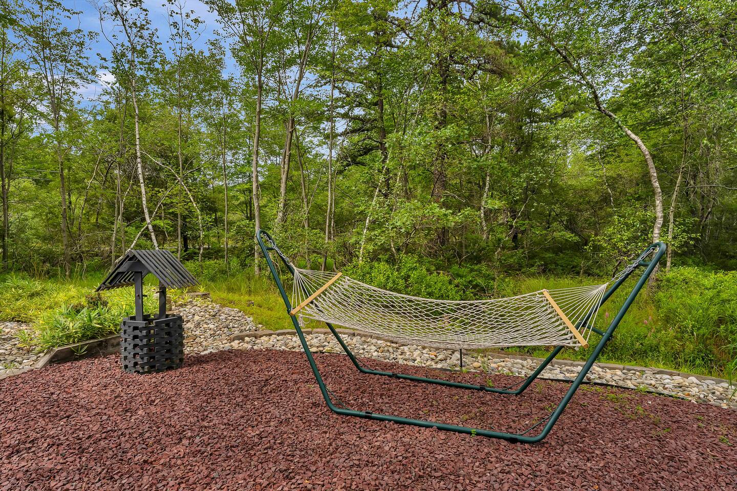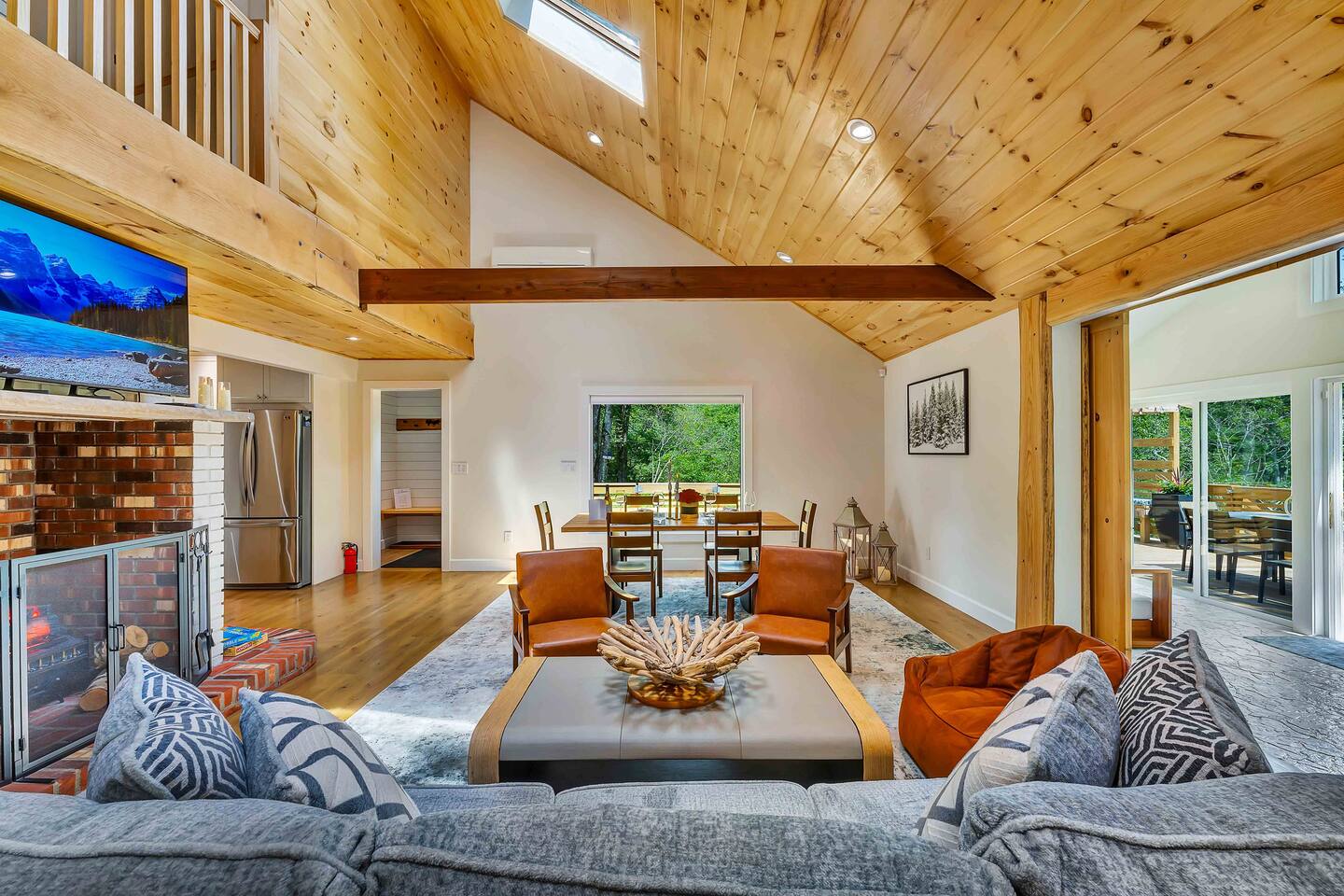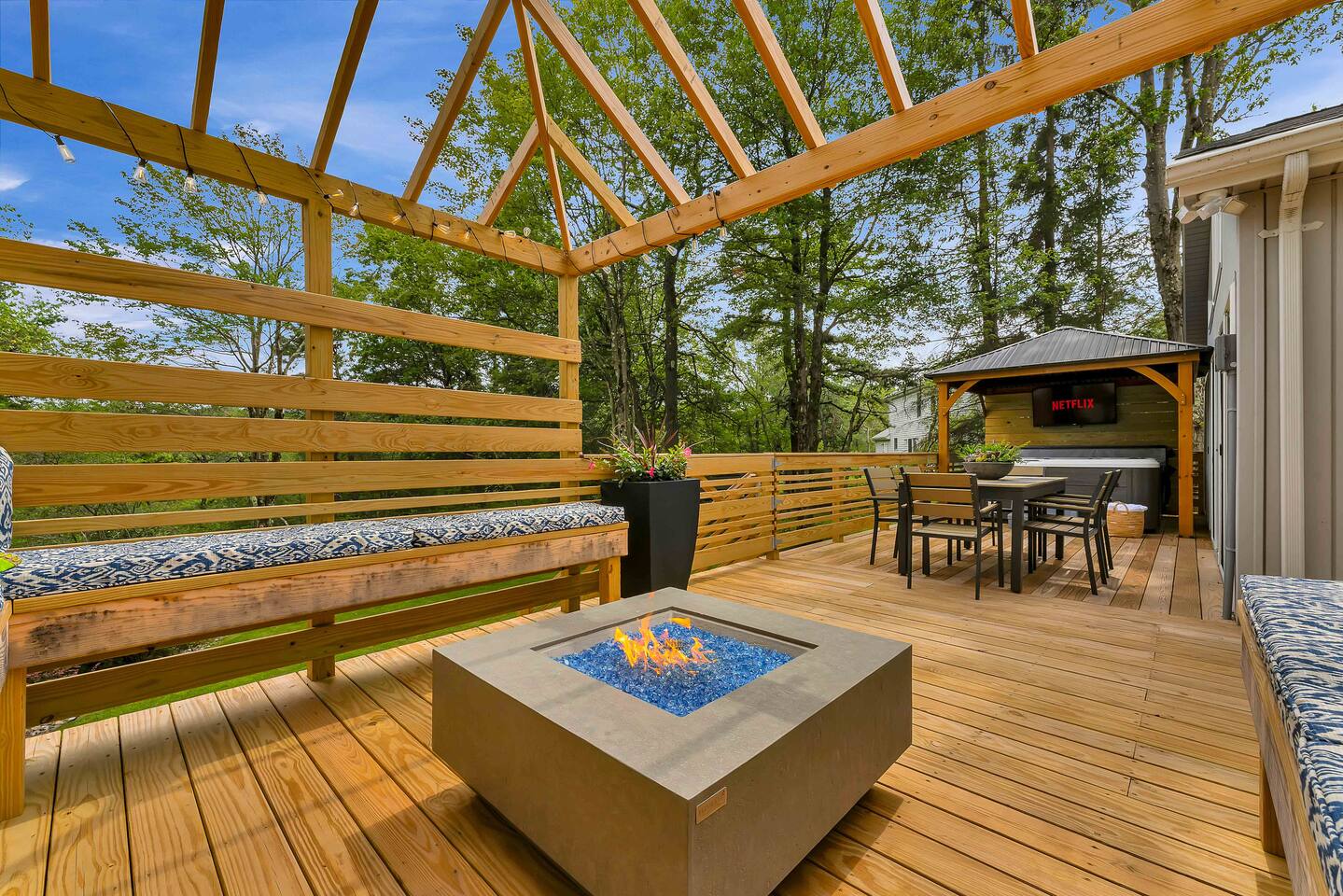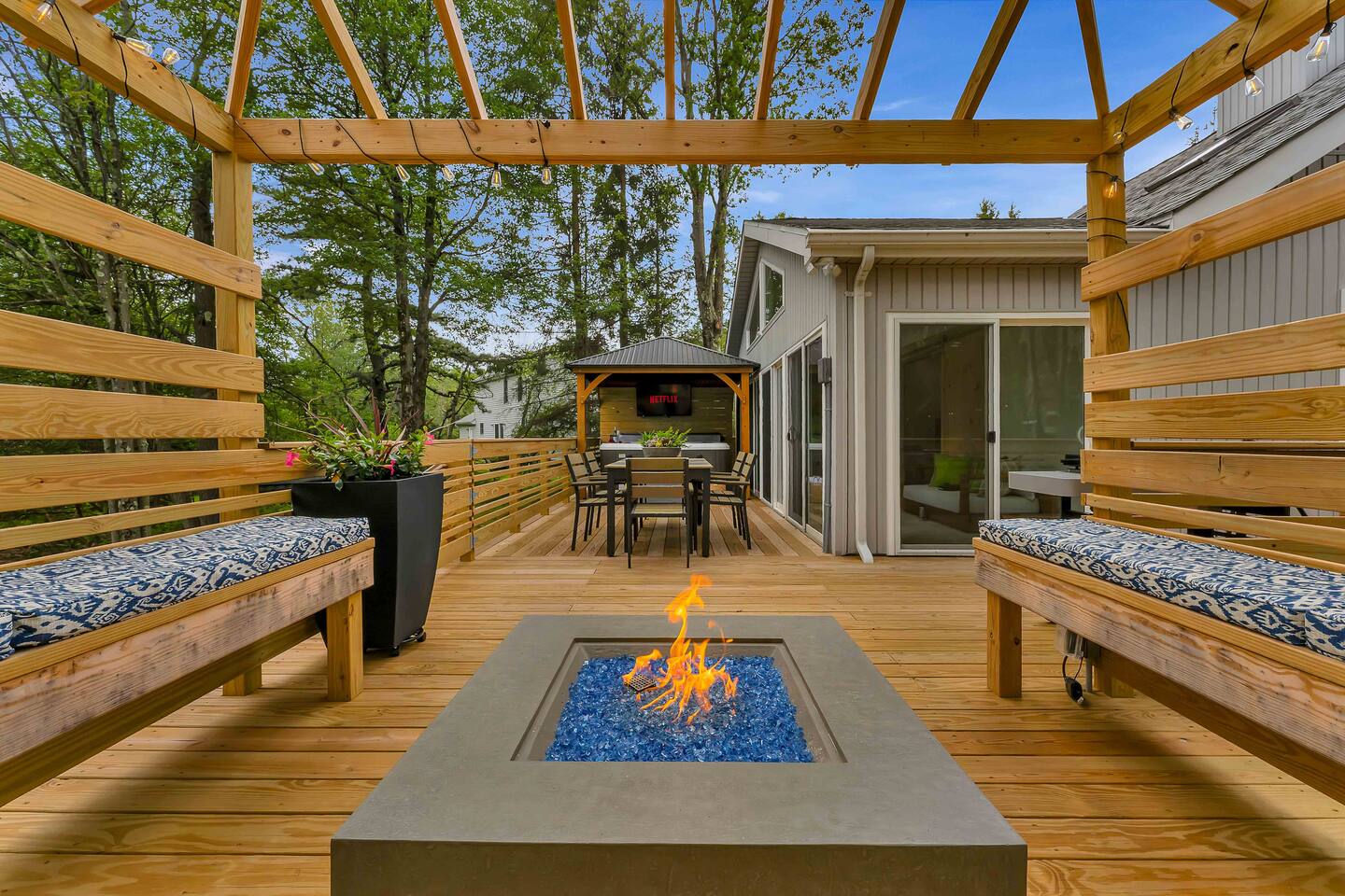 Welcome to Summitgrove Cabin in the Poconos! This modern yet cozy 3BR/2BA retreat blends comfort with style, featuring beautiful wood finishes and a warm interior. Step outside to a spacious yard and deck with hot tub, outdoor TV, dining area, BBQ, and gas firepit. Relax on sun lounges, sway in the hammock under string lights, or gather around the real wood firepit. The unique game room offers ping pong and board games. Located in a community with paid amenities, perfect for family fun.