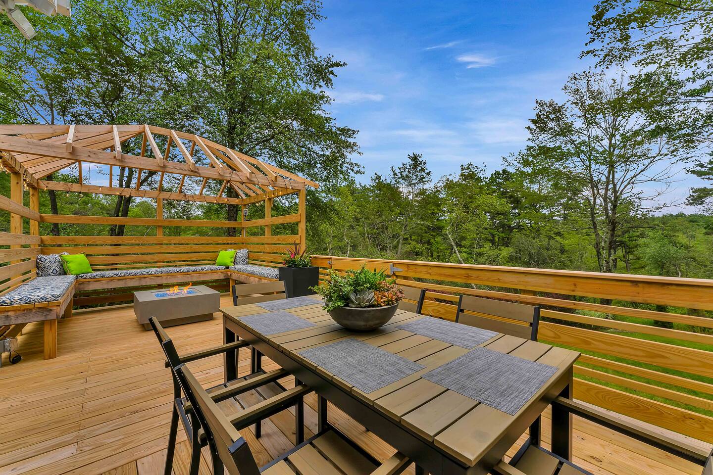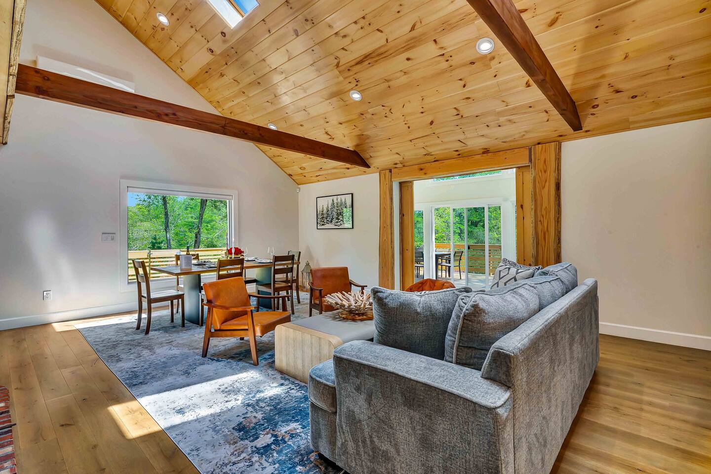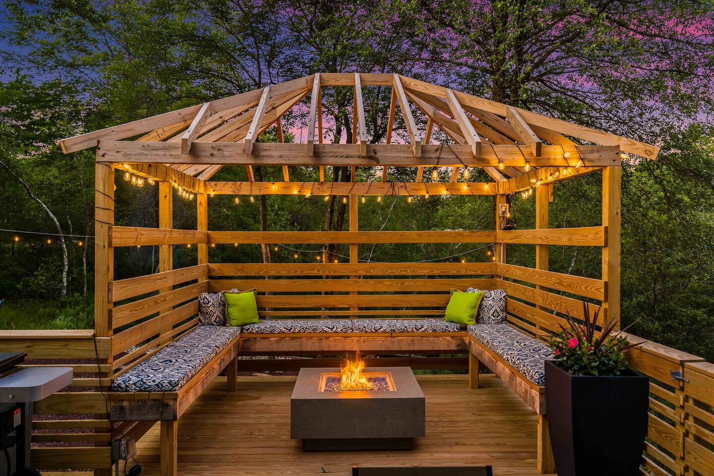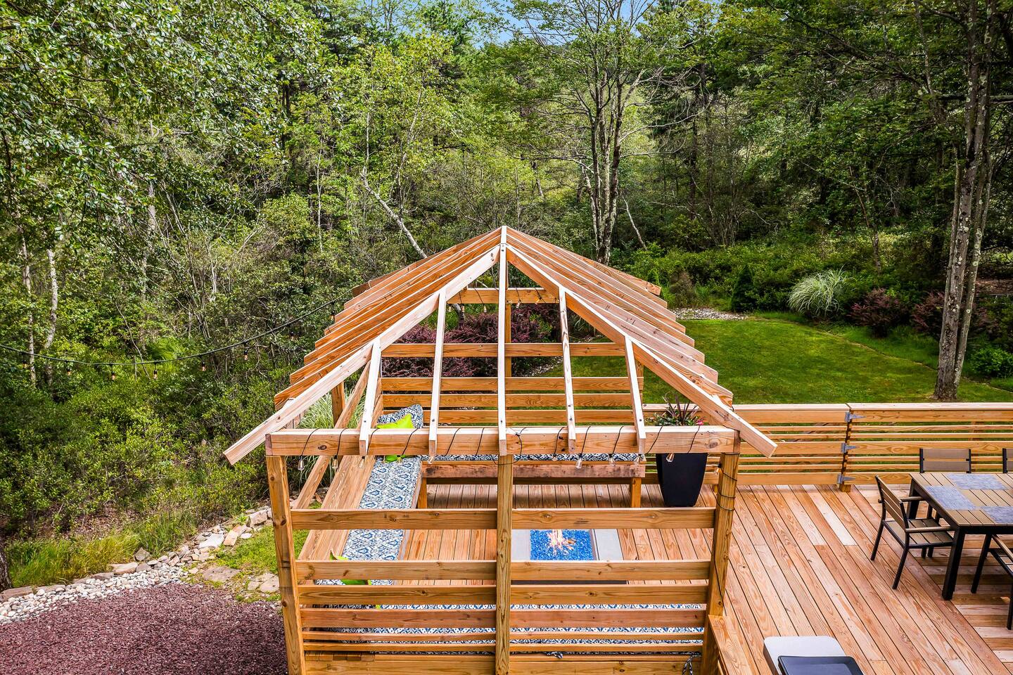 Welcome to Summitgrove Cabin in the Poconos! This modern yet cozy 3BR/2BA retreat blends comfort with style, featuring beautiful wood finishes and a warm interior. Step outside to a spacious yard and deck with hot tub, outdoor TV, dining area, BBQ, and gas firepit. Relax on sun lounges, sway in the hammock under string lights, or gather around the real wood firepit. The unique game room offers ping pong and board games. Located in a community with paid amenities, perfect for family fun.