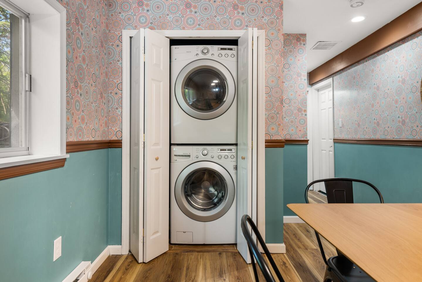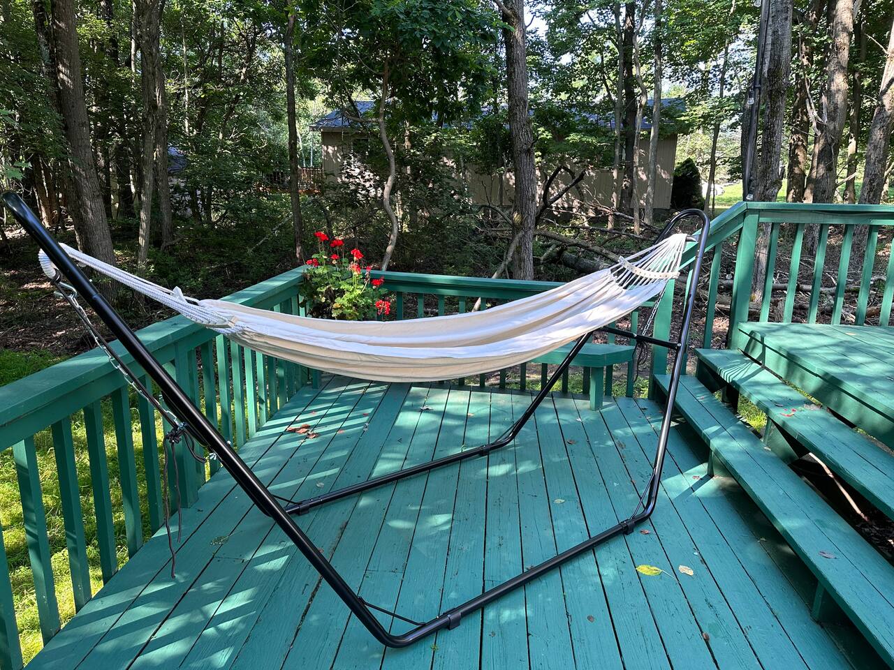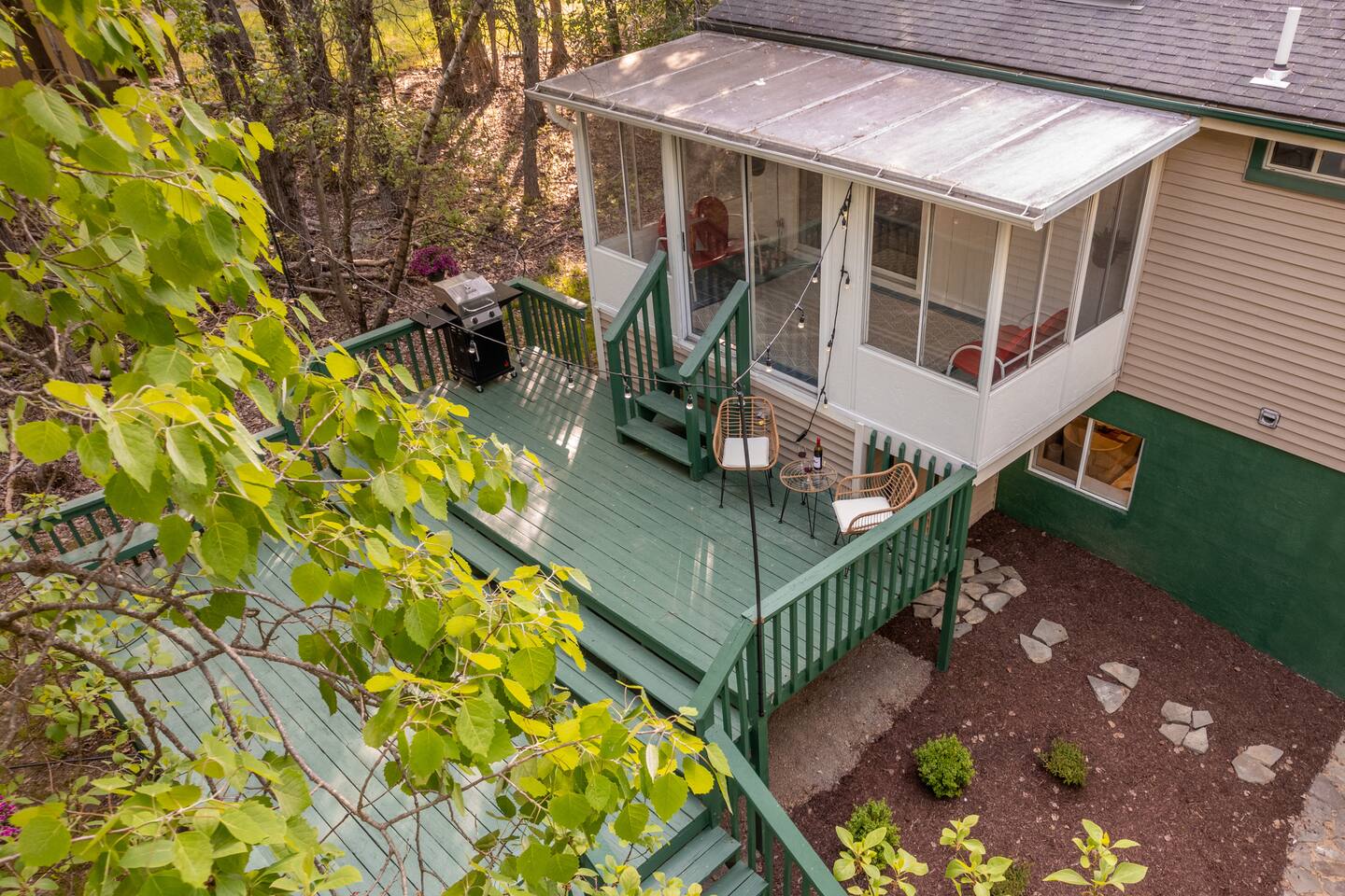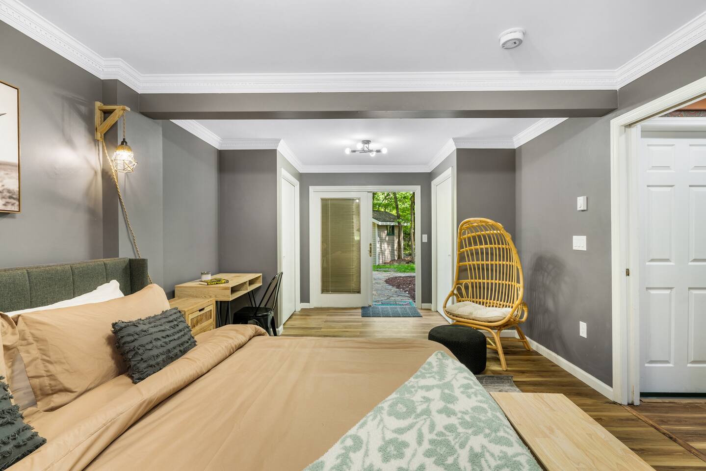 Nestled within the picturesque community of Emerald Lakes, our charming cabin offers an array of wonderful amenities provided by the Emerald Lakes Association. As our guest, you'll have exclusive access to outdoor and indoor pools, a basketball court, tennis court, three serene lakes with boat ramps, and a welcoming community center. Please note that a nominal fee allows you to enjoy these fantastic facilities, payable directly at the community center (cost per badge for amenities are $20 per day, $30 for 3 days, $50 for 7 days per person (2 years and older)). >> Work from Home We provide high speed internet throughout the house. Besides, we have an office desk and a 23 inch monitor that you can use to make it like your home office. >> Living Room Step into our thoughtfully designed living space, where the main living room beckons with its inviting open layout - perfect for both memorable gatherings with loved ones and cherished moments of togetherness. Our elegant dining table comfortably seats six, setting the stage for delightful shared meals and laughter-filled conversations. >> Kitchen The kitchen is a culinary haven, fully equipped to cater to your every need. From the modern fridge, microwave, and full stove/oven, to the convenient coffee maker and basic kitchen utensils and cookware, we have everything you require to whip up delicious meals and create lasting memories around the dining table. We also offer the luxury of 6-stage filtered water from the kitchen sink, ensuring your drinking and cooking needs are met with utmost care. >> Sunroom One of our most beloved spaces is the sunroom, an oasis of relaxation with two large love chairs. Here, you can savor tranquil moments while gazing out at the enchanting forest, where friendly deer occasionally pause to say hello. It's a true testament to the beauty of nature that surrounds us. >> Deck and Backyard Step out onto the deck, where a cozy hammock awaits, beckoning you to curl up with your favorite book and immerse yourself in the soothing sounds of the surrounding wilderness. And as the sun sets, unleash your inner adventurer and gather around the large firepit, relishing the magic of crackling flames under the starlit sky. For those seeking a more adventurous experience, we provide an extra hammock in the game room, perfect for setting up under the gentle sway of the trees. As you start each day at the Green Utopia, don't miss the chance to enjoy breakfast at our charming picnic table, relishing the refreshing morning breeze unless it's raining – then you can always cozy up indoors. >> Bedrooms When it's time to retreat and rest, our two bedrooms upstairs beckon with comfort and serenity. Each room features a plush queen bed and a private air conditioner, ensuring you have a blissful night's sleep. A small bathroom conveniently adjoins the bedrooms, offering ease and comfort. >> Master Bedroom For those seeking a touch of seclusion and additional amenities, our master bedroom downstairs awaits. With a private entrance to the backyard and a dedicated work space, this room is perfect for guests seeking both relaxation and productivity. During warmer months, the cooling fan keeps the room refreshingly pleasant. >> Master Bathroom The master bathroom is a true sanctuary, reminiscent of a spa-like haven. Picture yourself unwinding in the indulgent bathtub or enjoying a refreshing walk-in shower, all while marveling at the serene views of the backyard firepit. It's a space where you can truly pamper yourself and revel in pure relaxation. >> Game room In the game room, you'll find a delightful gathering spot for both children and adults alike. Enjoy bonding over board games at the large table with six chairs, or unwind on the comfortable bed-convertible sofa while watching your favorite shows on the 50" TV. For added convenience, the washer/dryer is thoughtfully placed in this space, making it easy to take care of your laundry needs.