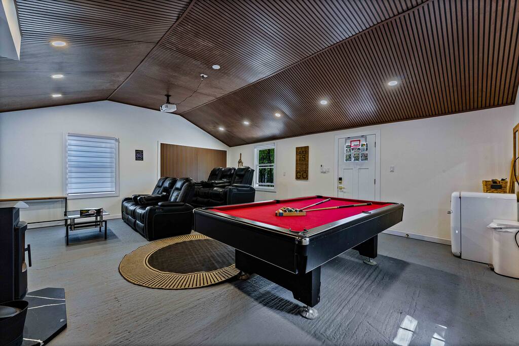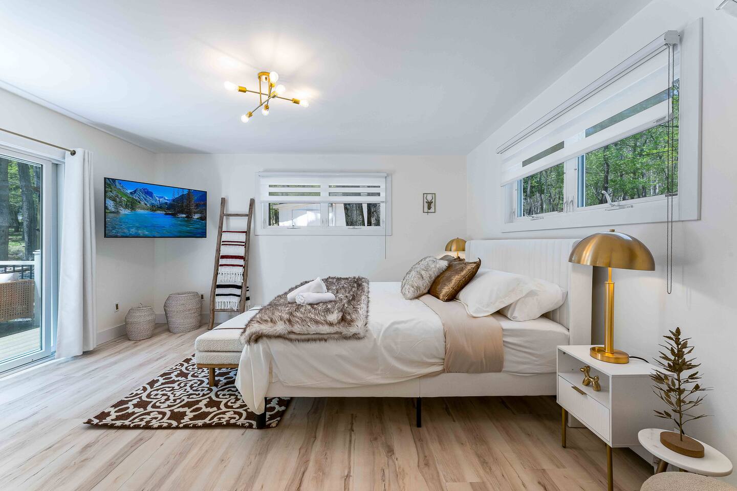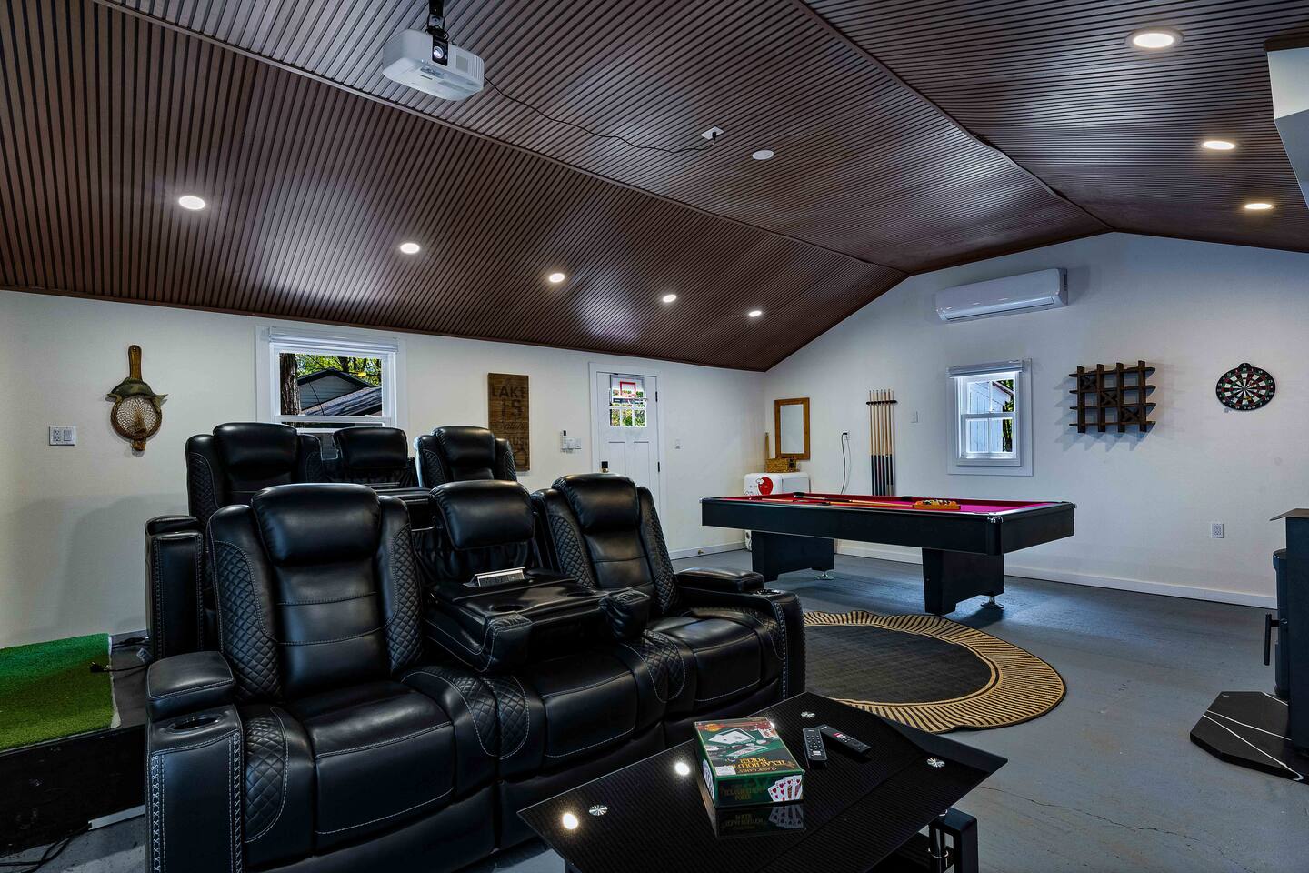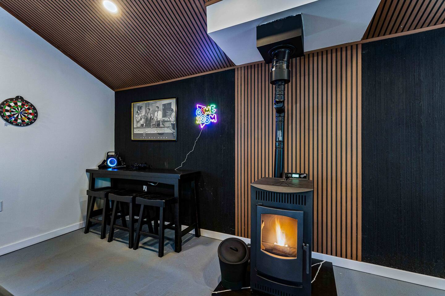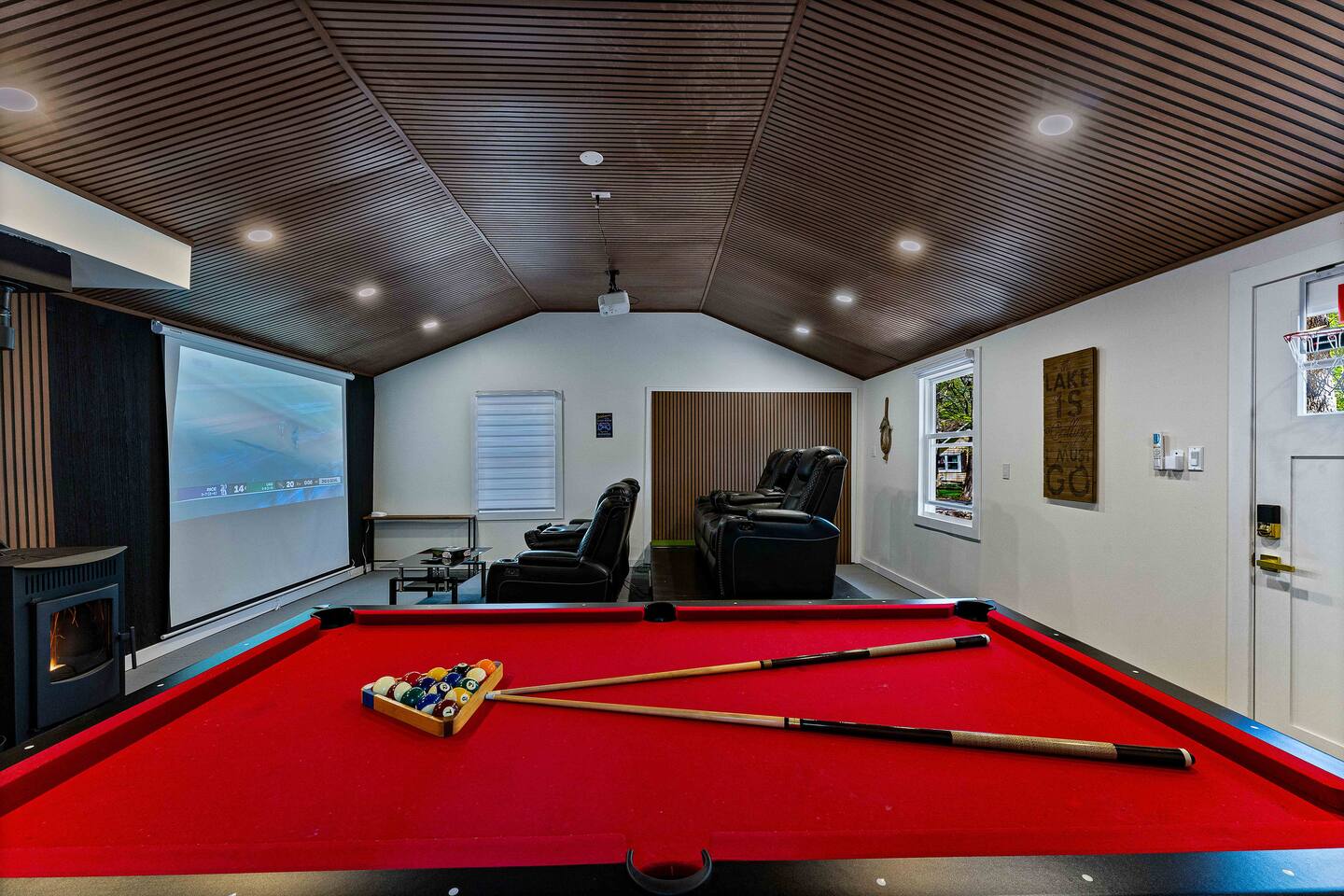 INSIDE: Enter through the main side entrance from the private driveway and step into a bright, elegant interior with a cozy, all-white modern design. To the right, discover the spacious primary bedroom featuring a TV, ample closet space, and a private en-suite bathroom with a shower. To the left, a hallway leads you to a full bathroom with a beautiful freestanding tub. Adjacent is the owner's locked closet. On the right side of the hall, you'll find two guest bedrooms—one with a full-size bed, the other with a queen-size bed, both with closet space. At the end of the hall, the space opens into a welcoming open-concept kitchen, dining, and living area. The fully equipped kitchen includes a washer and dryer, and the dining area seats six around a round table. The living room features a comfortable couch, smart TV, and cozy chairs facing a gas fireplace. Step through to the front porch with a small outdoor couch and coffee table, offering a serene partial lake view framed by trees. BACKYARD: The beautifully designed backyard is also accessible through the sliding door in the primary bedroom. Relax in style with outdoor furniture surrounding a pellet stove, a gas BBQ, and an outdoor TV. Unwind in the wood-burning hot tub or the private wood-burning sauna. Enjoy evenings by the firepit, surrounded by stylish benches and a charming swing set. An outdoor dining table completes this peaceful retreat. GARAGE/GAME ROOM: Step into the ultimate entertainment space. The garage-turned-game-room features a pool table, pellet stove, and movie theater setup. In the far corner, enjoy a bar area. The room also includes board games, little fridge a karaoke machine, dart board, and cornhole boards—perfect for fun-filled nights with friends or family.