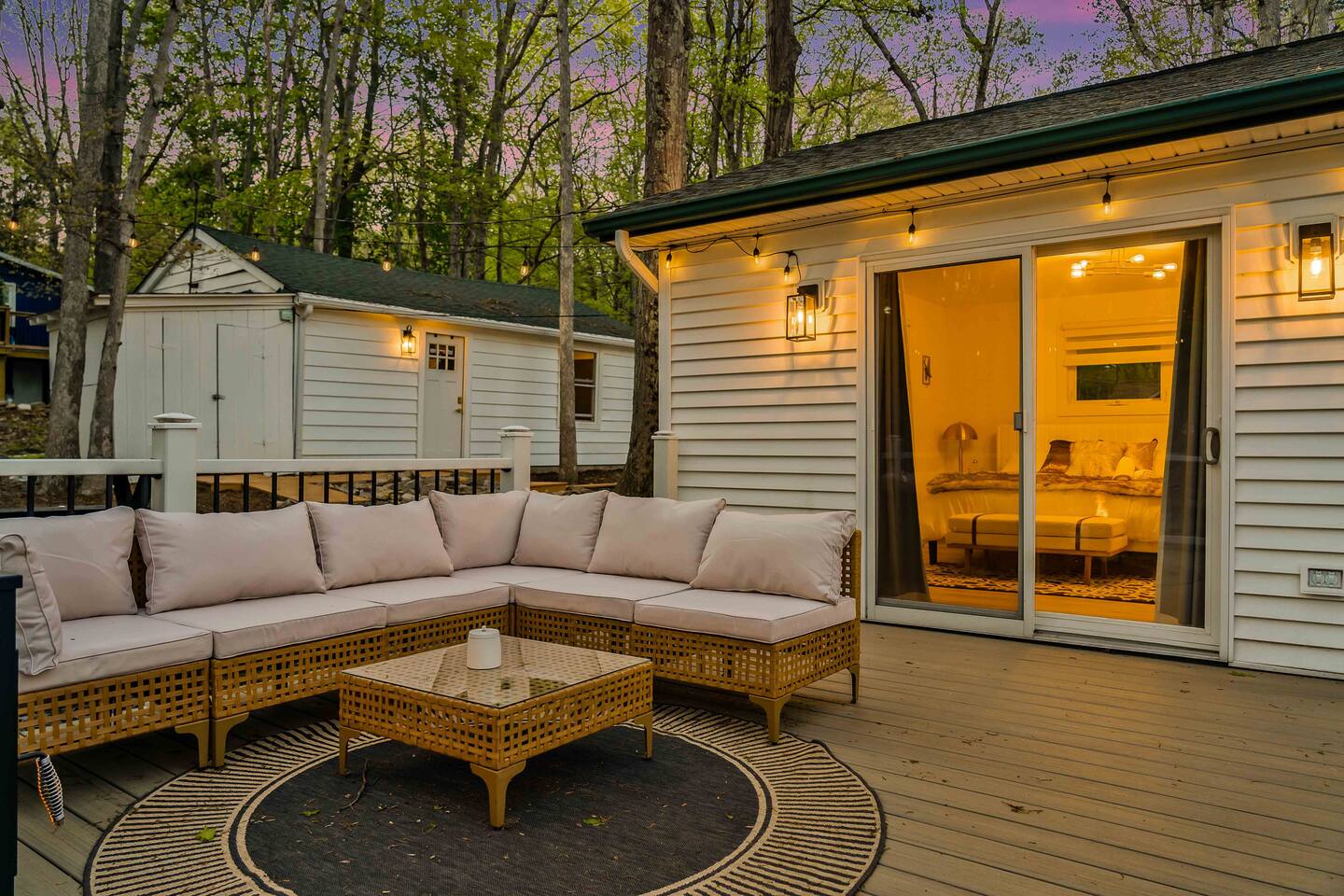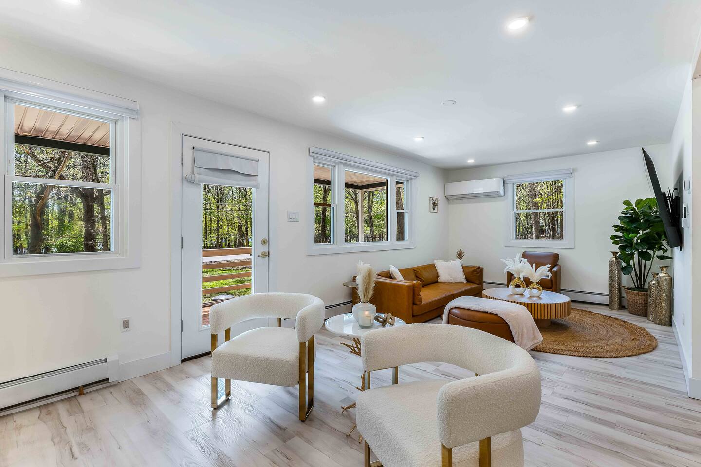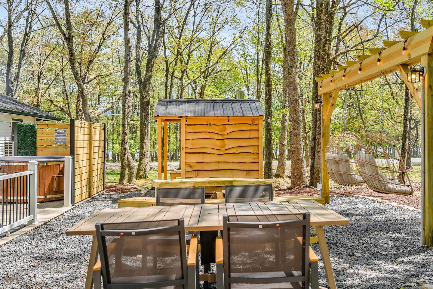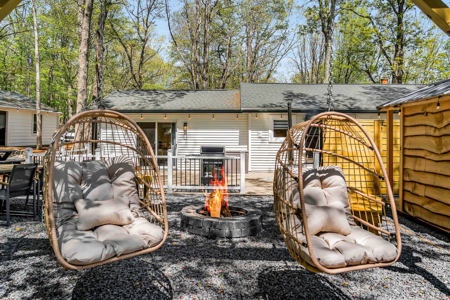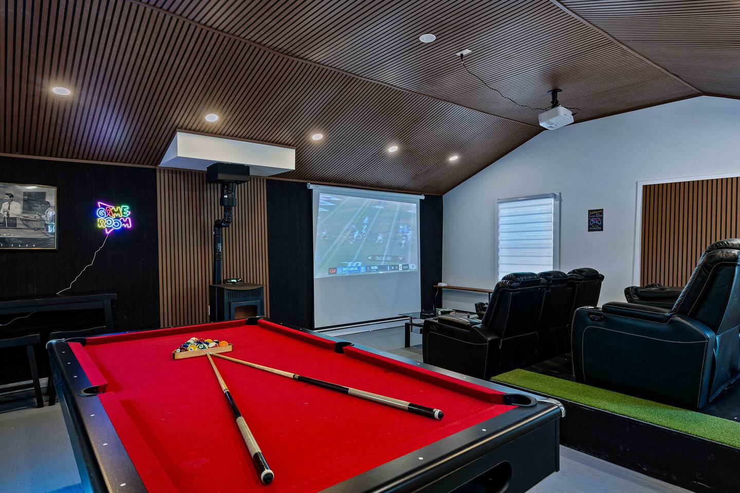INSIDE: Enter through the main side entrance from the private driveway and step into a bright, elegant interior with a cozy, all-white modern design. To the right, discover the spacious primary bedroom featuring a TV, ample closet space, and a private en-suite bathroom with a shower. To the left, a hallway leads you to a full bathroom with a beautiful freestanding tub. Adjacent is the owner's locked closet. On the right side of the hall, you'll find two guest bedrooms—one with a full-size bed, the other with a queen-size bed, both with closet space. At the end of the hall, the space opens into a welcoming open-concept kitchen, dining, and living area. The fully equipped kitchen includes a washer and dryer, and the dining area seats six around a round table. The living room features a comfortable couch, smart TV, and cozy chairs facing a gas fireplace. Step through to the front porch with a small outdoor couch and coffee table, offering a serene partial lake view framed by trees. BACKYARD: The beautifully designed backyard is also accessible through the sliding door in the primary bedroom. Relax in style with outdoor furniture surrounding a pellet stove, a gas BBQ, and an outdoor TV. Unwind in the wood-burning hot tub or the private wood-burning sauna. Enjoy evenings by the firepit, surrounded by stylish benches and a charming swing set. An outdoor dining table completes this peaceful retreat. GARAGE/GAME ROOM: Step into the ultimate entertainment space. The garage-turned-game-room features a pool table, pellet stove, and movie theater setup. In the far corner, enjoy a bar area. The room also includes board games, little fridge a karaoke machine, dart board, and cornhole boards—perfect for fun-filled nights with friends or family.