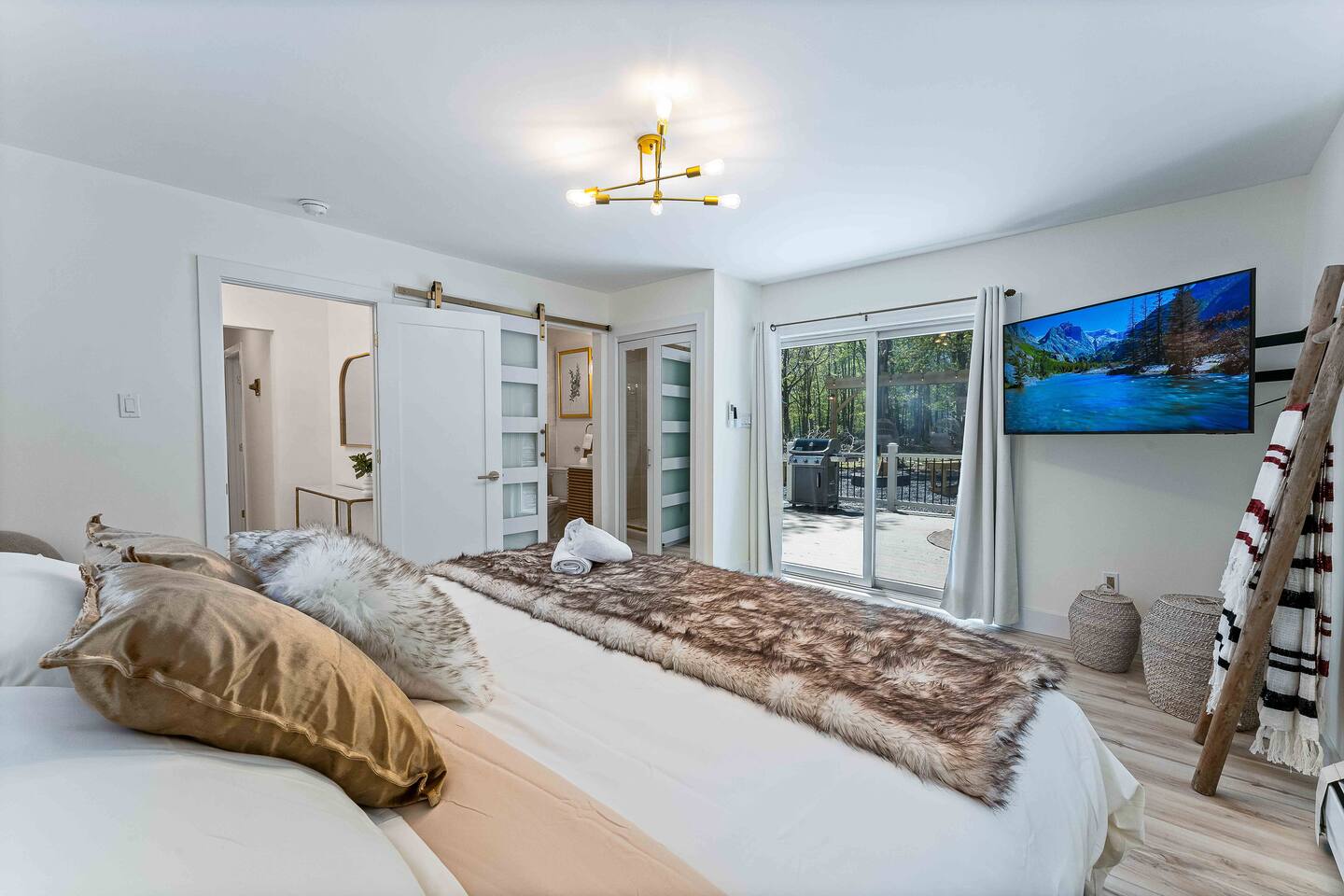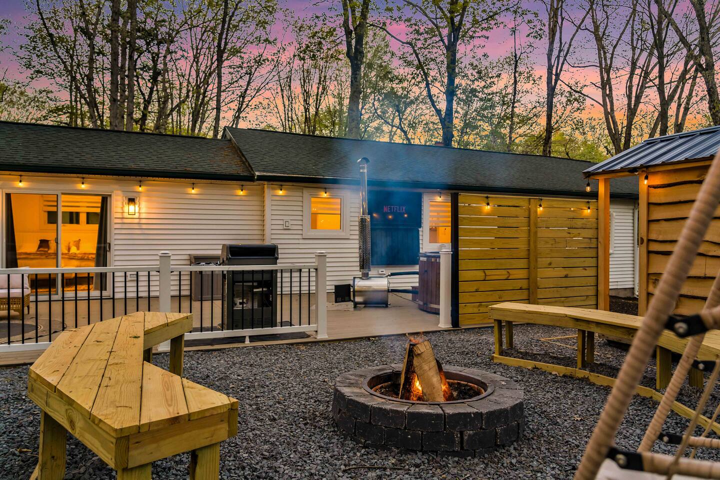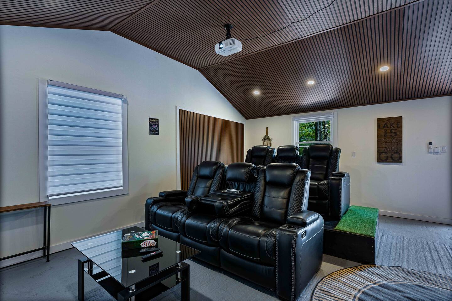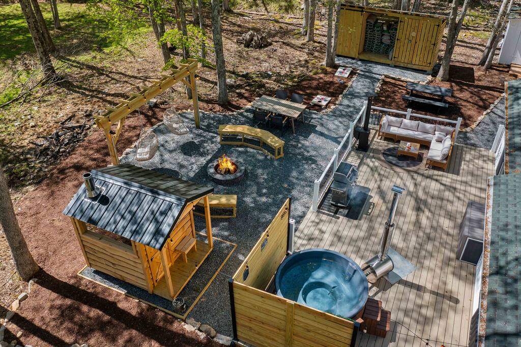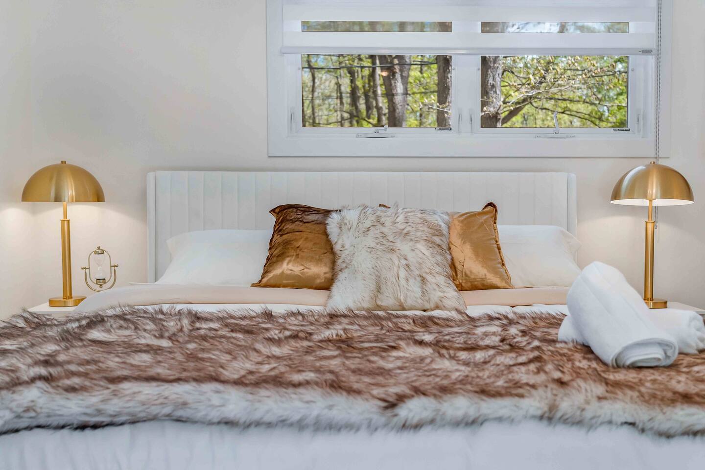 INSIDE: Enter through the main side entrance from the private driveway and step into a bright, elegant interior with a cozy, all-white modern design. To the right, discover the spacious primary bedroom featuring a TV, ample closet space, and a private en-suite bathroom with a shower. To the left, a hallway leads you to a full bathroom with a beautiful freestanding tub. Adjacent is the owner's locked closet. On the right side of the hall, you'll find two guest bedrooms—one with a full-size bed, the other with a queen-size bed, both with closet space. At the end of the hall, the space opens into a welcoming open-concept kitchen, dining, and living area. The fully equipped kitchen includes a washer and dryer, and the dining area seats six around a round table. The living room features a comfortable couch, smart TV, and cozy chairs facing a gas fireplace. Step through to the front porch with a small outdoor couch and coffee table, offering a serene partial lake view framed by trees. BACKYARD: The beautifully designed backyard is also accessible through the sliding door in the primary bedroom. Relax in style with outdoor furniture surrounding a pellet stove, a gas BBQ, and an outdoor TV. Unwind in the wood-burning hot tub or the private wood-burning sauna. Enjoy evenings by the firepit, surrounded by stylish benches and a charming swing set. An outdoor dining table completes this peaceful retreat. GARAGE/GAME ROOM: Step into the ultimate entertainment space. The garage-turned-game-room features a pool table, pellet stove, and movie theater setup. In the far corner, enjoy a bar area. The room also includes board games, little fridge a karaoke machine, dart board, and cornhole boards—perfect for fun-filled nights with friends or family.