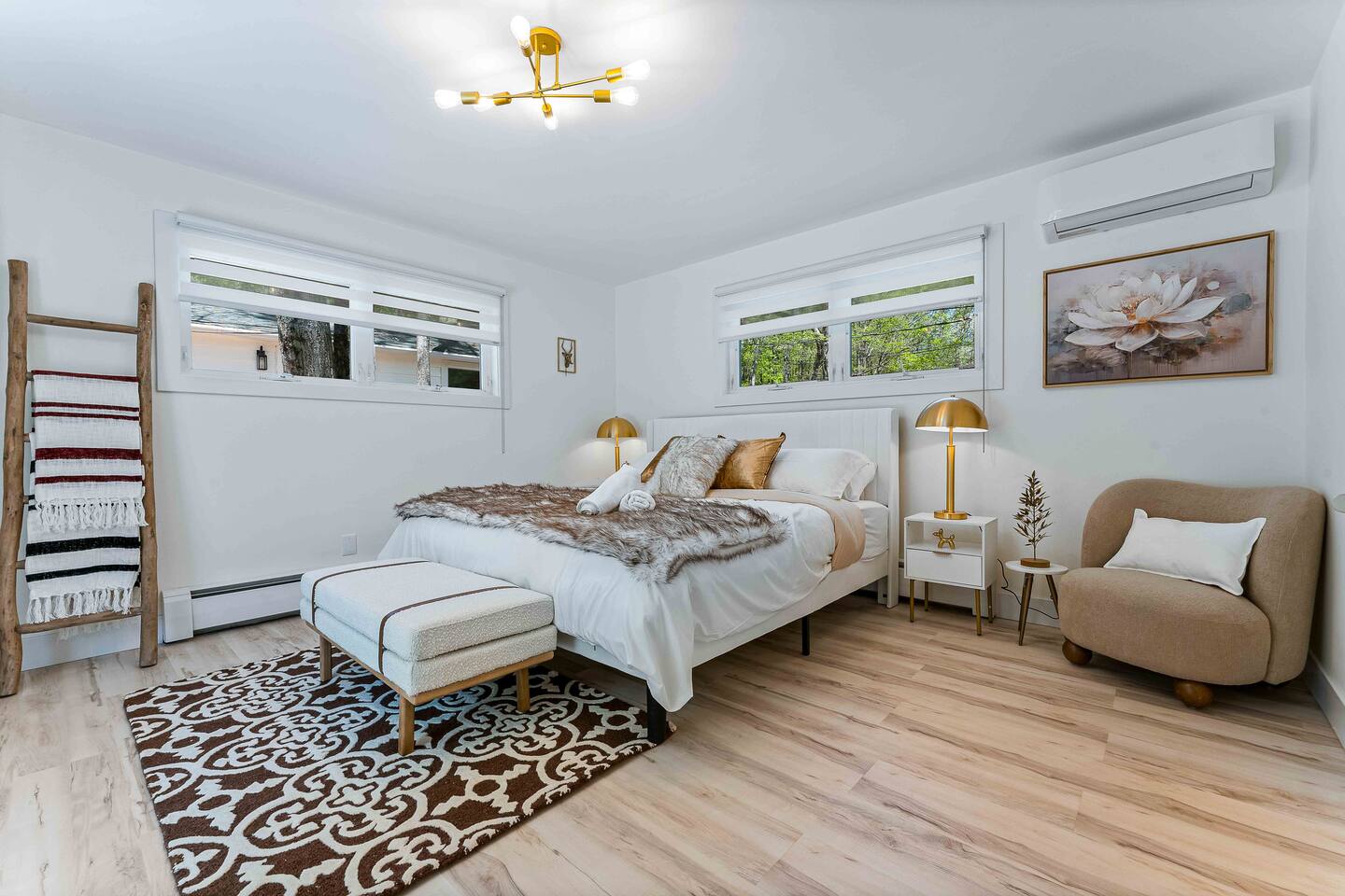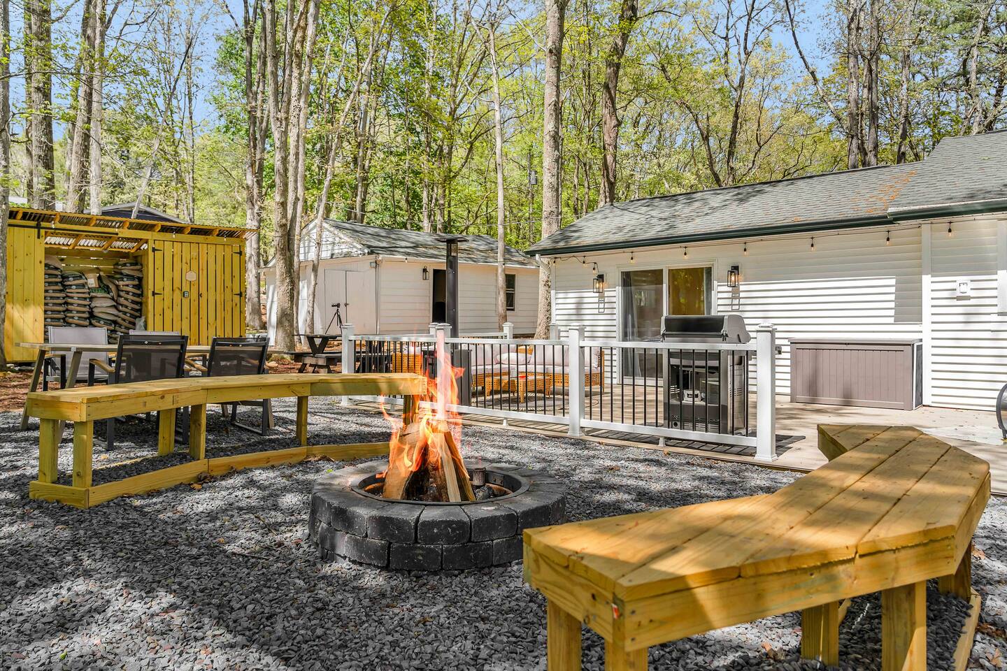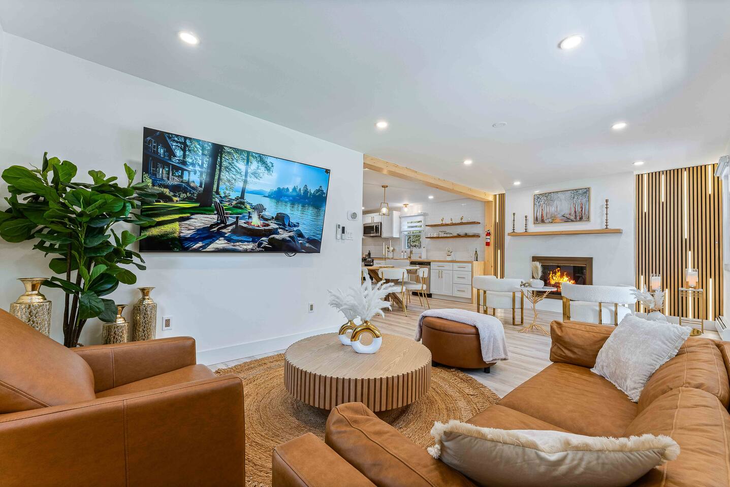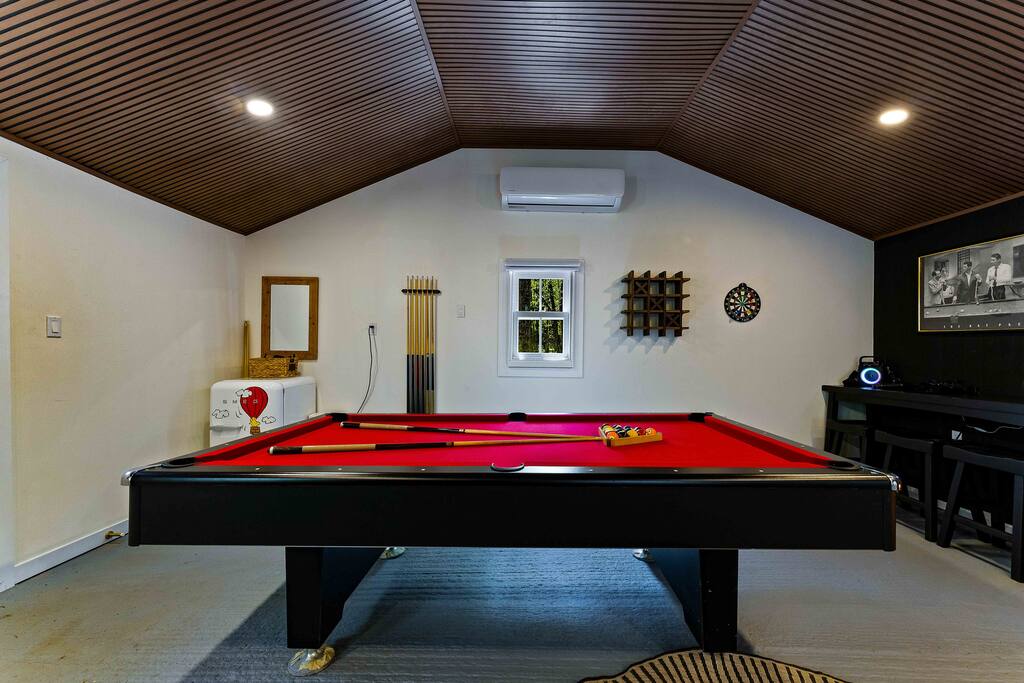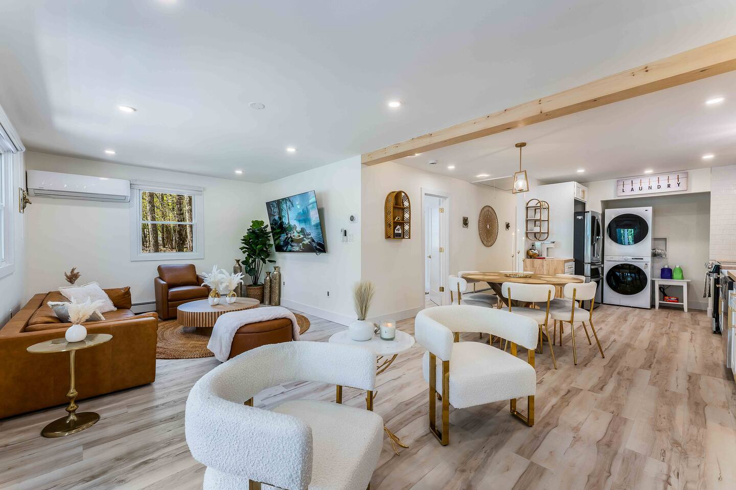 INSIDE: Enter through the main side entrance from the private driveway and step into a bright, elegant interior with a cozy, all-white modern design. To the right, discover the spacious primary bedroom featuring a TV, ample closet space, and a private en-suite bathroom with a shower. To the left, a hallway leads you to a full bathroom with a beautiful freestanding tub. Adjacent is the owner's locked closet. On the right side of the hall, you'll find two guest bedrooms—one with a full-size bed, the other with a queen-size bed, both with closet space. At the end of the hall, the space opens into a welcoming open-concept kitchen, dining, and living area. The fully equipped kitchen includes a washer and dryer, and the dining area seats six around a round table. The living room features a comfortable couch, smart TV, and cozy chairs facing a gas fireplace. Step through to the front porch with a small outdoor couch and coffee table, offering a serene partial lake view framed by trees. BACKYARD: The beautifully designed backyard is also accessible through the sliding door in the primary bedroom. Relax in style with outdoor furniture surrounding a pellet stove, a gas BBQ, and an outdoor TV. Unwind in the wood-burning hot tub or the private wood-burning sauna. Enjoy evenings by the firepit, surrounded by stylish benches and a charming swing set. An outdoor dining table completes this peaceful retreat. GARAGE/GAME ROOM: Step into the ultimate entertainment space. The garage-turned-game-room features a pool table, pellet stove, and movie theater setup. In the far corner, enjoy a bar area. The room also includes board games, little fridge a karaoke machine, dart board, and cornhole boards—perfect for fun-filled nights with friends or family.