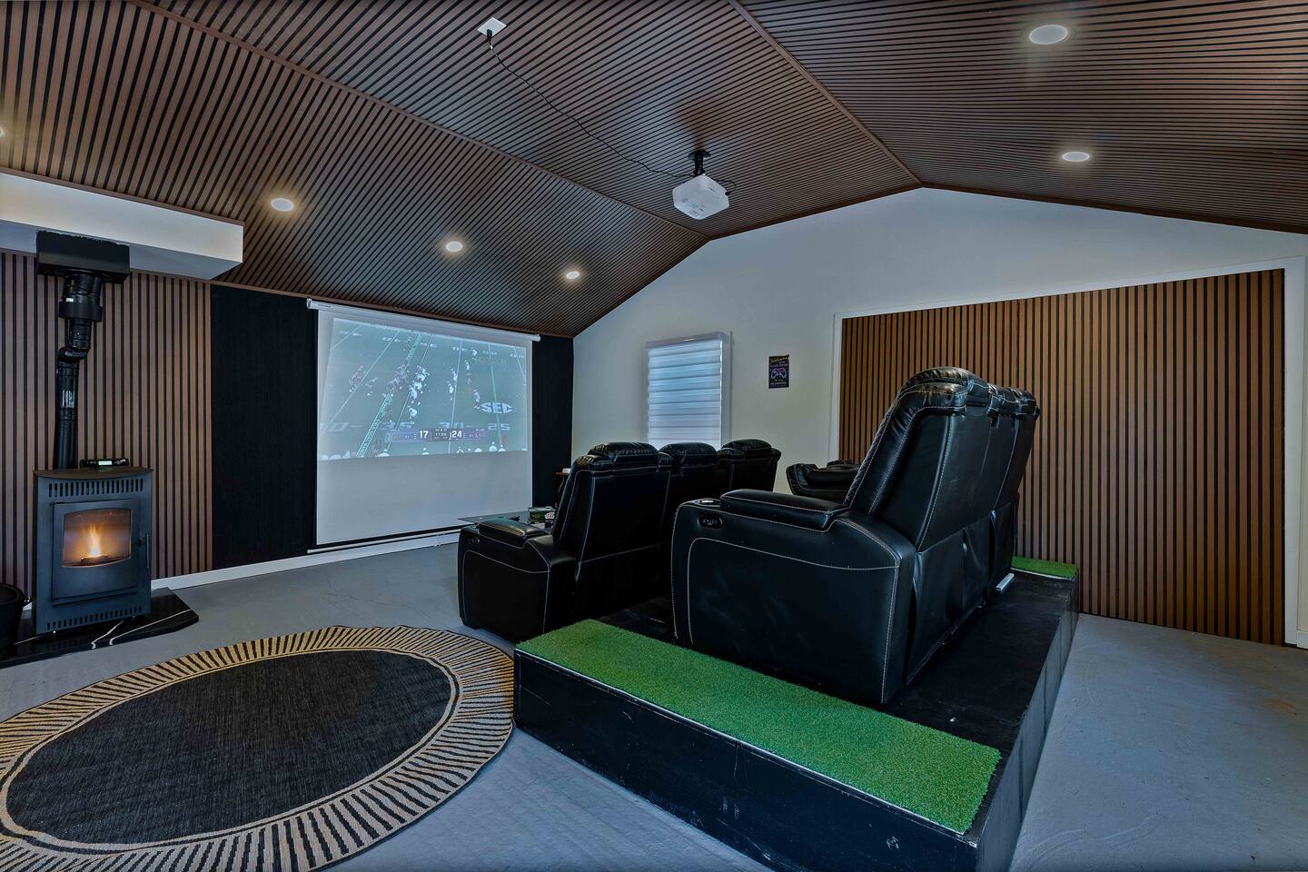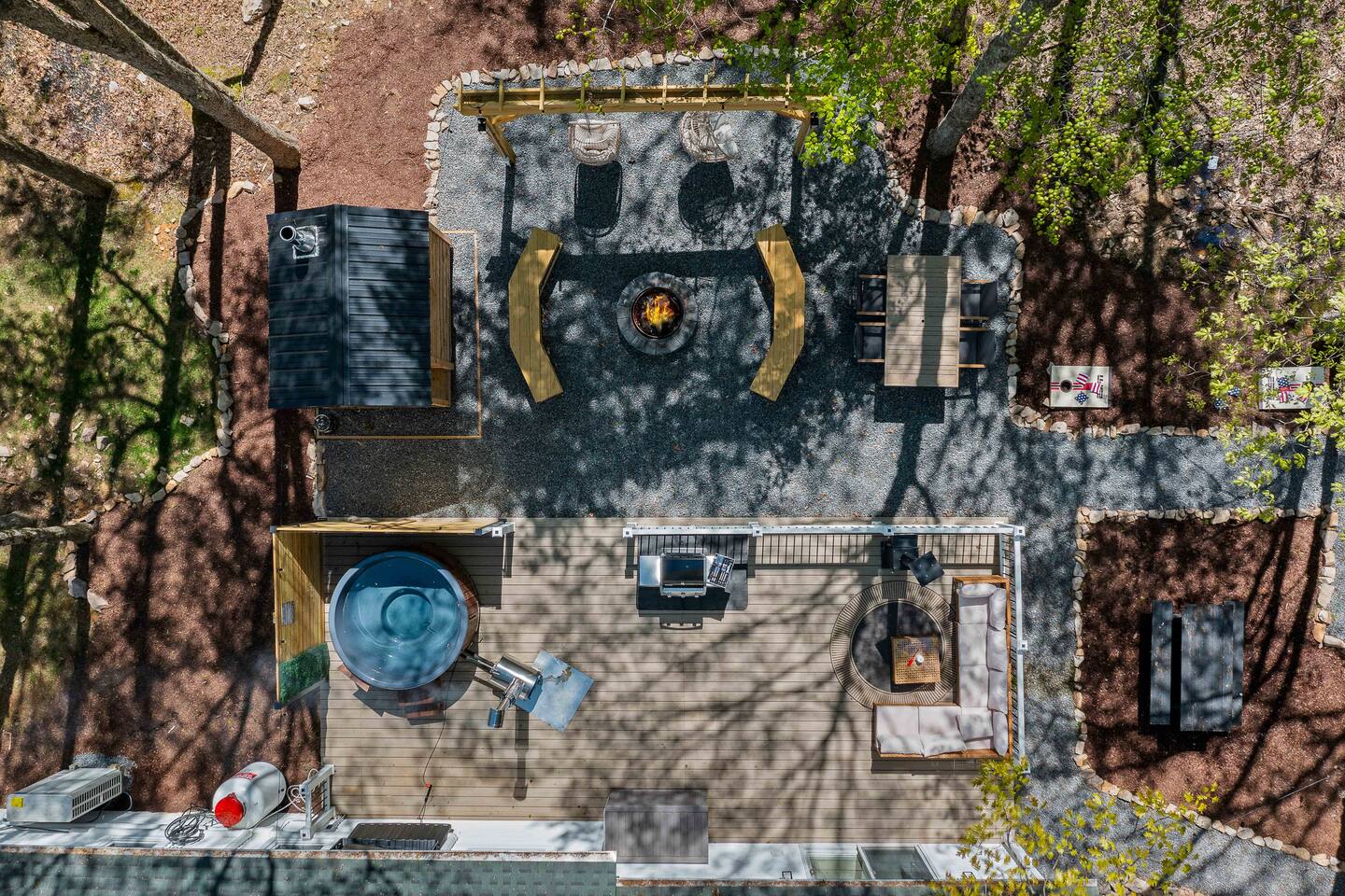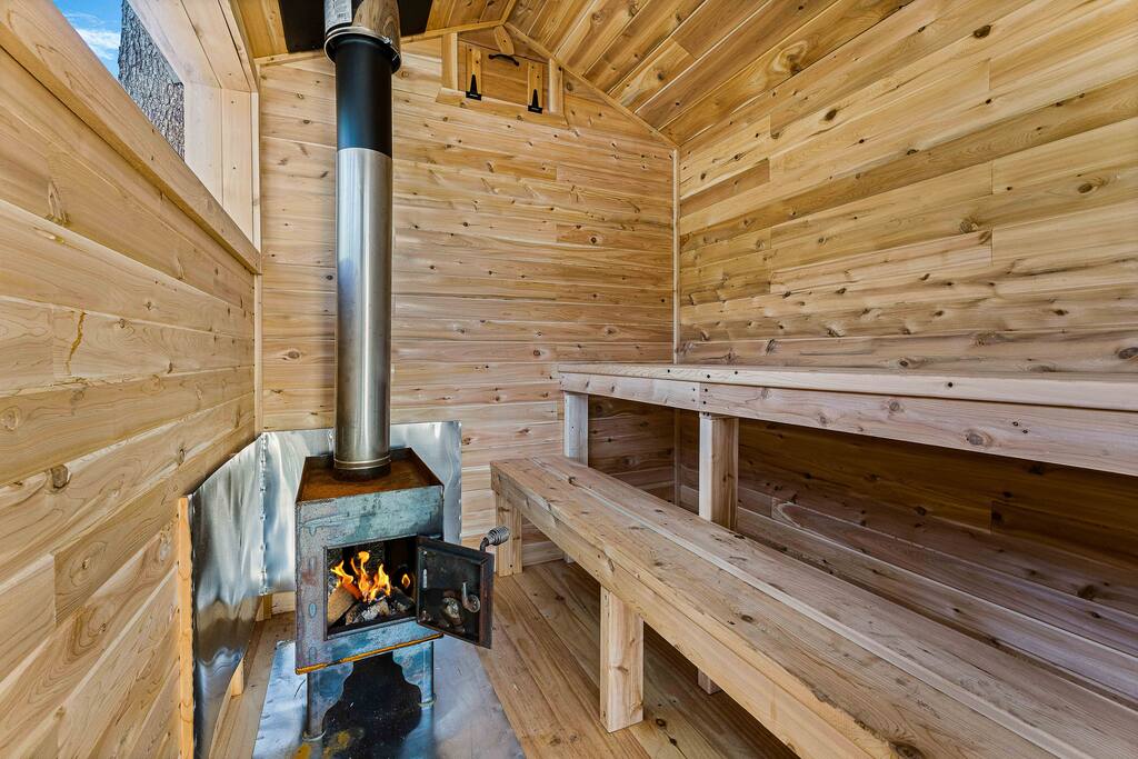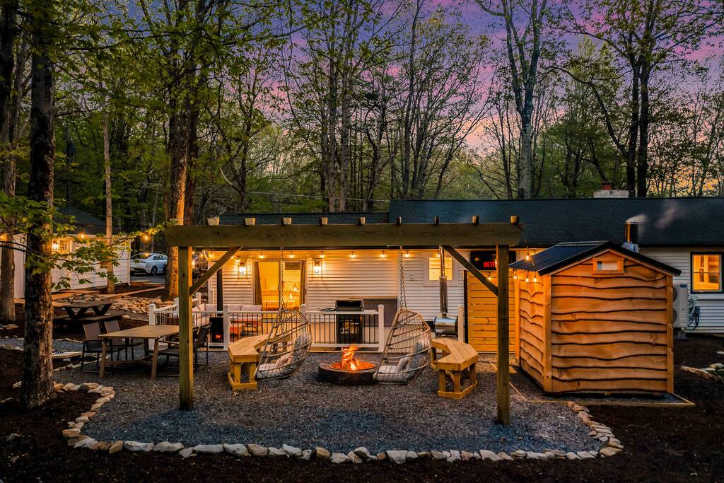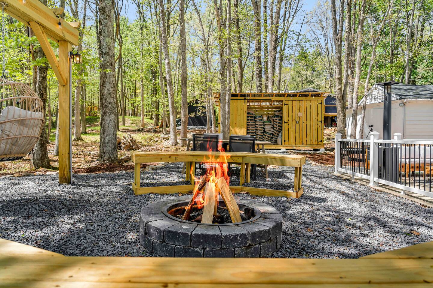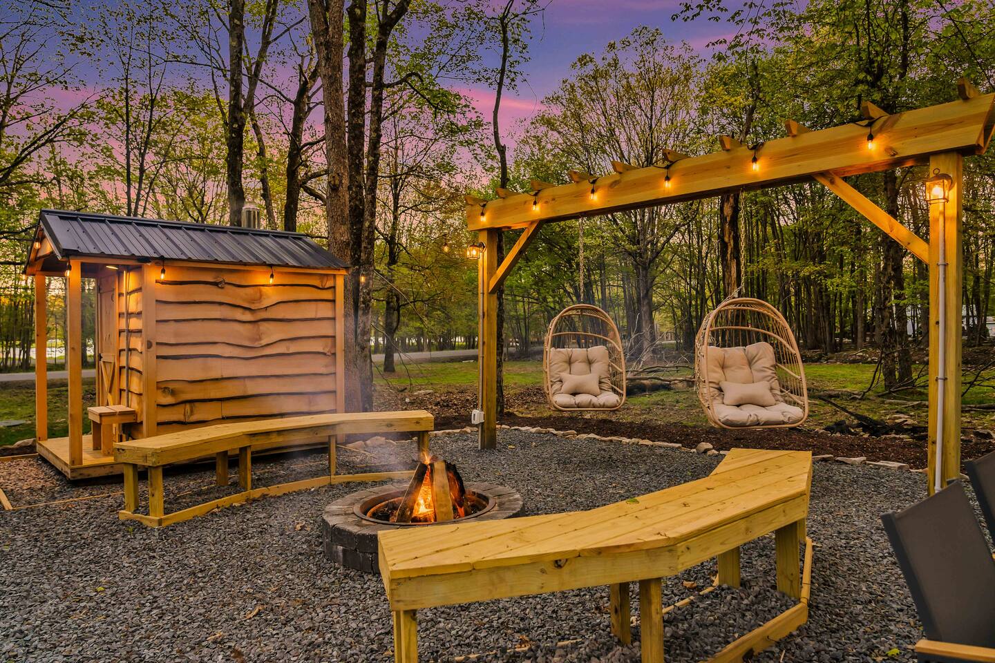 INSIDE: Enter through the main side entrance from the private driveway and step into a bright, elegant interior with a cozy, all-white modern design. To the right, discover the spacious primary bedroom featuring a TV, ample closet space, and a private en-suite bathroom with a shower. To the left, a hallway leads you to a full bathroom with a beautiful freestanding tub. Adjacent is the owner's locked closet. On the right side of the hall, you'll find two guest bedrooms—one with a full-size bed, the other with a queen-size bed, both with closet space. At the end of the hall, the space opens into a welcoming open-concept kitchen, dining, and living area. The fully equipped kitchen includes a washer and dryer, and the dining area seats six around a round table. The living room features a comfortable couch, smart TV, and cozy chairs facing a gas fireplace. Step through to the front porch with a small outdoor couch and coffee table, offering a serene partial lake view framed by trees. BACKYARD: The beautifully designed backyard is also accessible through the sliding door in the primary bedroom. Relax in style with outdoor furniture surrounding a pellet stove, a gas BBQ, and an outdoor TV. Unwind in the wood-burning hot tub or the private wood-burning sauna. Enjoy evenings by the firepit, surrounded by stylish benches and a charming swing set. An outdoor dining table completes this peaceful retreat. GARAGE/GAME ROOM: Step into the ultimate entertainment space. The garage-turned-game-room features a pool table, pellet stove, and movie theater setup. In the far corner, enjoy a bar area. The room also includes board games, little fridge a karaoke machine, dart board, and cornhole boards—perfect for fun-filled nights with friends or family.