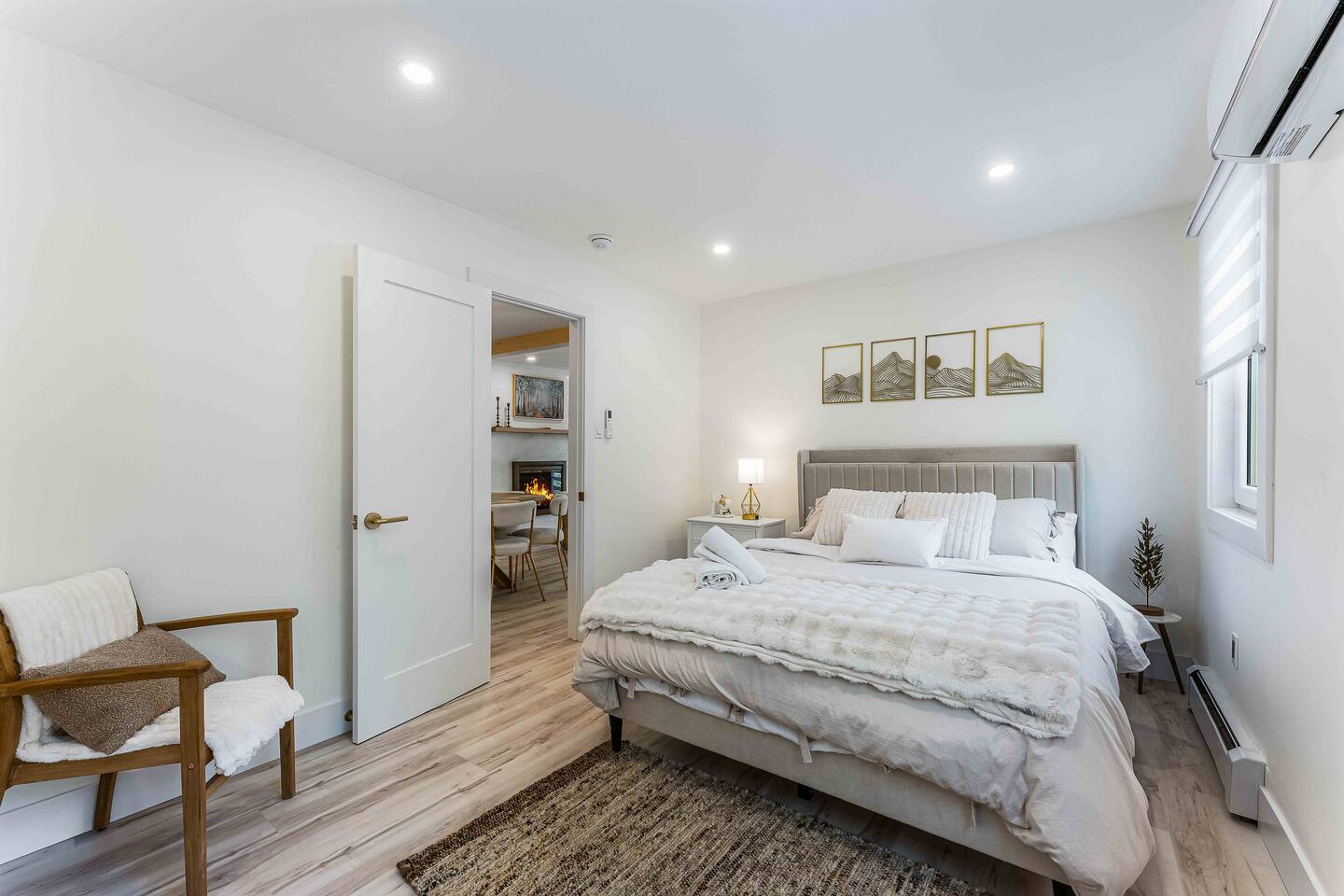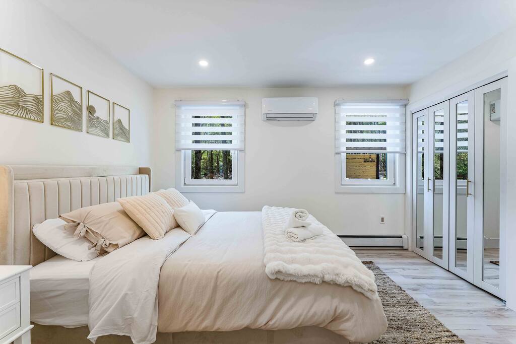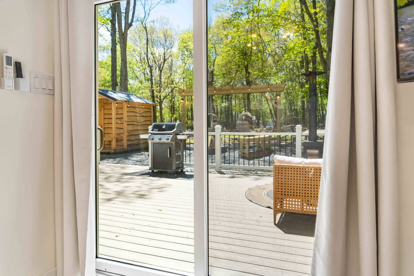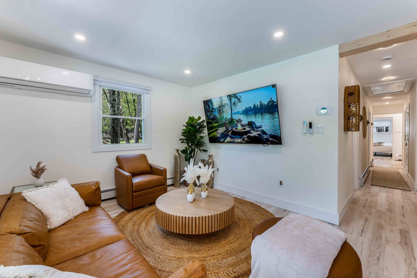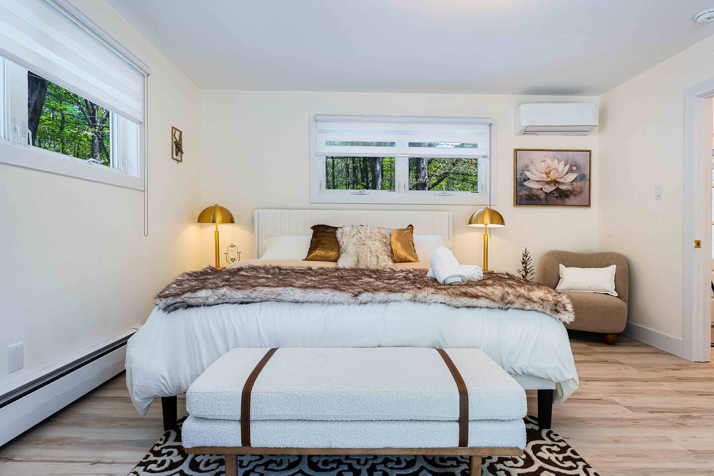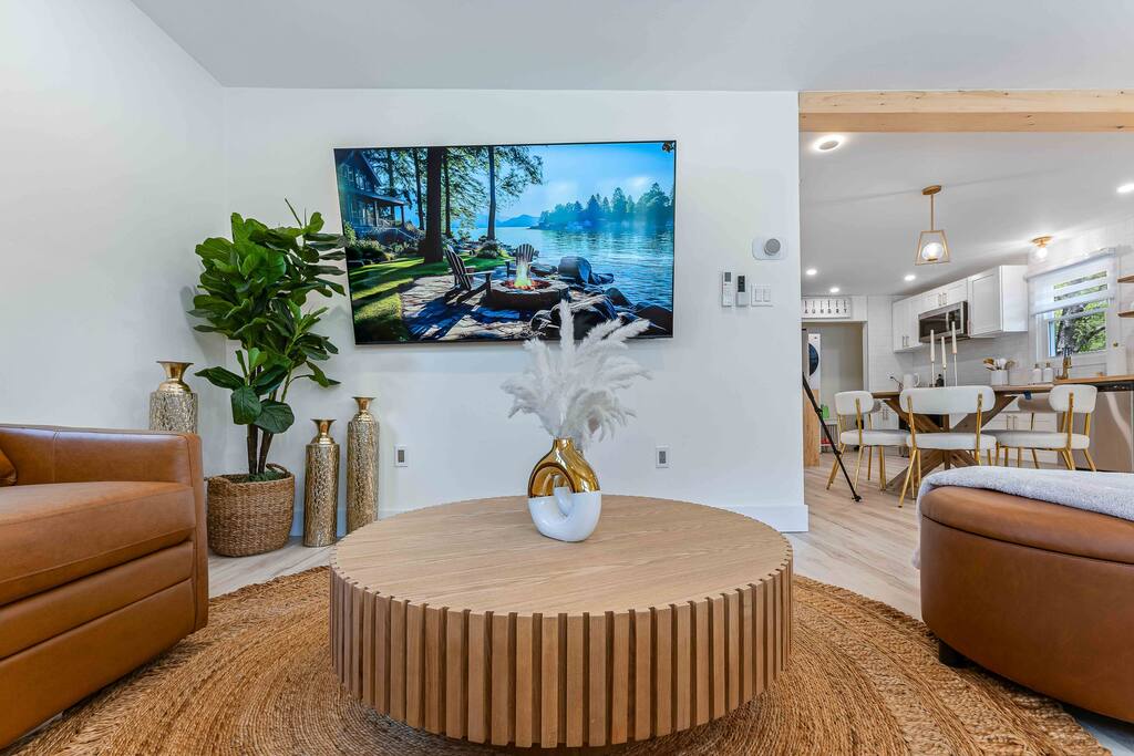 INSIDE: Enter through the main side entrance from the private driveway and step into a bright, elegant interior with a cozy, all-white modern design. To the right, discover the spacious primary bedroom featuring a TV, ample closet space, and a private en-suite bathroom with a shower. To the left, a hallway leads you to a full bathroom with a beautiful freestanding tub. Adjacent is the owner's locked closet. On the right side of the hall, you'll find two guest bedrooms—one with a full-size bed, the other with a queen-size bed, both with closet space. At the end of the hall, the space opens into a welcoming open-concept kitchen, dining, and living area. The fully equipped kitchen includes a washer and dryer, and the dining area seats six around a round table. The living room features a comfortable couch, smart TV, and cozy chairs facing a gas fireplace. Step through to the front porch with a small outdoor couch and coffee table, offering a serene partial lake view framed by trees. BACKYARD: The beautifully designed backyard is also accessible through the sliding door in the primary bedroom. Relax in style with outdoor furniture surrounding a pellet stove, a gas BBQ, and an outdoor TV. Unwind in the wood-burning hot tub or the private wood-burning sauna. Enjoy evenings by the firepit, surrounded by stylish benches and a charming swing set. An outdoor dining table completes this peaceful retreat. GARAGE/GAME ROOM: Step into the ultimate entertainment space. The garage-turned-game-room features a pool table, pellet stove, and movie theater setup. In the far corner, enjoy a bar area. The room also includes board games, little fridge a karaoke machine, dart board, and cornhole boards—perfect for fun-filled nights with friends or family.