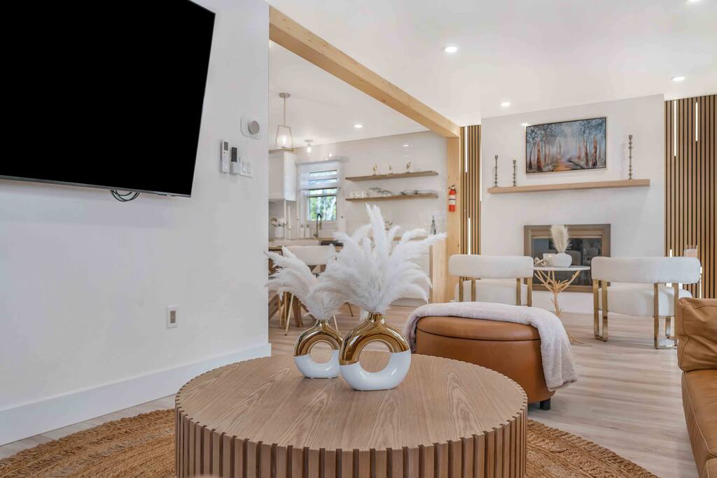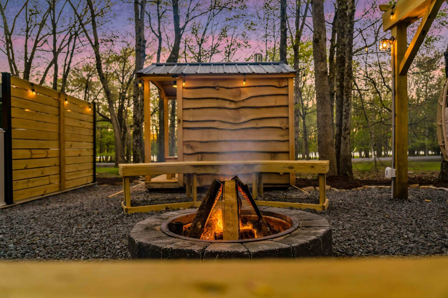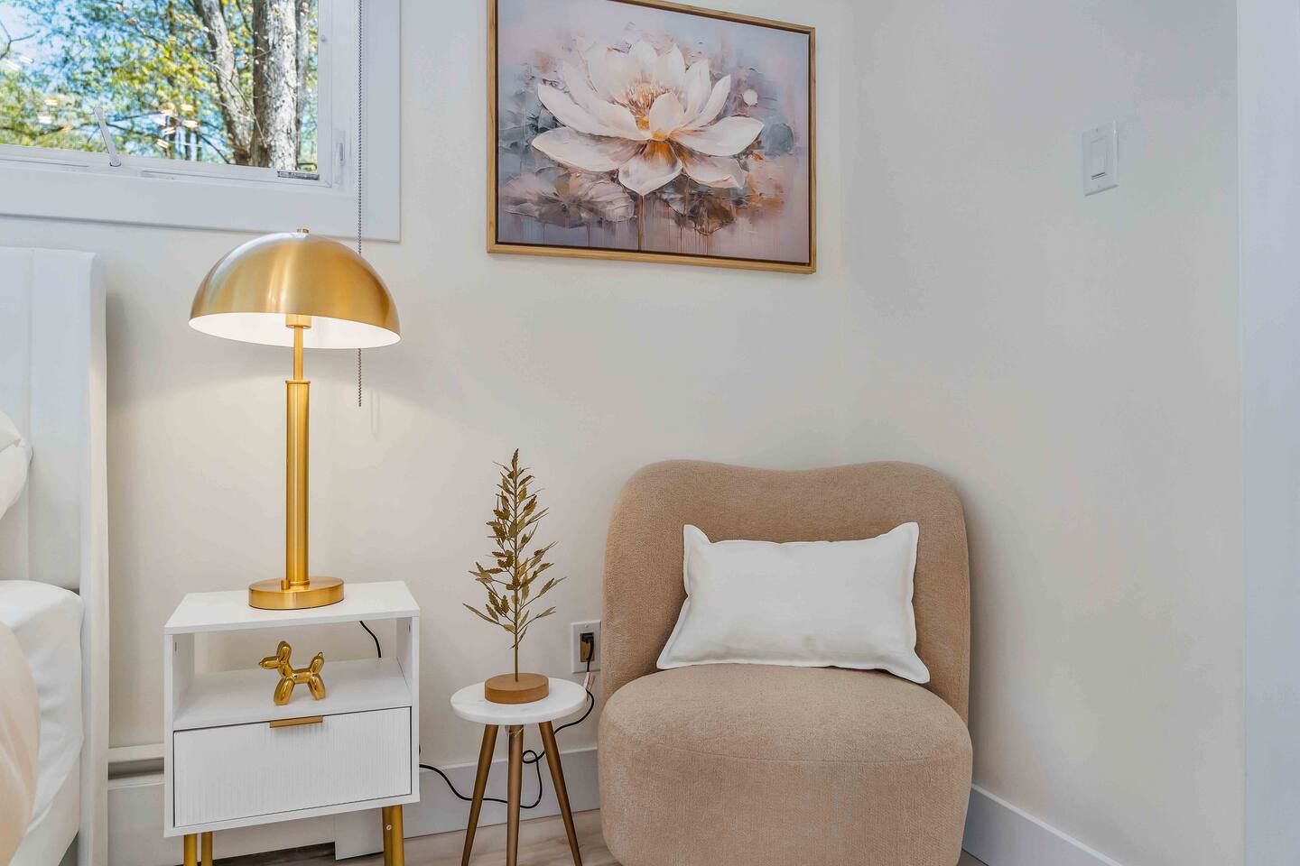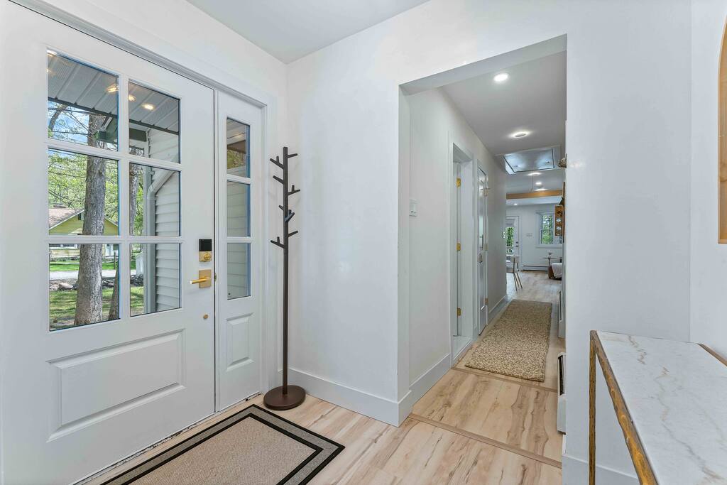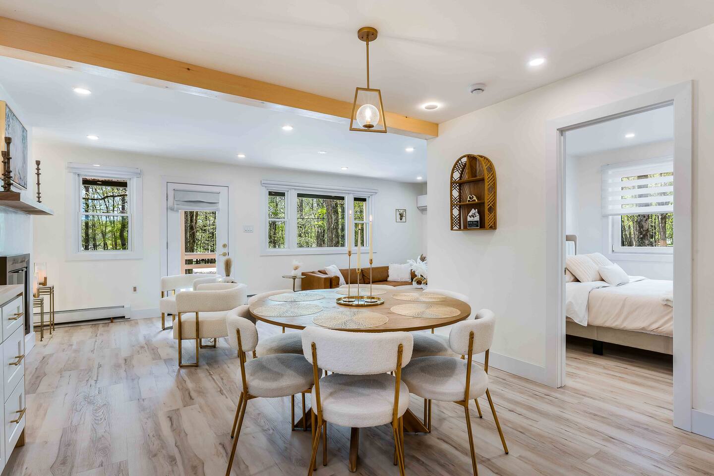 INSIDE: Enter through the main side entrance from the private driveway and step into a bright, elegant interior with a cozy, all-white modern design. To the right, discover the spacious primary bedroom featuring a TV, ample closet space, and a private en-suite bathroom with a shower. To the left, a hallway leads you to a full bathroom with a beautiful freestanding tub. Adjacent is the owner's locked closet. On the right side of the hall, you'll find two guest bedrooms—one with a full-size bed, the other with a queen-size bed, both with closet space. At the end of the hall, the space opens into a welcoming open-concept kitchen, dining, and living area. The fully equipped kitchen includes a washer and dryer, and the dining area seats six around a round table. The living room features a comfortable couch, smart TV, and cozy chairs facing a gas fireplace. Step through to the front porch with a small outdoor couch and coffee table, offering a serene partial lake view framed by trees. BACKYARD: The beautifully designed backyard is also accessible through the sliding door in the primary bedroom. Relax in style with outdoor furniture surrounding a pellet stove, a gas BBQ, and an outdoor TV. Unwind in the wood-burning hot tub or the private wood-burning sauna. Enjoy evenings by the firepit, surrounded by stylish benches and a charming swing set. An outdoor dining table completes this peaceful retreat. GARAGE/GAME ROOM: Step into the ultimate entertainment space. The garage-turned-game-room features a pool table, pellet stove, and movie theater setup. In the far corner, enjoy a bar area. The room also includes board games, little fridge a karaoke machine, dart board, and cornhole boards—perfect for fun-filled nights with friends or family.