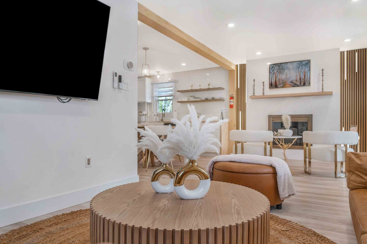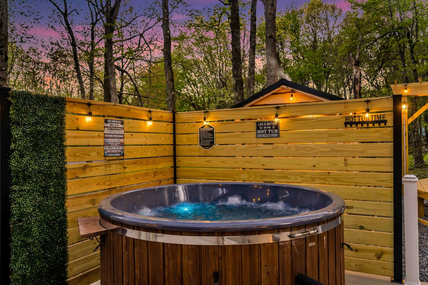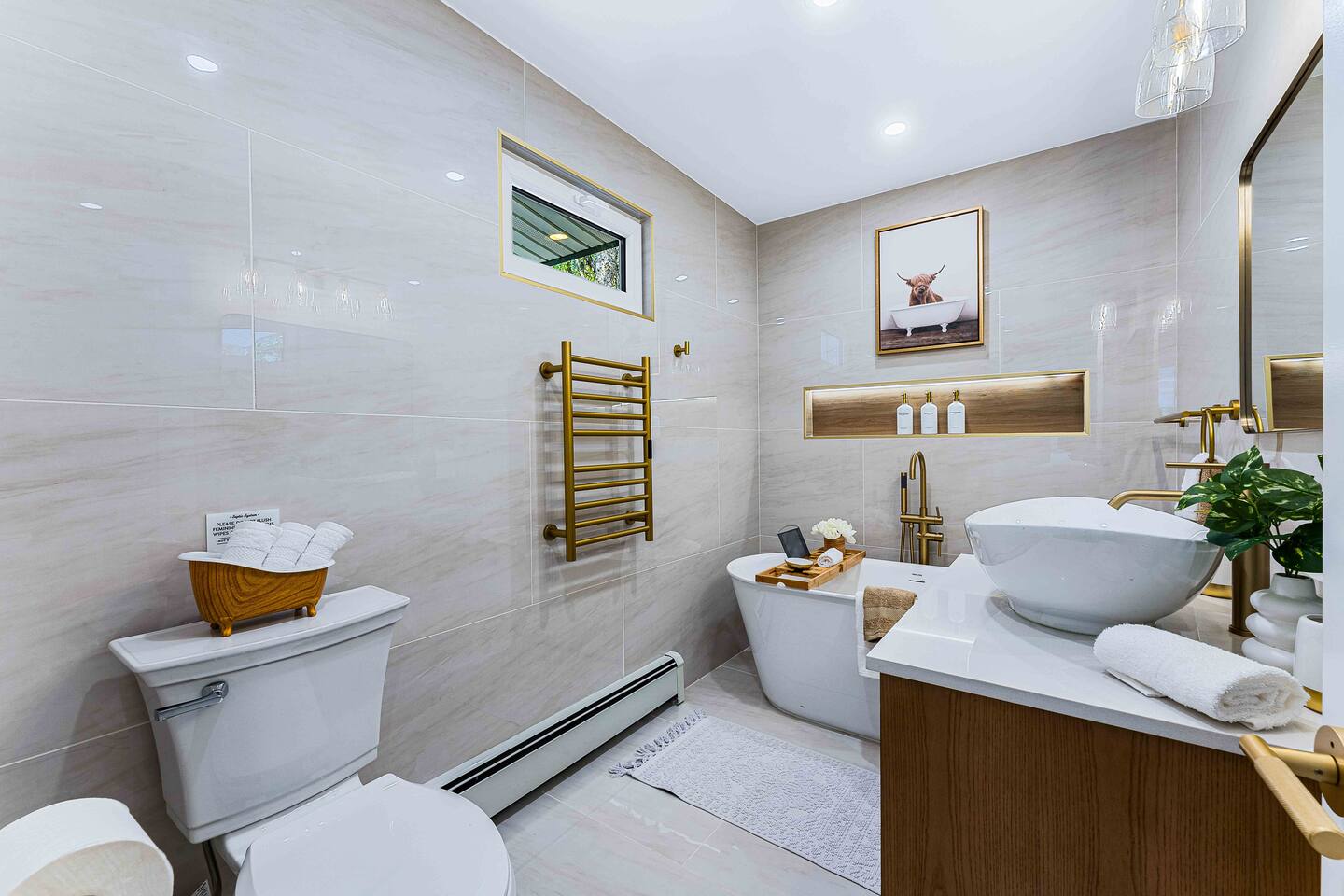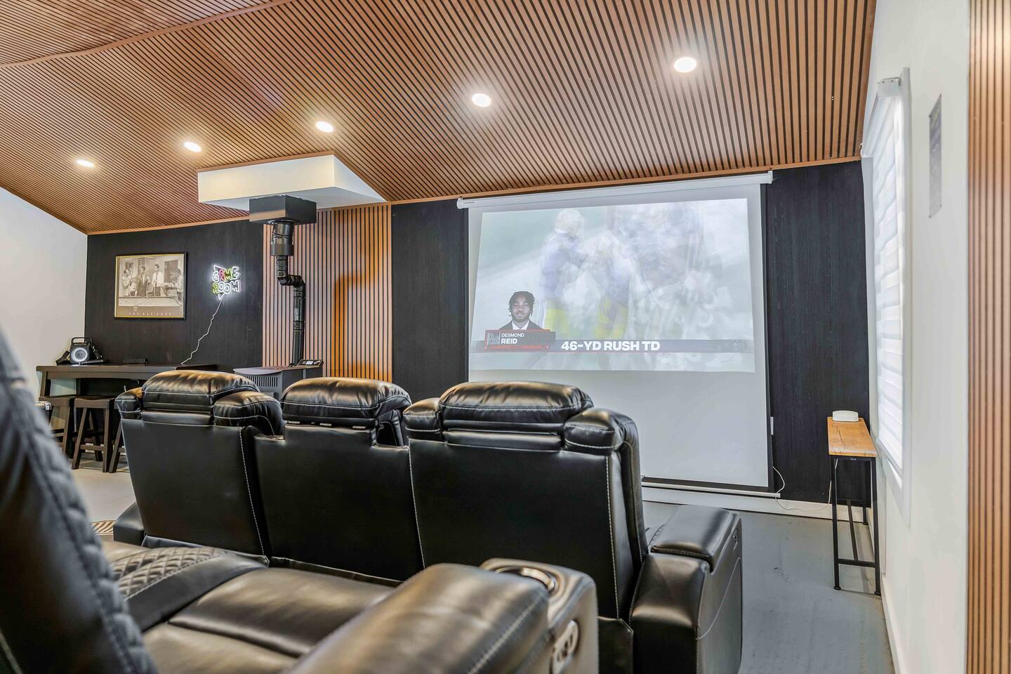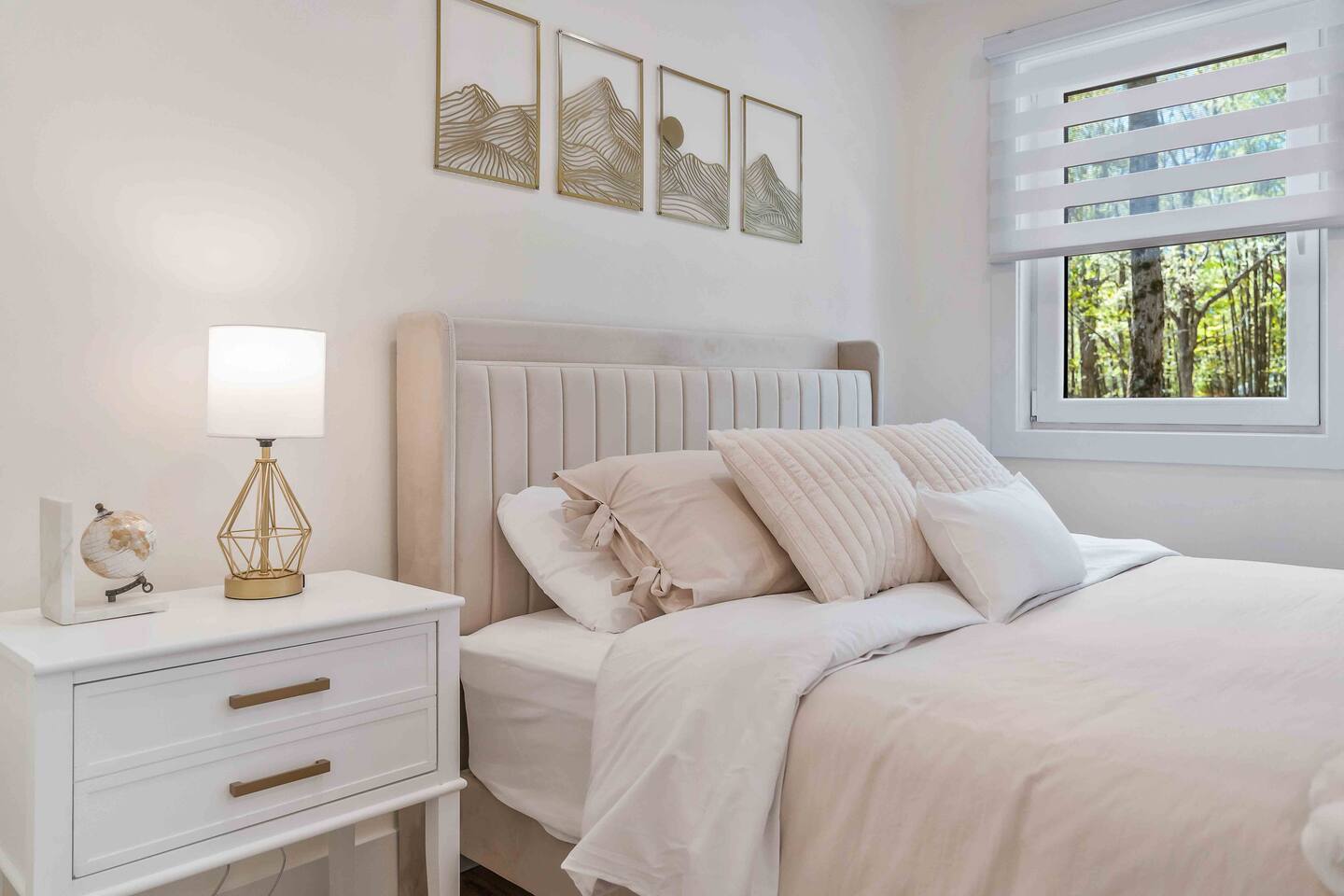 INSIDE: Enter through the main side entrance from the private driveway and step into a bright, elegant interior with a cozy, all-white modern design. To the right, discover the spacious primary bedroom featuring a TV, ample closet space, and a private en-suite bathroom with a shower. To the left, a hallway leads you to a full bathroom with a beautiful freestanding tub. Adjacent is the owner's locked closet. On the right side of the hall, you'll find two guest bedrooms—one with a full-size bed, the other with a queen-size bed, both with closet space. At the end of the hall, the space opens into a welcoming open-concept kitchen, dining, and living area. The fully equipped kitchen includes a washer and dryer, and the dining area seats six around a round table. The living room features a comfortable couch, smart TV, and cozy chairs facing a gas fireplace. Step through to the front porch with a small outdoor couch and coffee table, offering a serene partial lake view framed by trees. BACKYARD: The beautifully designed backyard is also accessible through the sliding door in the primary bedroom. Relax in style with outdoor furniture surrounding a pellet stove, a gas BBQ, and an outdoor TV. Unwind in the wood-burning hot tub or the private wood-burning sauna. Enjoy evenings by the firepit, surrounded by stylish benches and a charming swing set. An outdoor dining table completes this peaceful retreat. GARAGE/GAME ROOM: Step into the ultimate entertainment space. The garage-turned-game-room features a pool table, pellet stove, and movie theater setup. In the far corner, enjoy a bar area. The room also includes board games, little fridge a karaoke machine, dart board, and cornhole boards—perfect for fun-filled nights with friends or family.