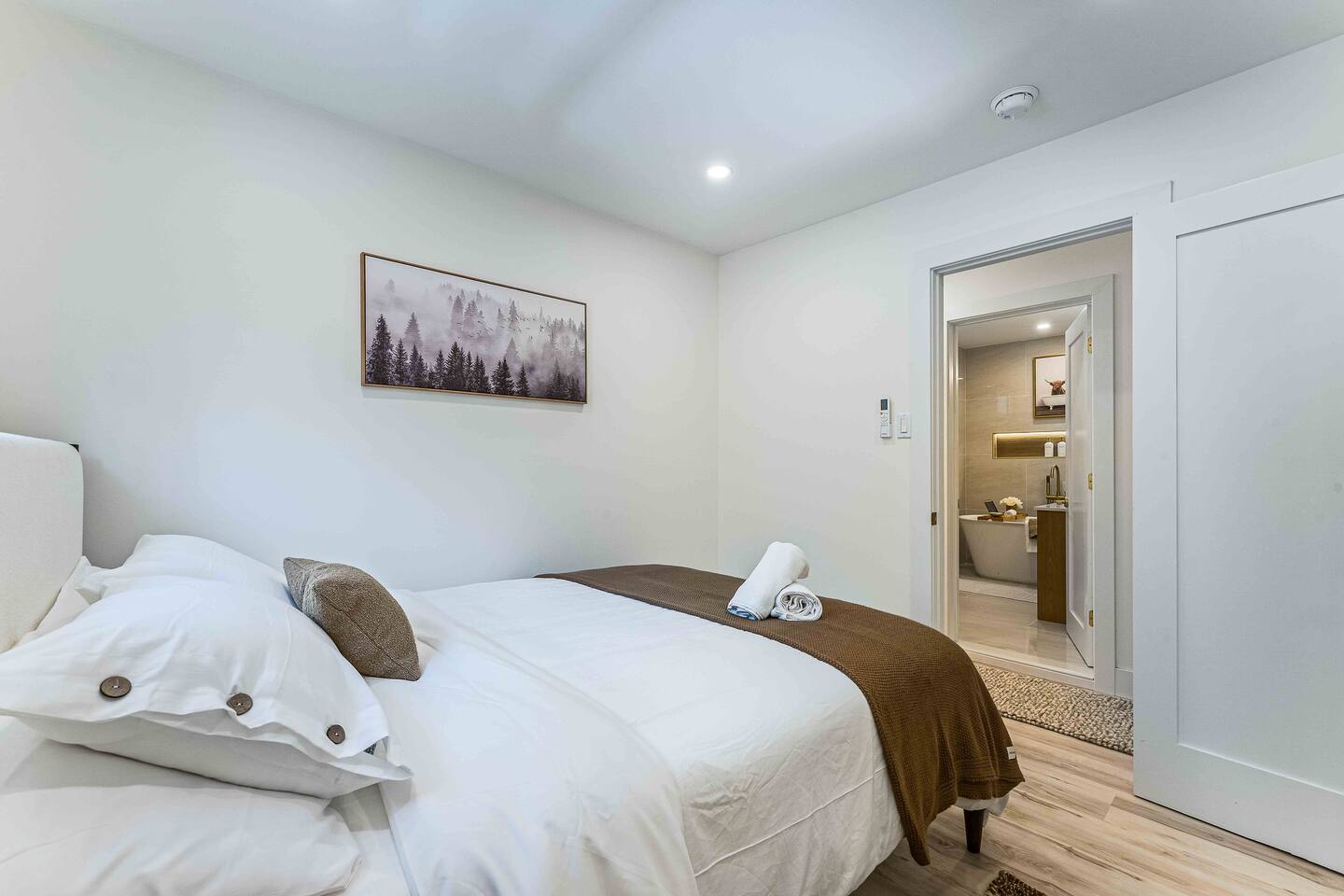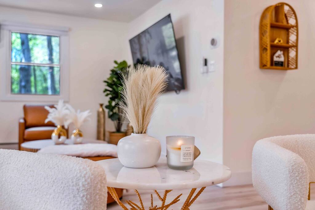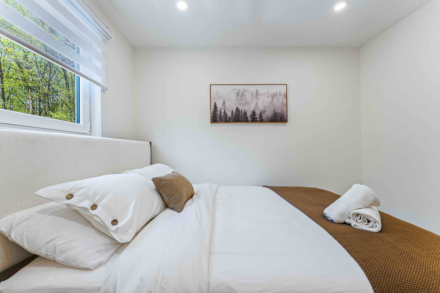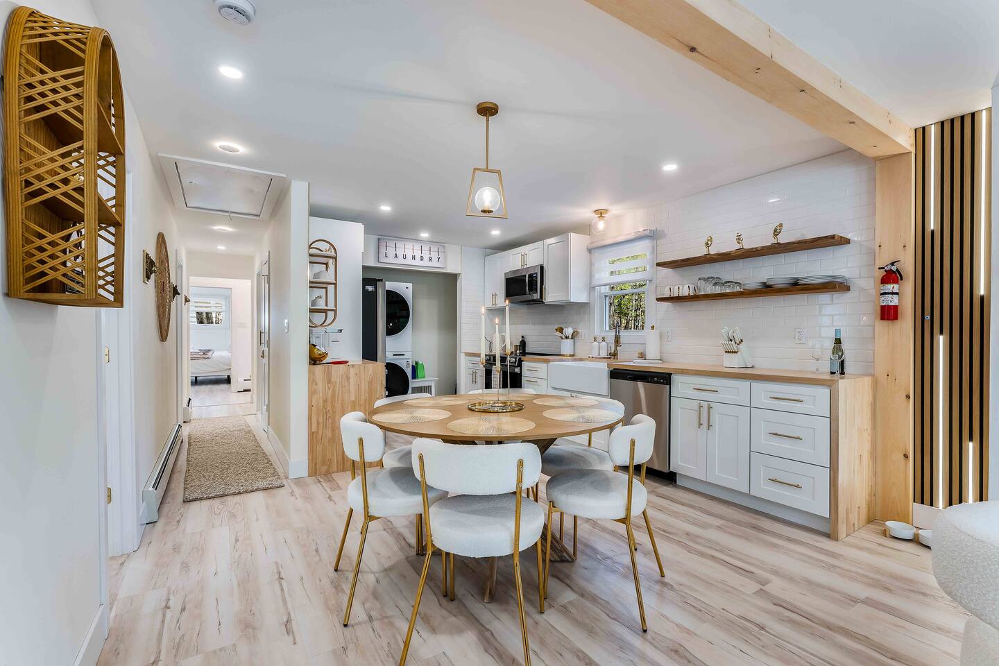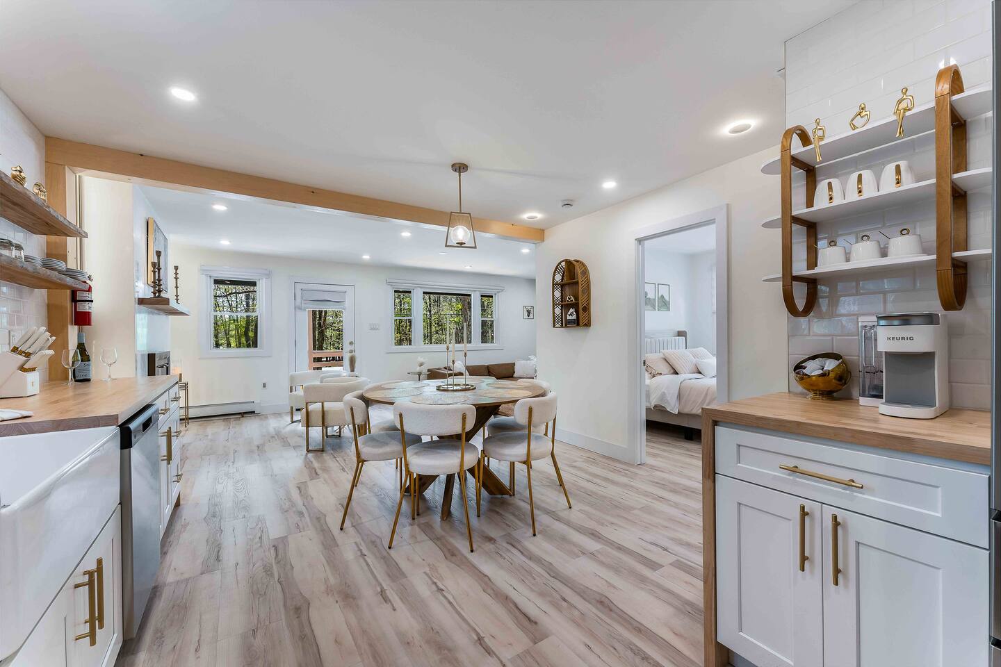 INSIDE: Enter through the main side entrance from the private driveway and step into a bright, elegant interior with a cozy, all-white modern design. To the right, discover the spacious primary bedroom featuring a TV, ample closet space, and a private en-suite bathroom with a shower. To the left, a hallway leads you to a full bathroom with a beautiful freestanding tub. Adjacent is the owner's locked closet. On the right side of the hall, you'll find two guest bedrooms—one with a full-size bed, the other with a queen-size bed, both with closet space. At the end of the hall, the space opens into a welcoming open-concept kitchen, dining, and living area. The fully equipped kitchen includes a washer and dryer, and the dining area seats six around a round table. The living room features a comfortable couch, smart TV, and cozy chairs facing a gas fireplace. Step through to the front porch with a small outdoor couch and coffee table, offering a serene partial lake view framed by trees. BACKYARD: The beautifully designed backyard is also accessible through the sliding door in the primary bedroom. Relax in style with outdoor furniture surrounding a pellet stove, a gas BBQ, and an outdoor TV. Unwind in the wood-burning hot tub or the private wood-burning sauna. Enjoy evenings by the firepit, surrounded by stylish benches and a charming swing set. An outdoor dining table completes this peaceful retreat. GARAGE/GAME ROOM: Step into the ultimate entertainment space. The garage-turned-game-room features a pool table, pellet stove, and movie theater setup. In the far corner, enjoy a bar area. The room also includes board games, little fridge a karaoke machine, dart board, and cornhole boards—perfect for fun-filled nights with friends or family.