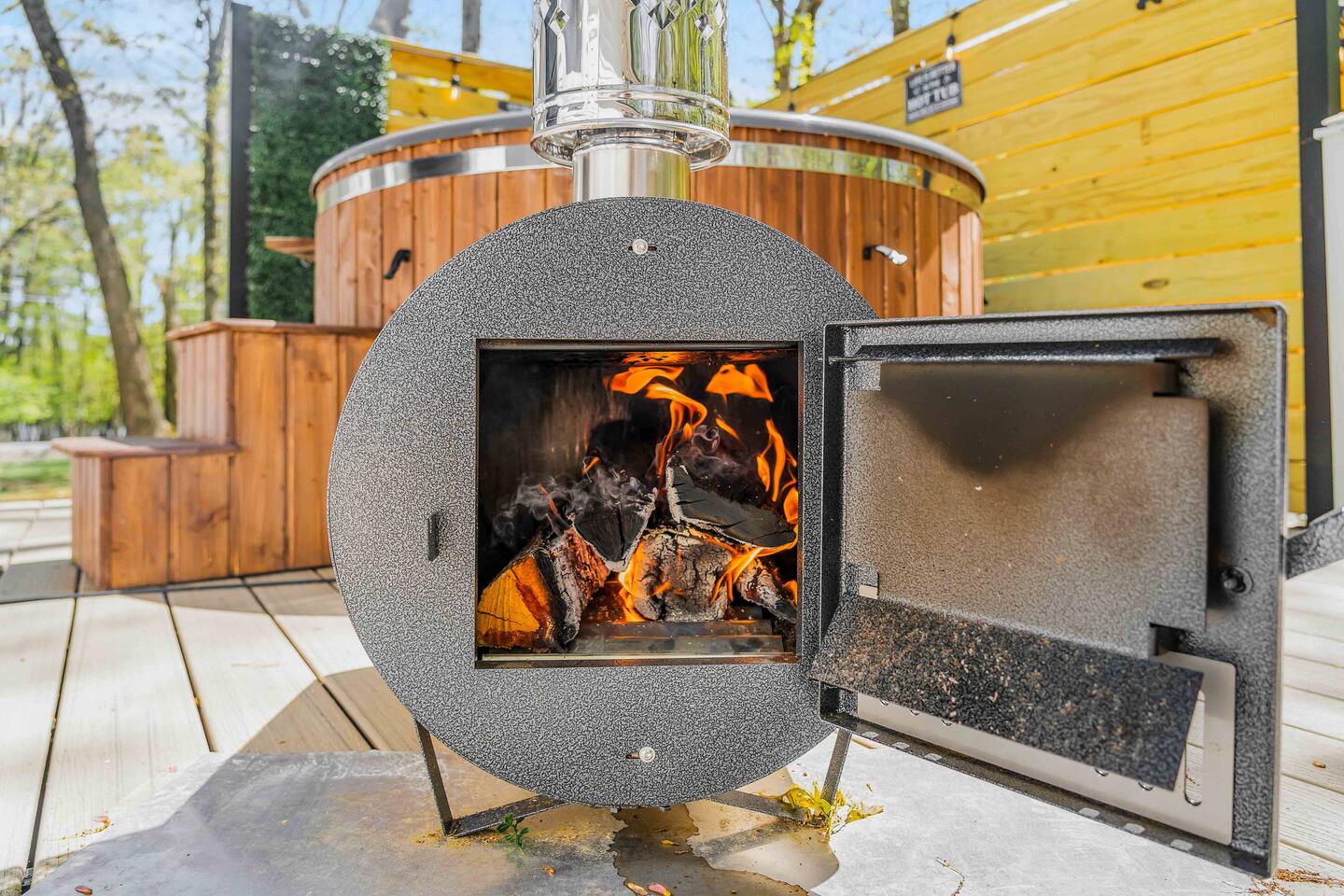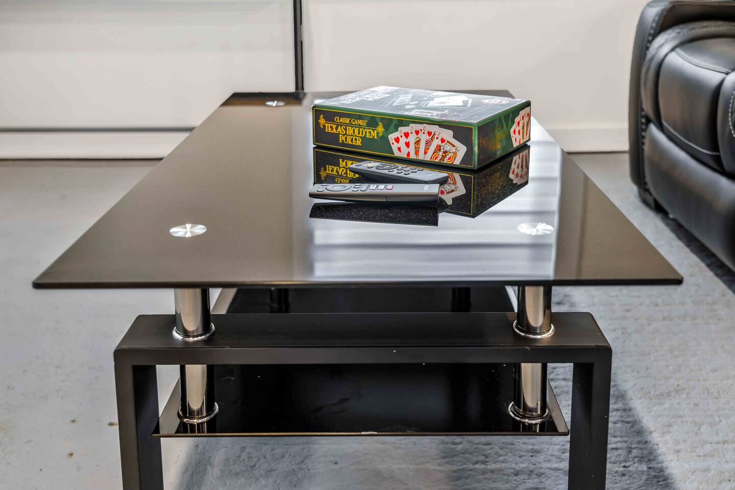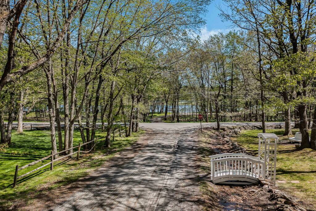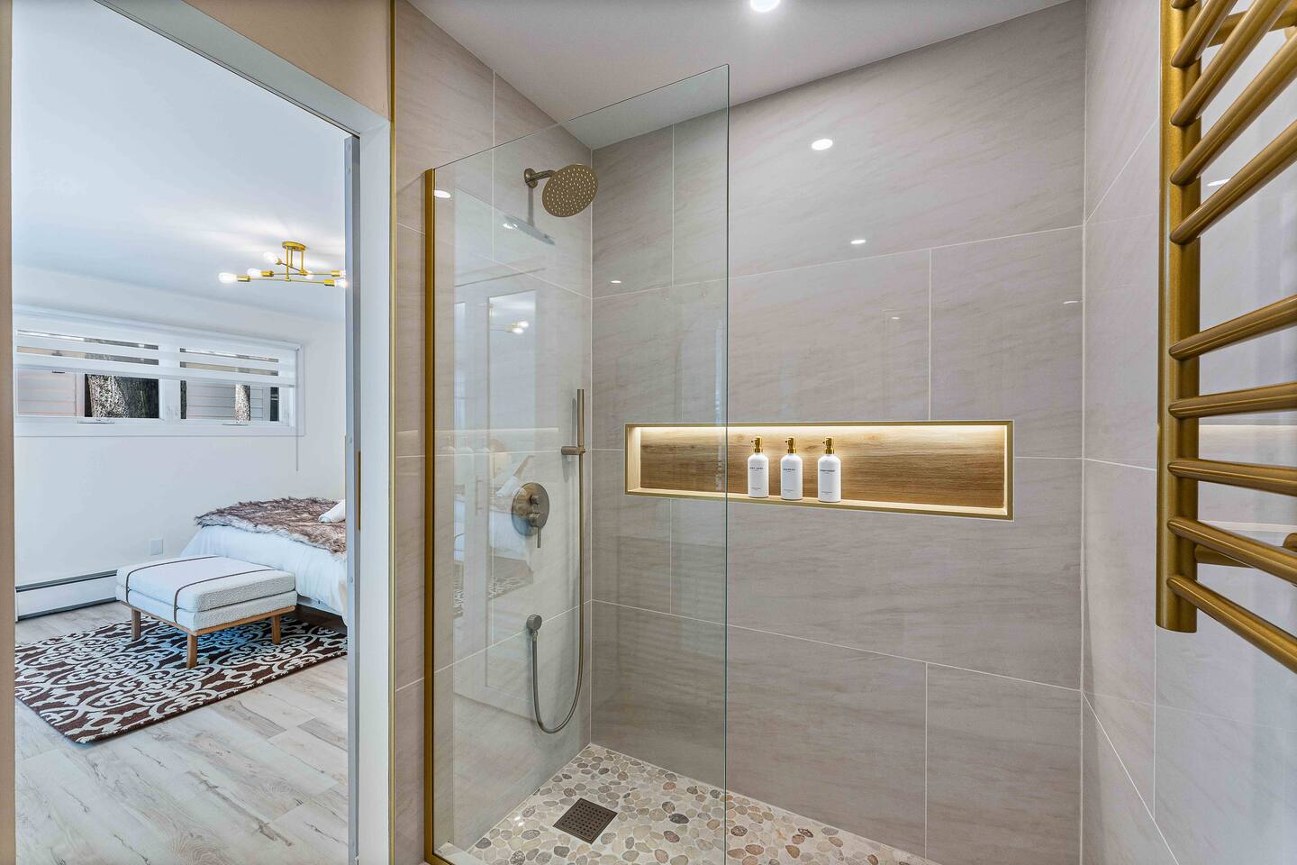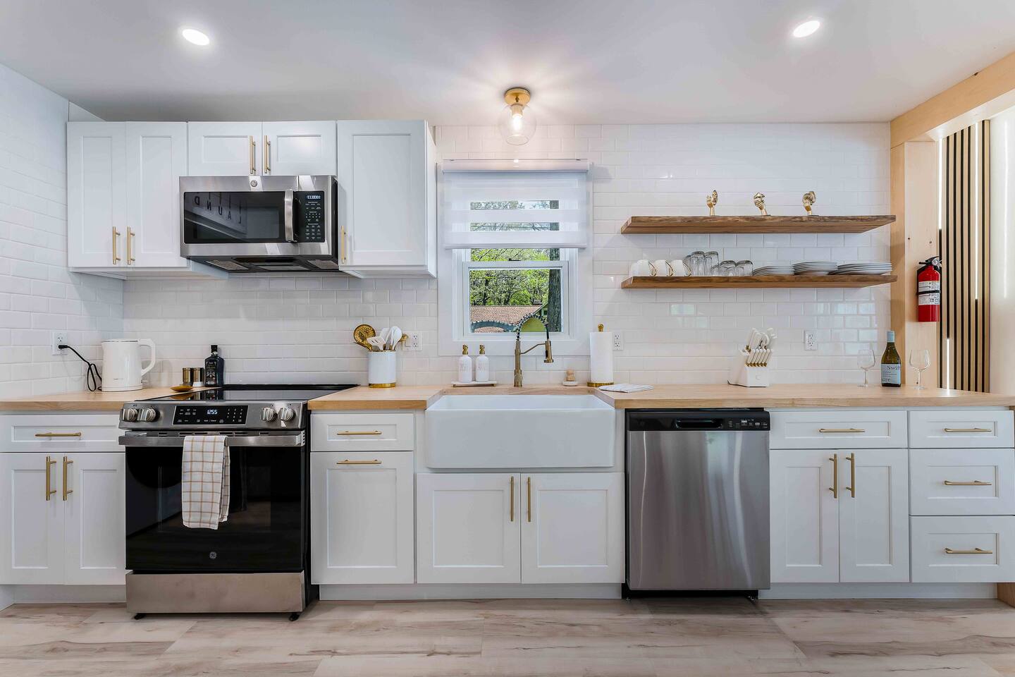 INSIDE: Enter through the main side entrance from the private driveway and step into a bright, elegant interior with a cozy, all-white modern design. To the right, discover the spacious primary bedroom featuring a TV, ample closet space, and a private en-suite bathroom with a shower. To the left, a hallway leads you to a full bathroom with a beautiful freestanding tub. Adjacent is the owner's locked closet. On the right side of the hall, you'll find two guest bedrooms—one with a full-size bed, the other with a queen-size bed, both with closet space. At the end of the hall, the space opens into a welcoming open-concept kitchen, dining, and living area. The fully equipped kitchen includes a washer and dryer, and the dining area seats six around a round table. The living room features a comfortable couch, smart TV, and cozy chairs facing a gas fireplace. Step through to the front porch with a small outdoor couch and coffee table, offering a serene partial lake view framed by trees. BACKYARD: The beautifully designed backyard is also accessible through the sliding door in the primary bedroom. Relax in style with outdoor furniture surrounding a pellet stove, a gas BBQ, and an outdoor TV. Unwind in the wood-burning hot tub or the private wood-burning sauna. Enjoy evenings by the firepit, surrounded by stylish benches and a charming swing set. An outdoor dining table completes this peaceful retreat. GARAGE/GAME ROOM: Step into the ultimate entertainment space. The garage-turned-game-room features a pool table, pellet stove, and movie theater setup. In the far corner, enjoy a bar area. The room also includes board games, little fridge a karaoke machine, dart board, and cornhole boards—perfect for fun-filled nights with friends or family.