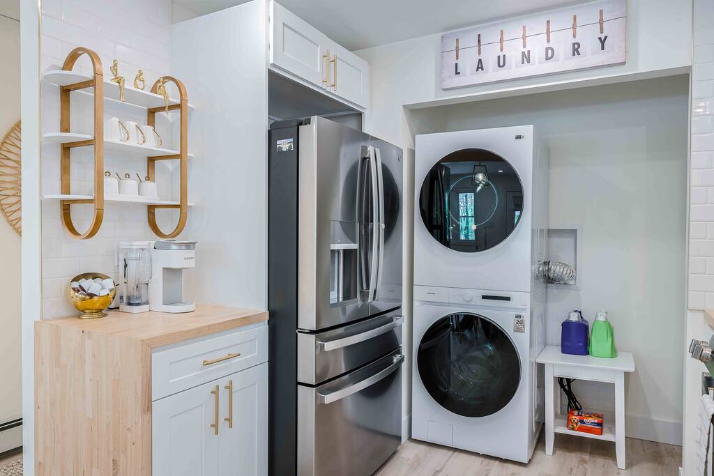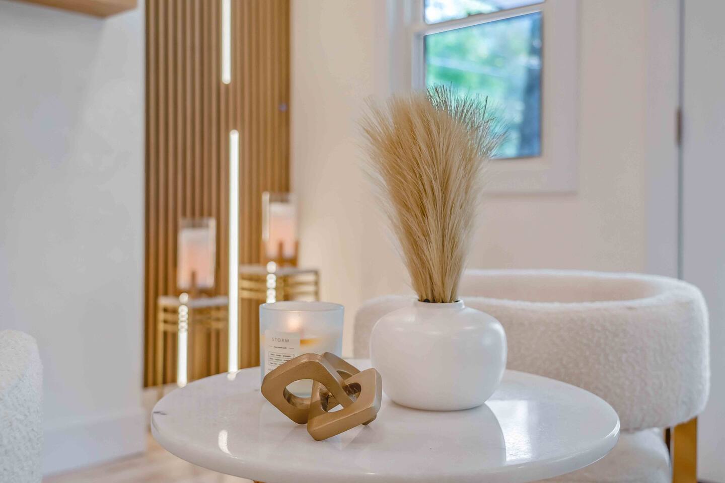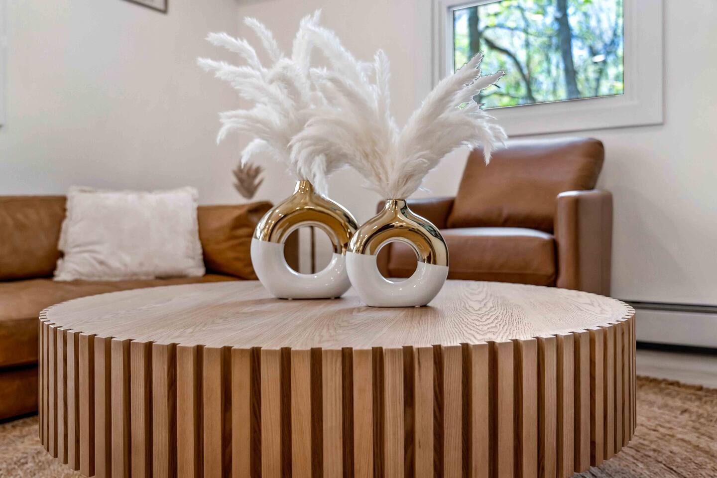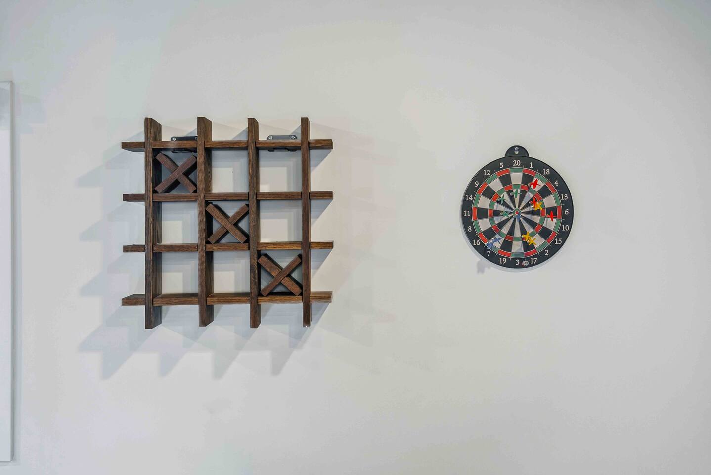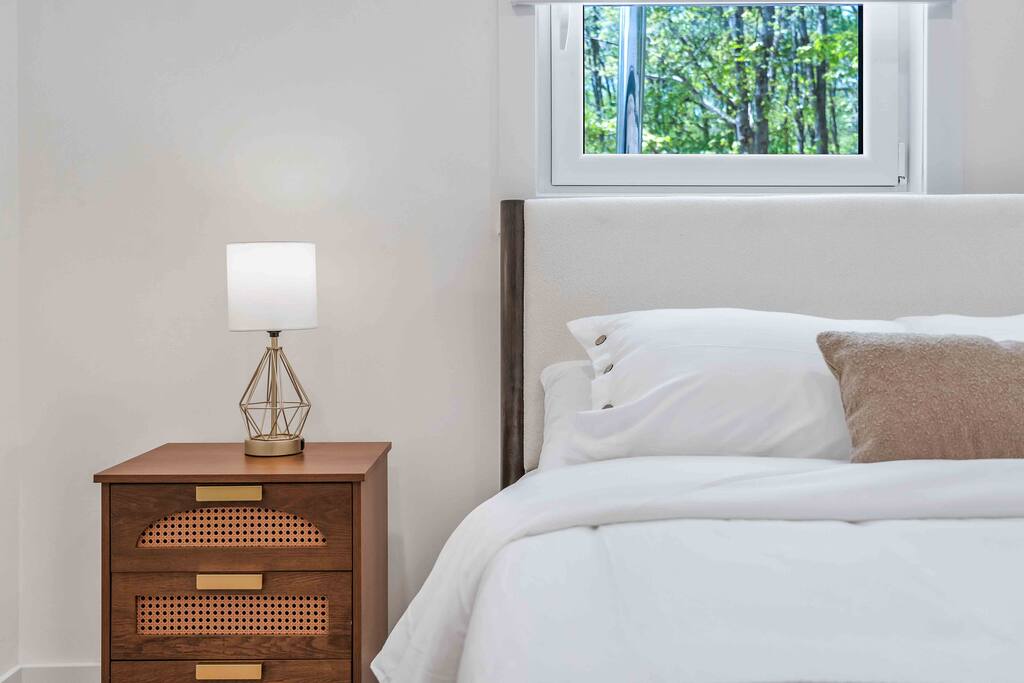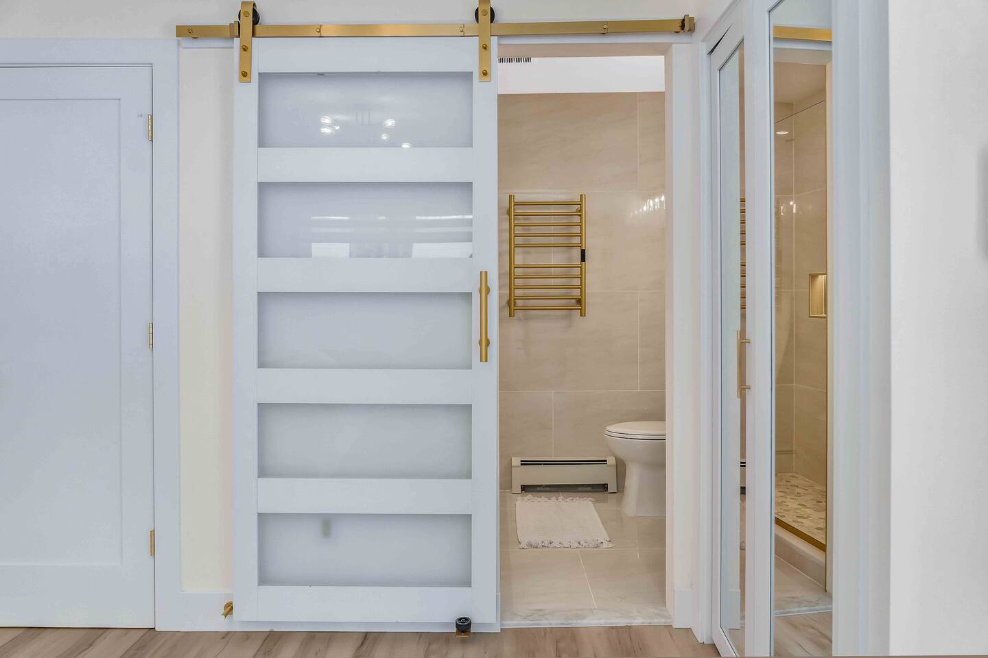 INSIDE: Enter through the main side entrance from the private driveway and step into a bright, elegant interior with a cozy, all-white modern design. To the right, discover the spacious primary bedroom featuring a TV, ample closet space, and a private en-suite bathroom with a shower. To the left, a hallway leads you to a full bathroom with a beautiful freestanding tub. Adjacent is the owner's locked closet. On the right side of the hall, you'll find two guest bedrooms—one with a full-size bed, the other with a queen-size bed, both with closet space. At the end of the hall, the space opens into a welcoming open-concept kitchen, dining, and living area. The fully equipped kitchen includes a washer and dryer, and the dining area seats six around a round table. The living room features a comfortable couch, smart TV, and cozy chairs facing a gas fireplace. Step through to the front porch with a small outdoor couch and coffee table, offering a serene partial lake view framed by trees. BACKYARD: The beautifully designed backyard is also accessible through the sliding door in the primary bedroom. Relax in style with outdoor furniture surrounding a pellet stove, a gas BBQ, and an outdoor TV. Unwind in the wood-burning hot tub or the private wood-burning sauna. Enjoy evenings by the firepit, surrounded by stylish benches and a charming swing set. An outdoor dining table completes this peaceful retreat. GARAGE/GAME ROOM: Step into the ultimate entertainment space. The garage-turned-game-room features a pool table, pellet stove, and movie theater setup. In the far corner, enjoy a bar area. The room also includes board games, little fridge a karaoke machine, dart board, and cornhole boards—perfect for fun-filled nights with friends or family.