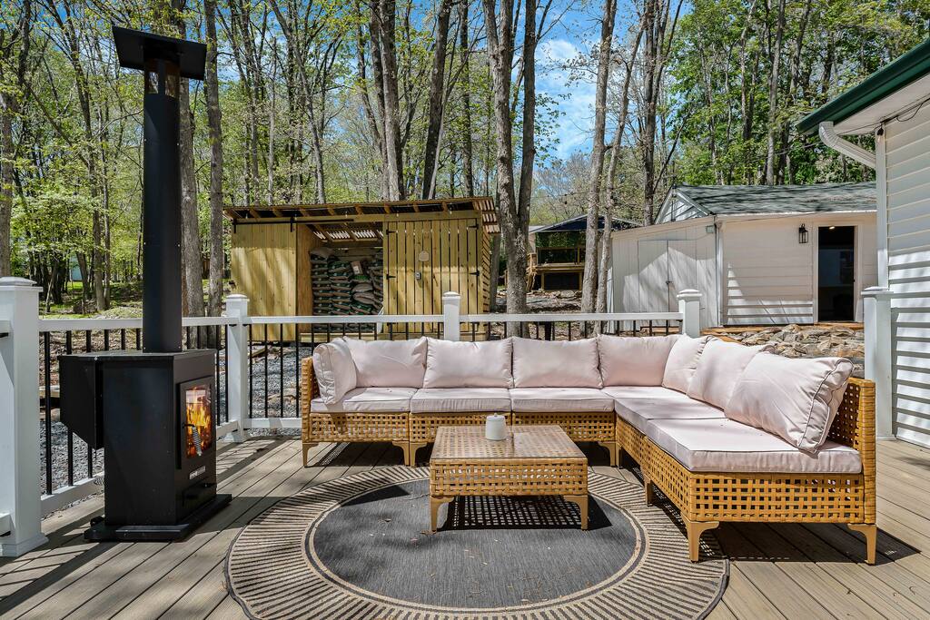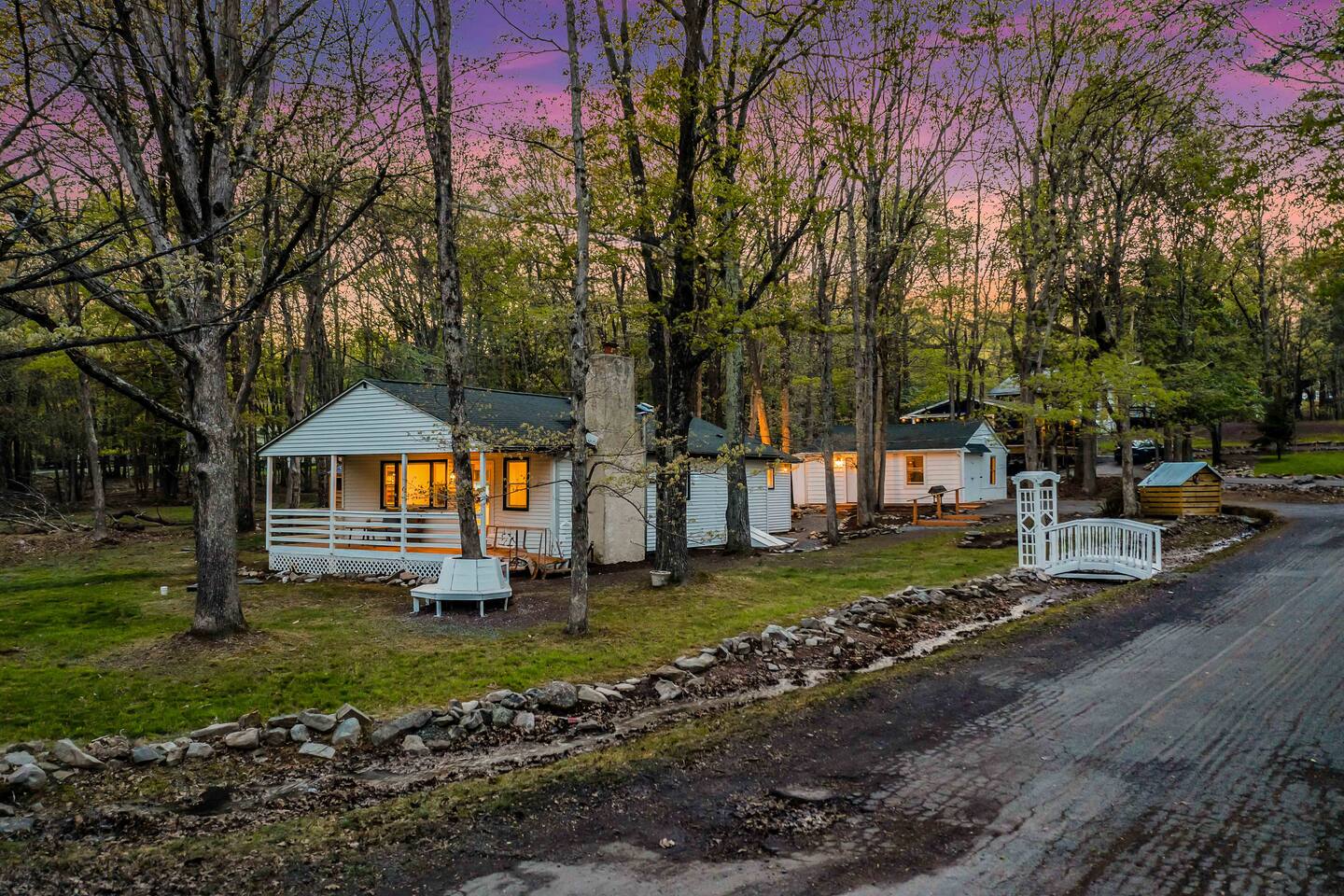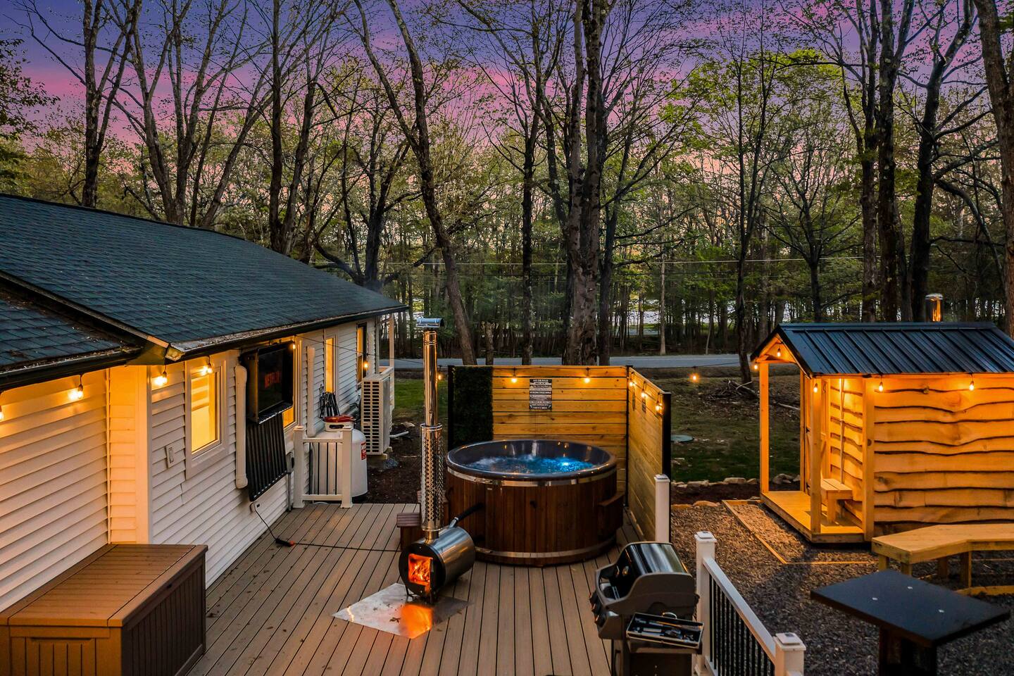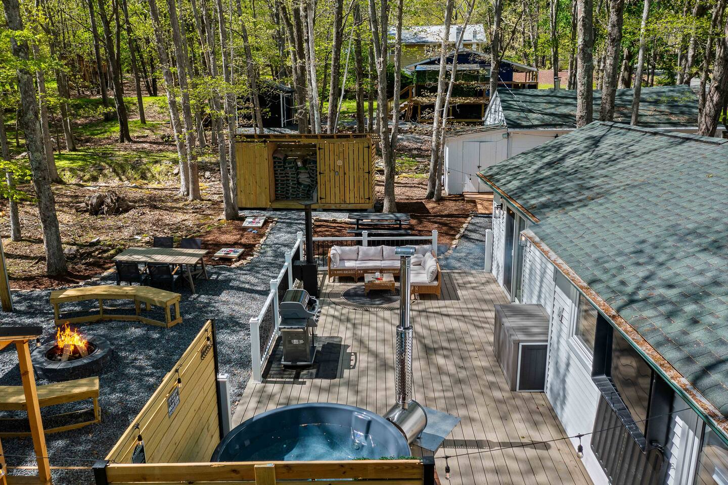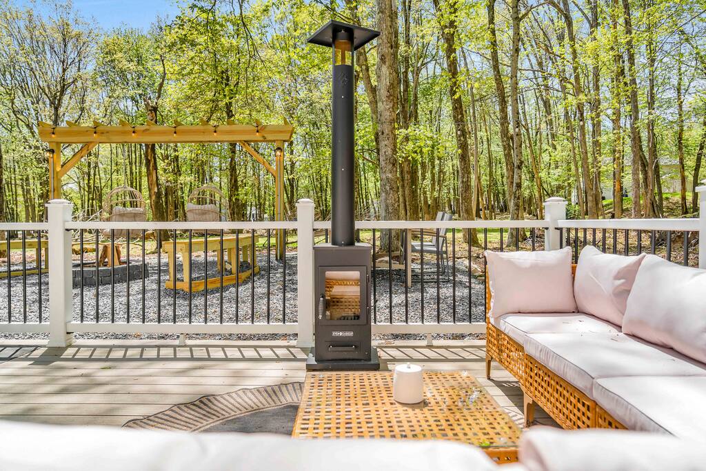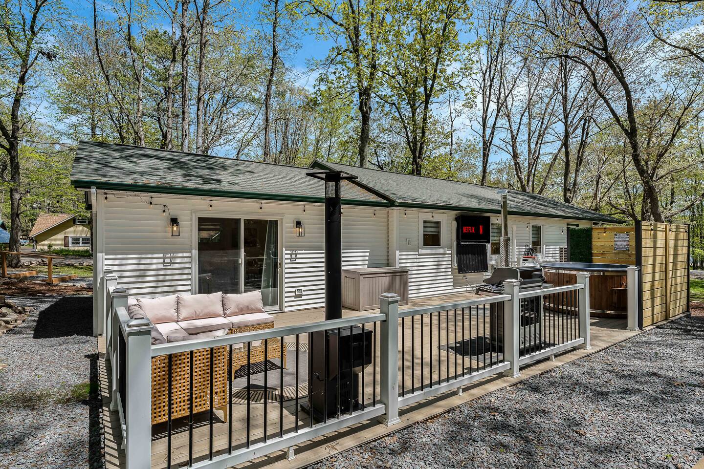 Cozy all-white modern design meets mountain charm at the White Cabin in the Poconos. Step into beautifully situated backyard with a wood-burning hot tub & sauna, firepit and outdoor pellet stove & Outdoor TV. Enjoy the Game Room with movie theater, pool table, pellet stove & Board Games & Karaoke Machine! Stylish interior with open concept kitchen-living room & gas fireplace. Enjoy coffee on the porch with a partial lake view. Located in community with 5 lakes, seasonal pools.