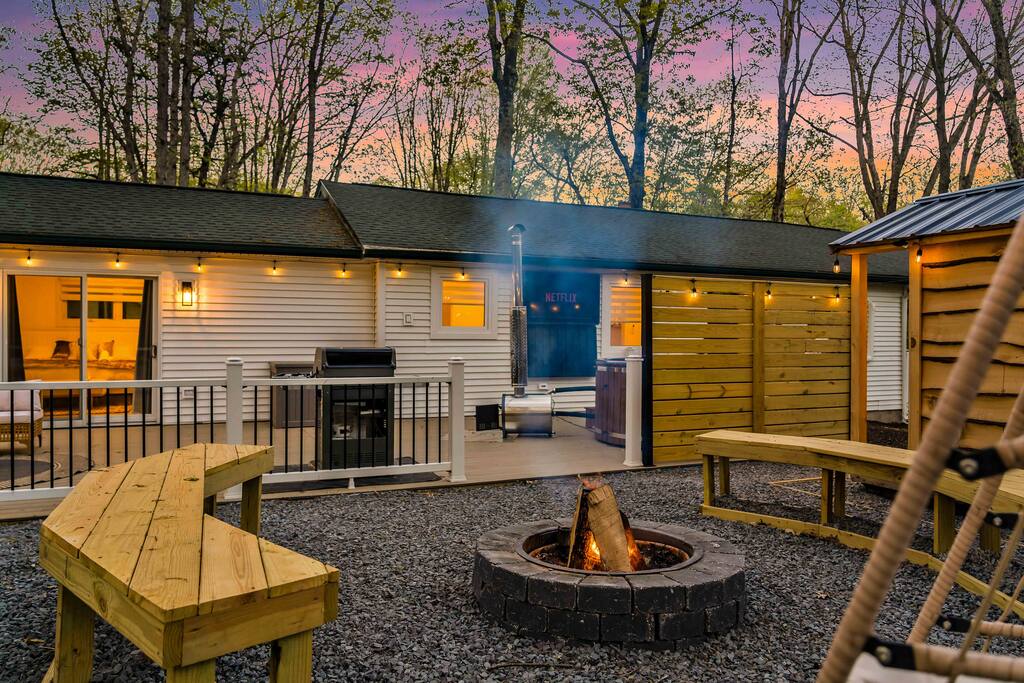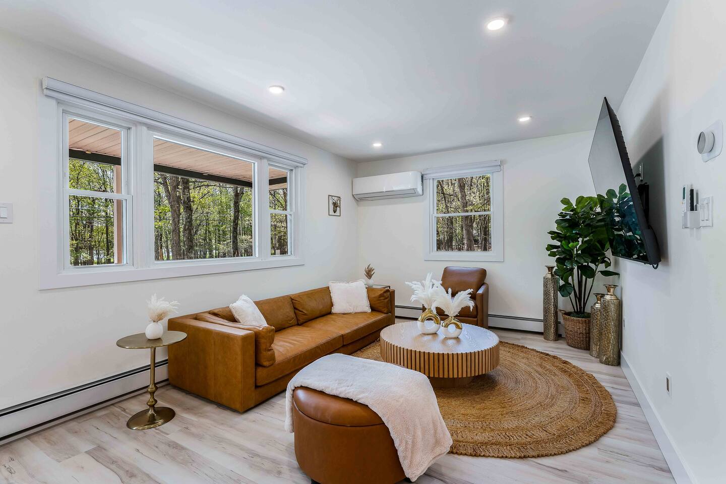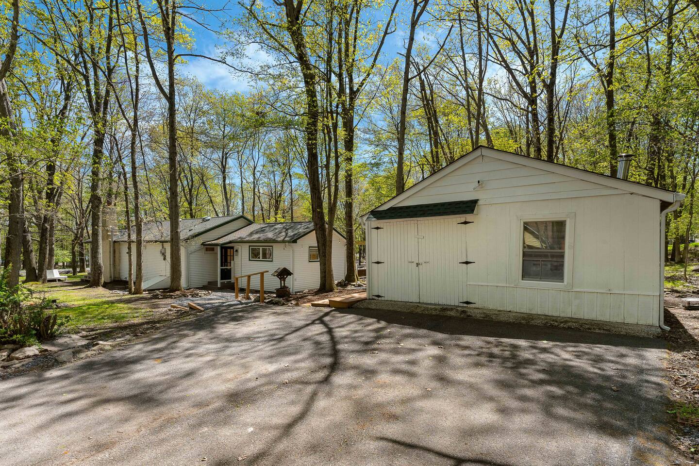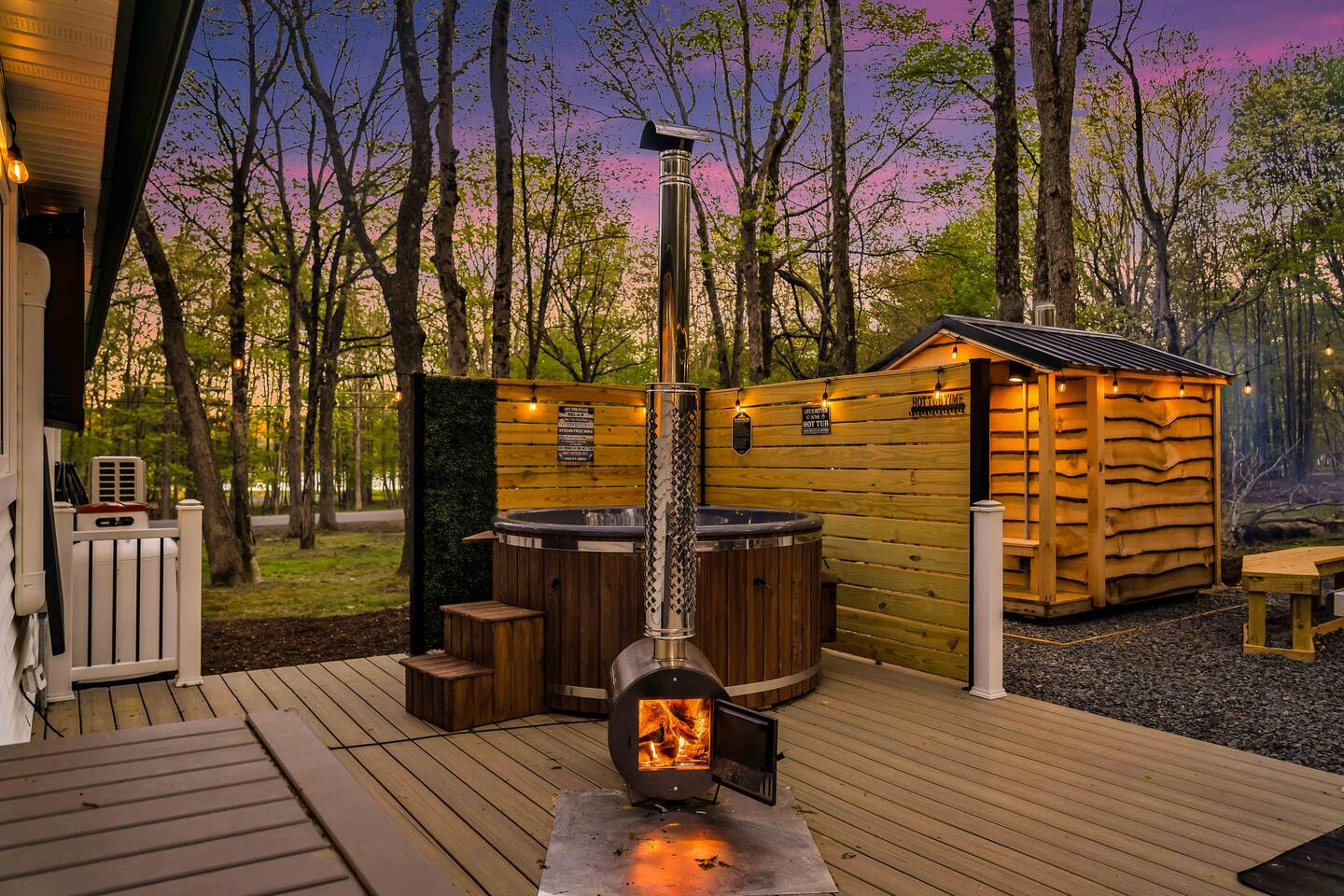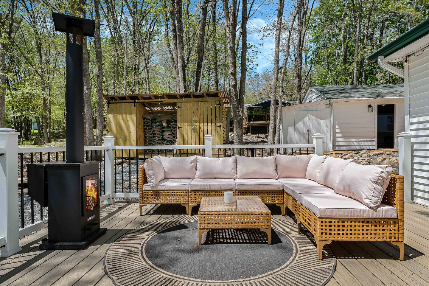 Cozy all-white modern design meets mountain charm at the White Cabin in the Poconos. Step into beautifully situated backyard with a wood-burning hot tub & sauna, firepit and outdoor pellet stove & Outdoor TV. Enjoy the Game Room with movie theater, pool table, pellet stove & Board Games & Karaoke Machine! Stylish interior with open concept kitchen-living room & gas fireplace. Enjoy coffee on the porch with a partial lake view. Located in community with 5 lakes, seasonal pools.