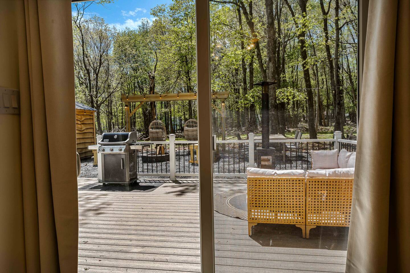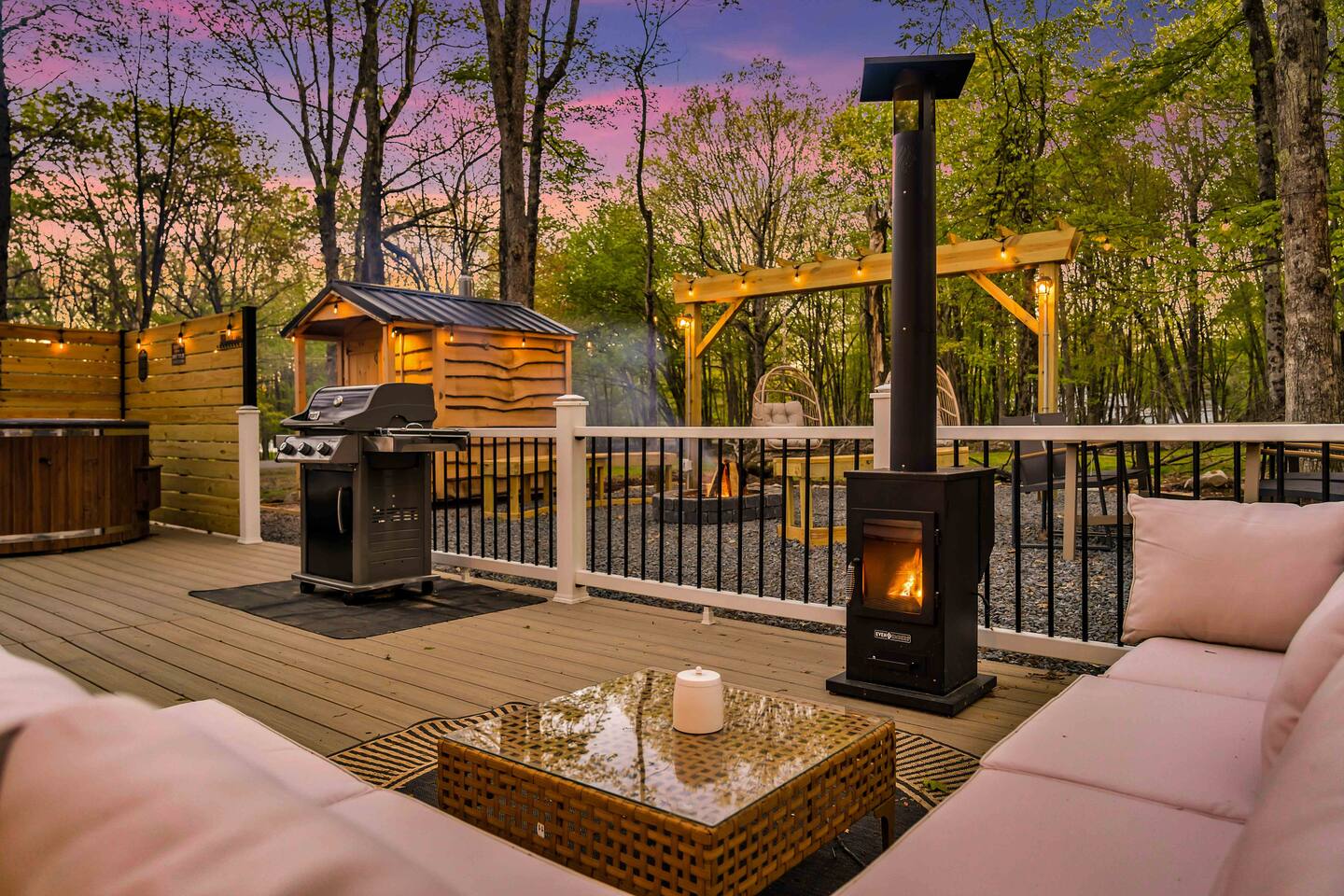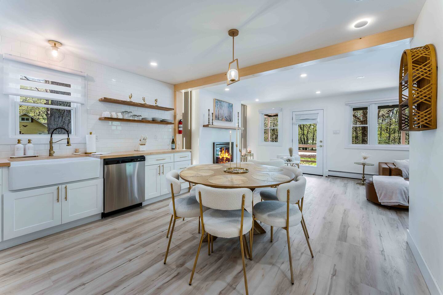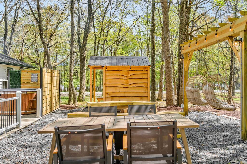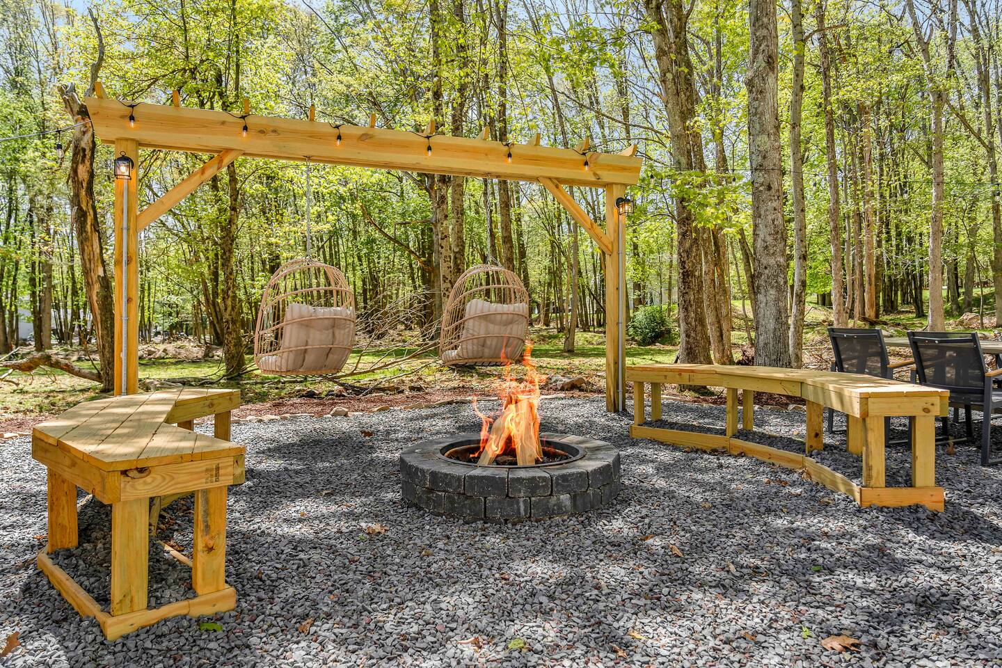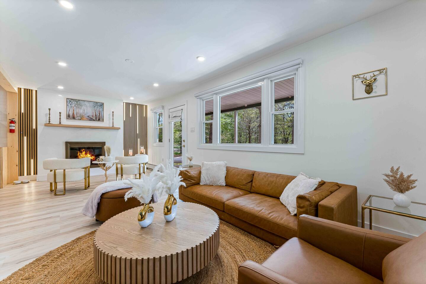 Cozy all-white modern design meets mountain charm at the White Cabin in the Poconos. Step into beautifully situated backyard with a wood-burning hot tub & sauna, firepit and outdoor pellet stove & Outdoor TV. Enjoy the Game Room with movie theater, pool table, pellet stove & Board Games & Karaoke Machine! Stylish interior with open concept kitchen-living room & gas fireplace. Enjoy coffee on the porch with a partial lake view. Located in community with 5 lakes, seasonal pools.